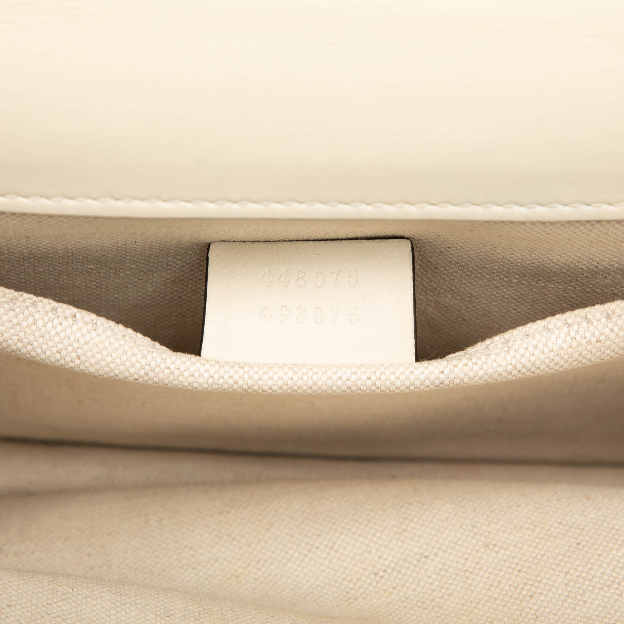 Product Details: White Gucci Medium Leather Bamboo Dionysus Web Satchel. The Dionysus satchel features a leather body, a bamboo top handle, a detachable flat strap, a front flap with a magnetic closure, and interior zip and slip pockets. 7.5" L x 10.4" W x 2.8" D, 3.5" drop. Serial number 448075 493075.