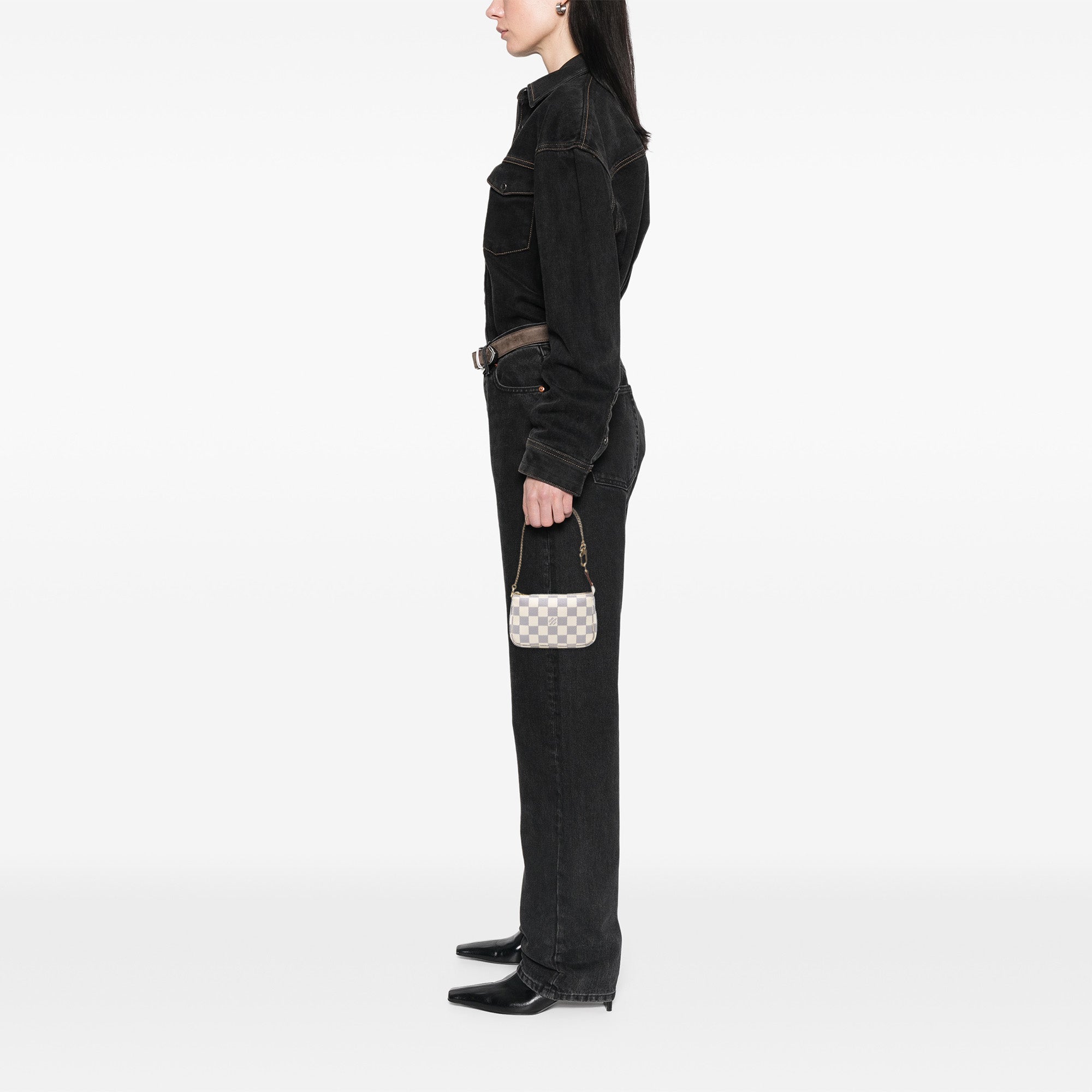 Product Details: White Louis Vuitton Damier Azur Mini Pochette Accessoires Handbag. The Mini Pochette Accessoires features a damier canvas, a detachable chain strap, and a top zip closure. 3.7" L x 5.7" W x 1" D, 6.7" drop.