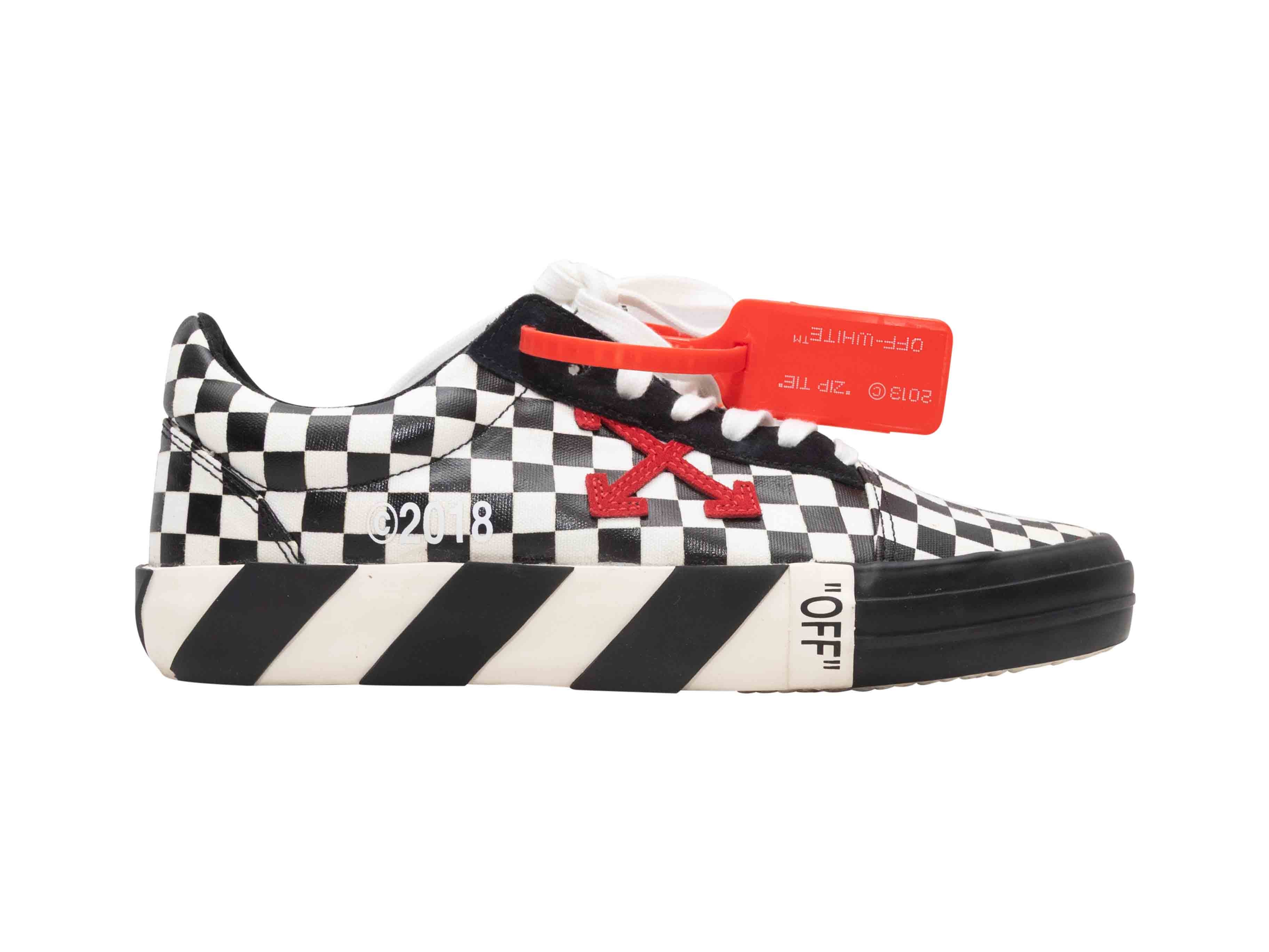 Product Details: Black and white checkerboard coated canvas low-top sneakers by Off-White. Rubber soles. Lace-up tie closures at tops. 1" platform height, 1" heel height.