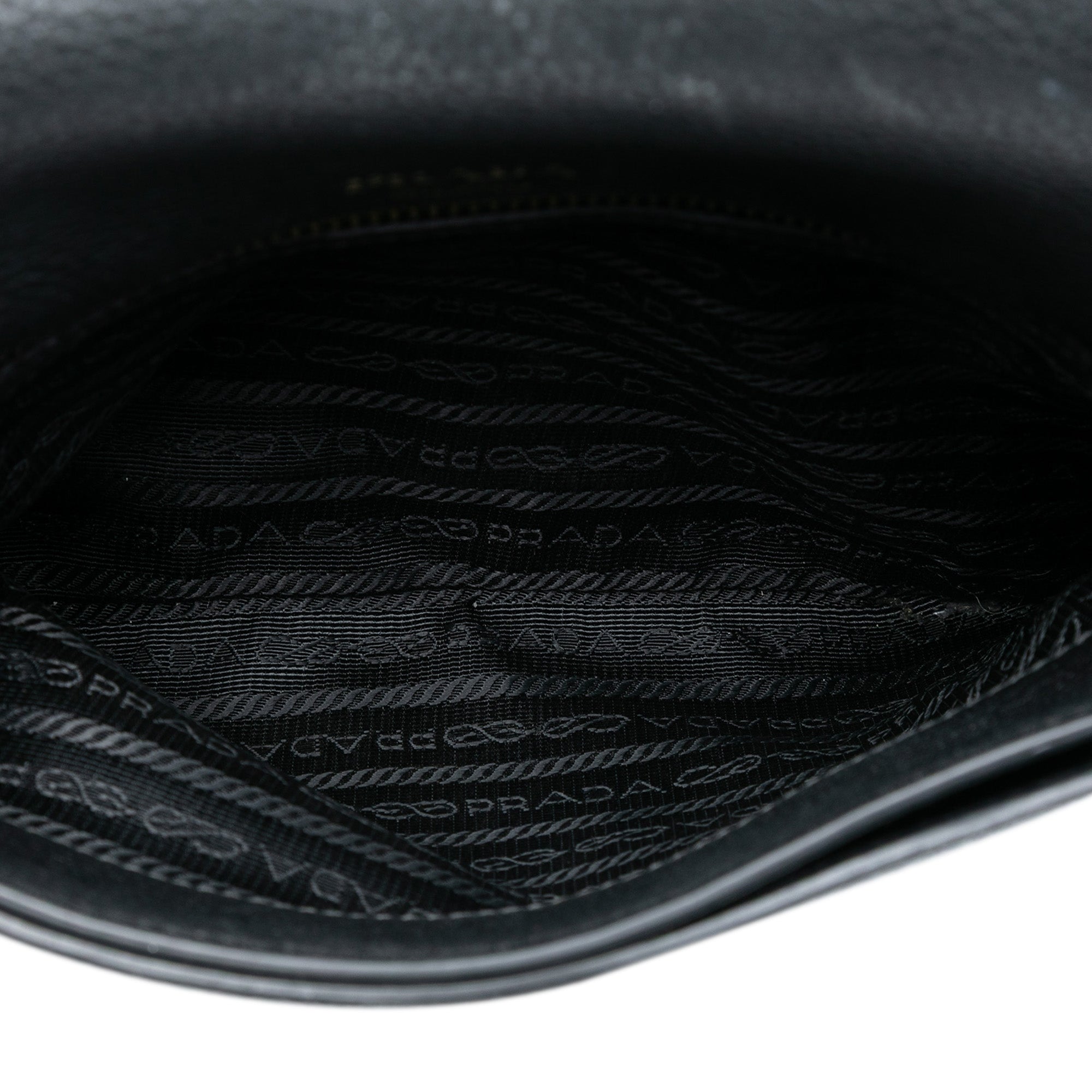Product Details: Black Prada Vitello Daino Flap Crossbody. This crossbody bag features a leather body, an adjustable flat leather strap, a top flap with a magnetic snap closure, and an exterior zip pocket. 6.3" L x 9.1" W x 1" D.