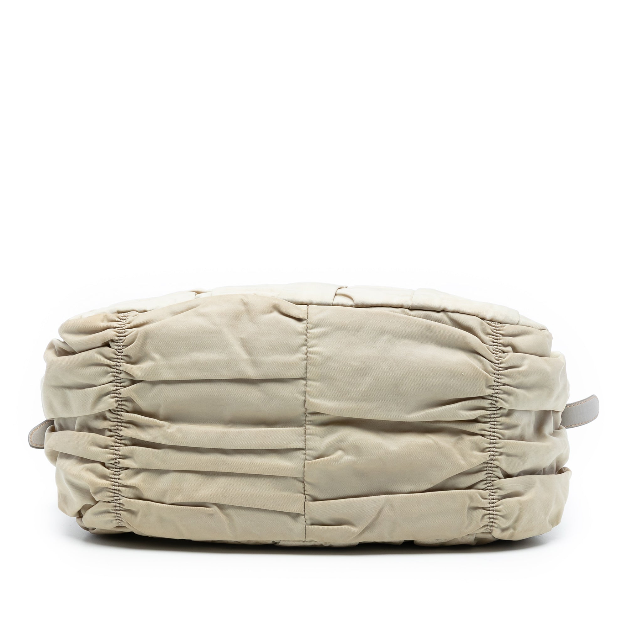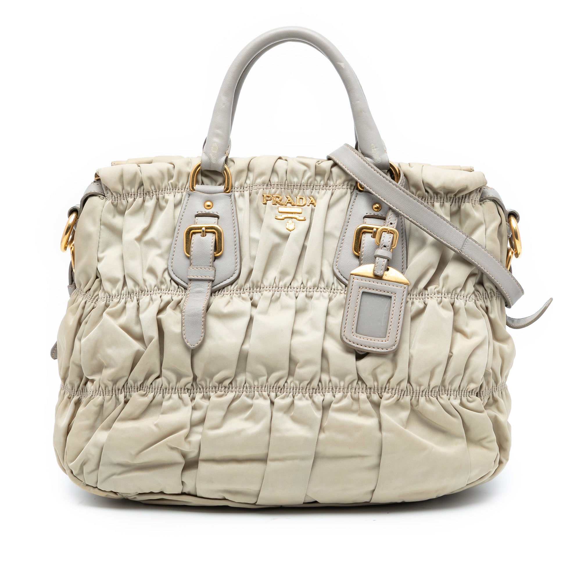 Product Details: Brown Prada Tessuto Gaufre Satchel. This satchel features a gathered nylon body, rolled leather handles, a detachable flat leather strap, a top zip closure and interior zip and slip pockets. 10.6" L x 13" W x 6.1" D, 3.5" drop.