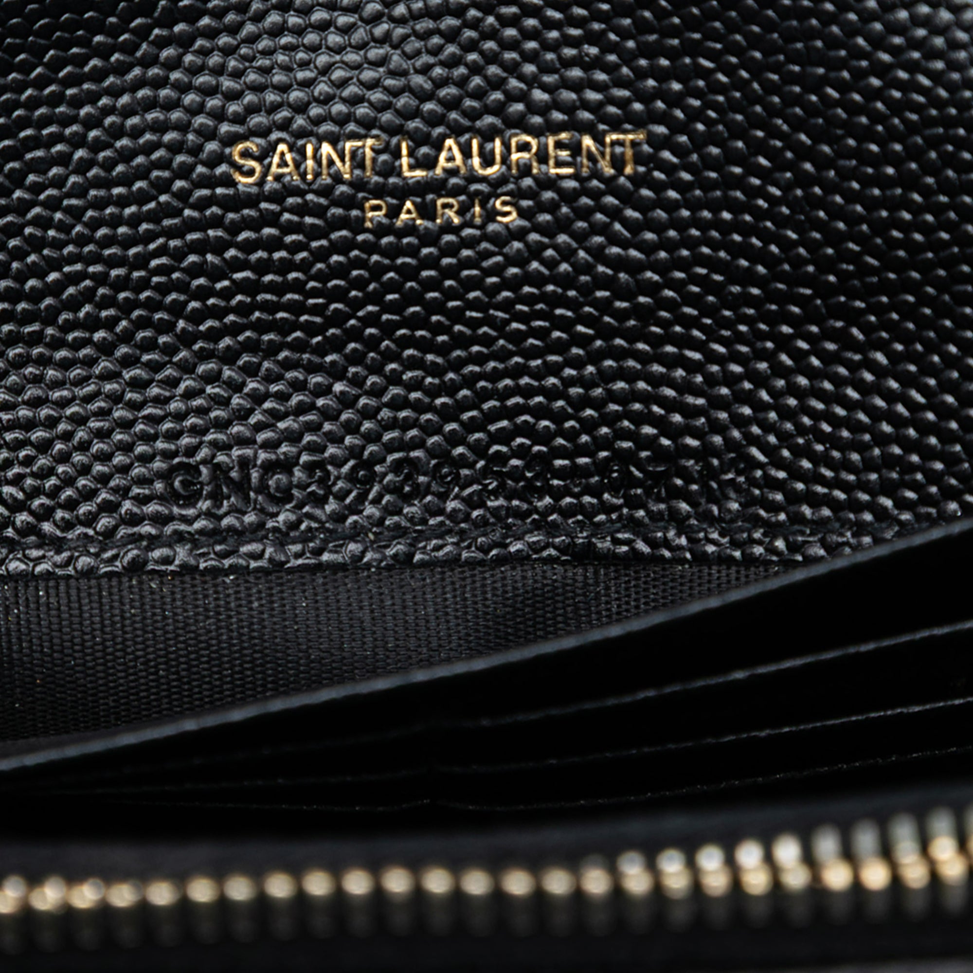 Product Details: Black Saint Laurent Grain De Poudre Cassandre Envelope Chain Wallet Crossbody Bag. The Cassandre Envelope Wallet on Chain features a leather body, a detachable chain link shoulder strap with leather guard, a front flap with snap fastener button closure, an interior zip compartment, and an interior open compartment with card slots. 4.9" L x 7.7" W x 1.2" D. Serial number GNC393953·0718.