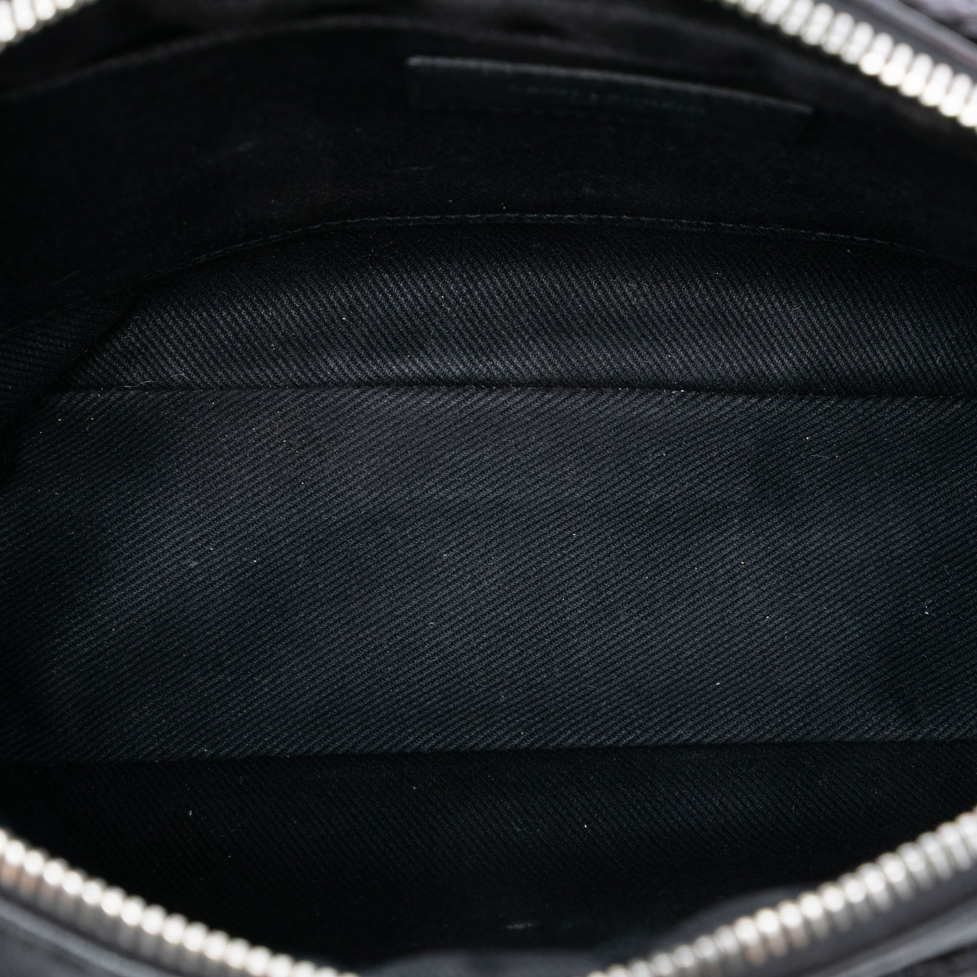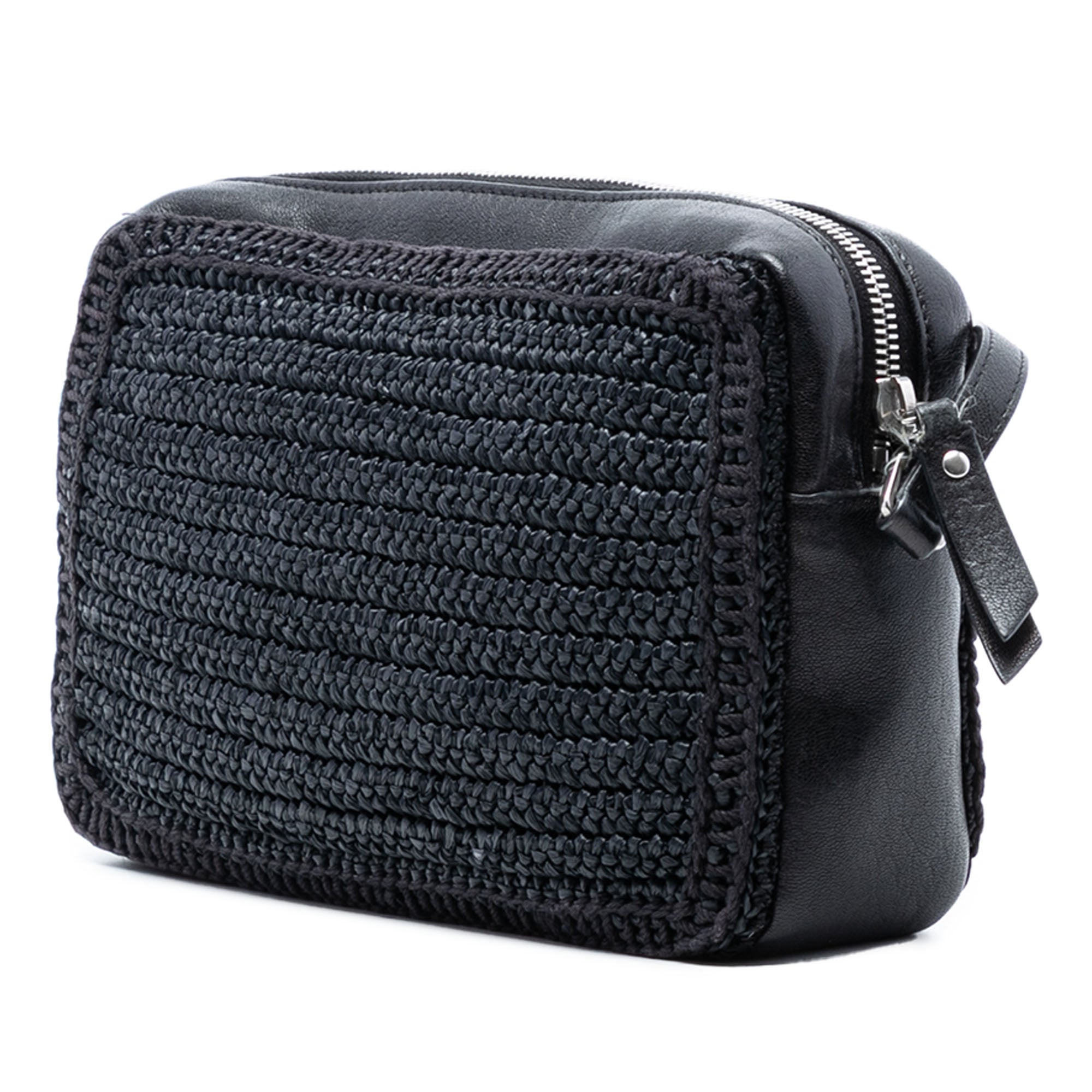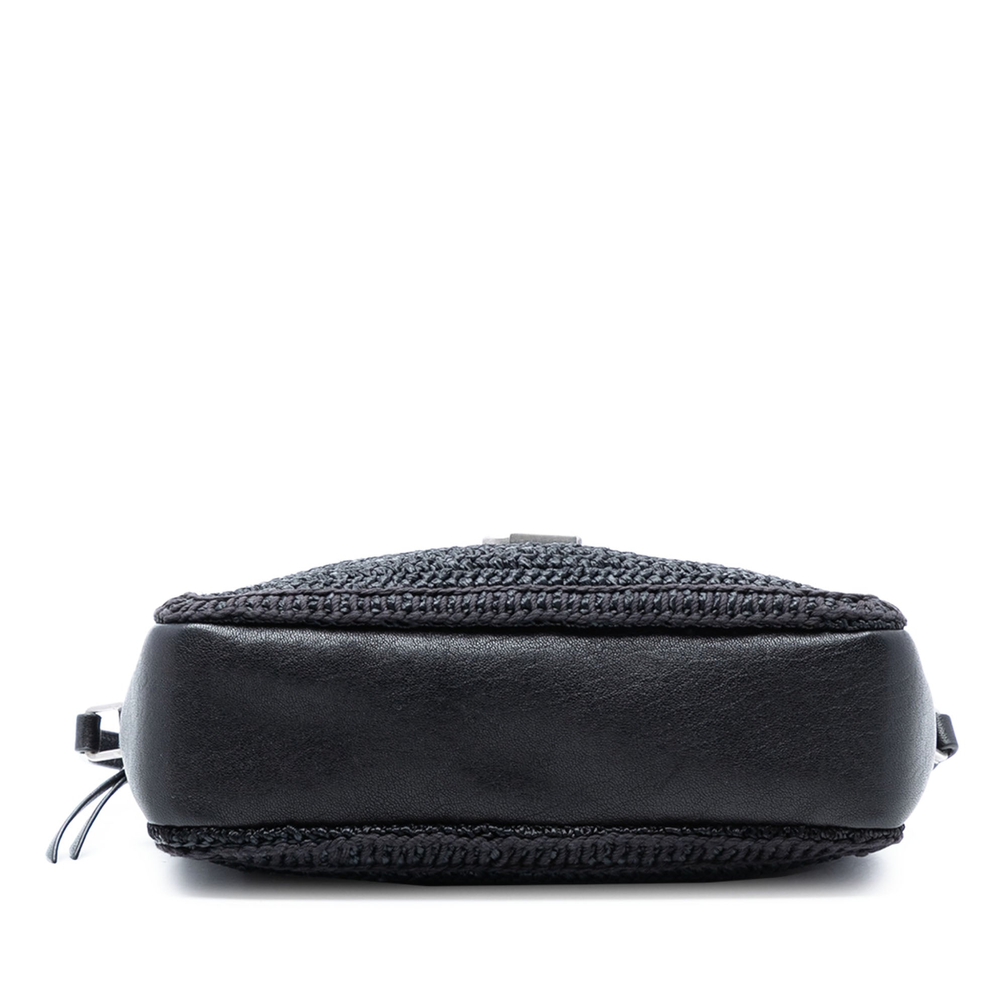 Product Details: Black Saint Laurent Woven Raffia and Leather Lou Camera Bag. The Lou Camera bag features a woven raffia body with leather trim, an adjustable flat leather shoulder strap, a top zip closure, and an interior slip pocket. The top was repainted. 5.5" L x 8.7" W x 2.4" D. Serial number PTR468537·0118.