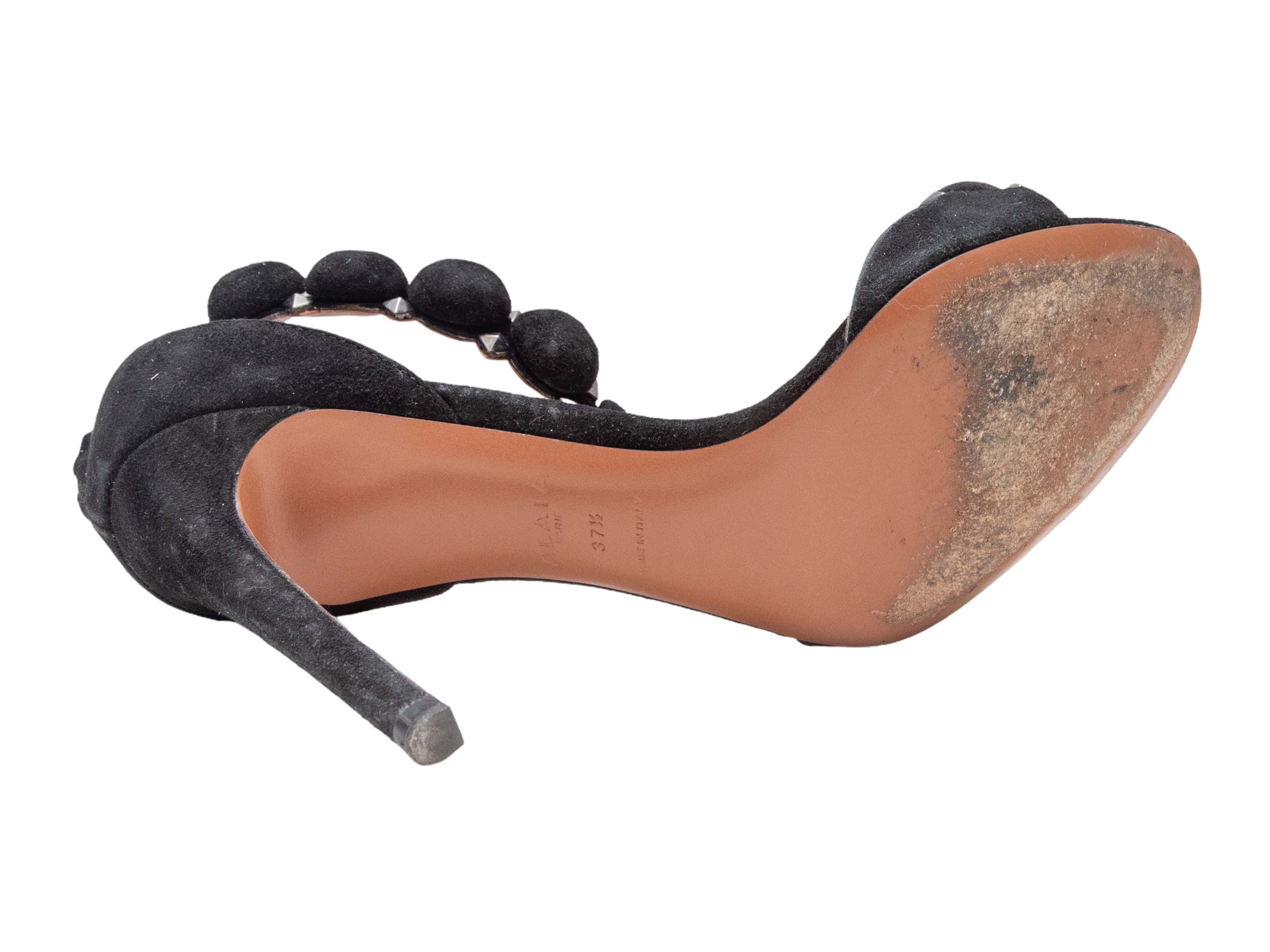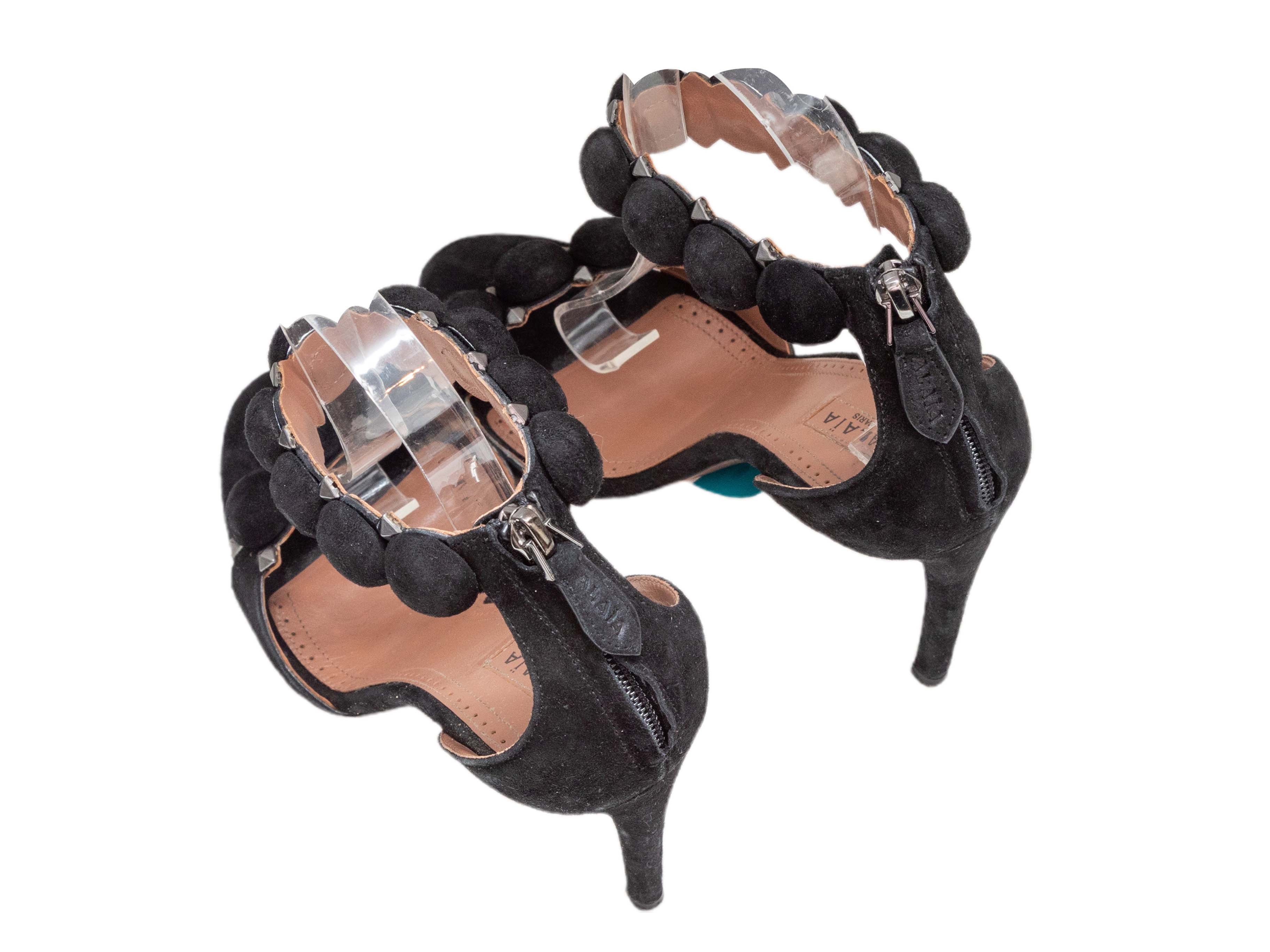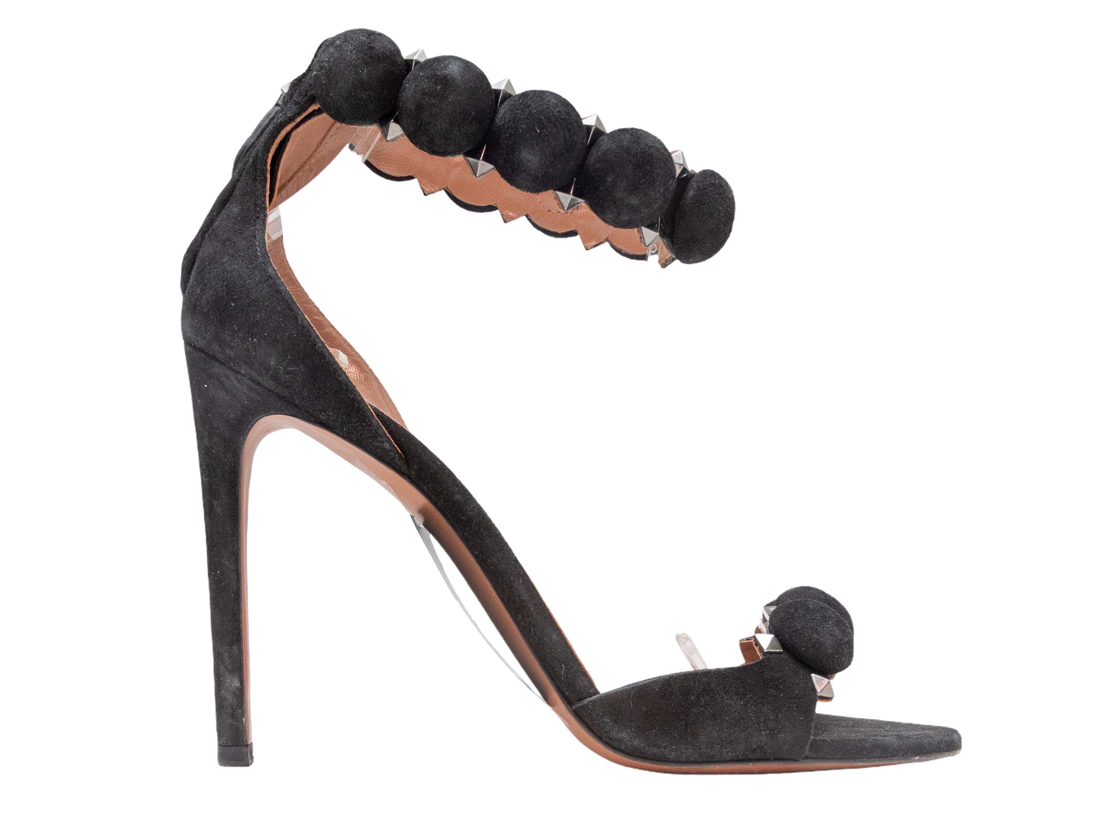 Product Details: Black suede ankle strap heeled sandals by Alaia. Gunmetal stud detailing at tops and ankle straps. Zip closures at counters. 4.5" heel height.