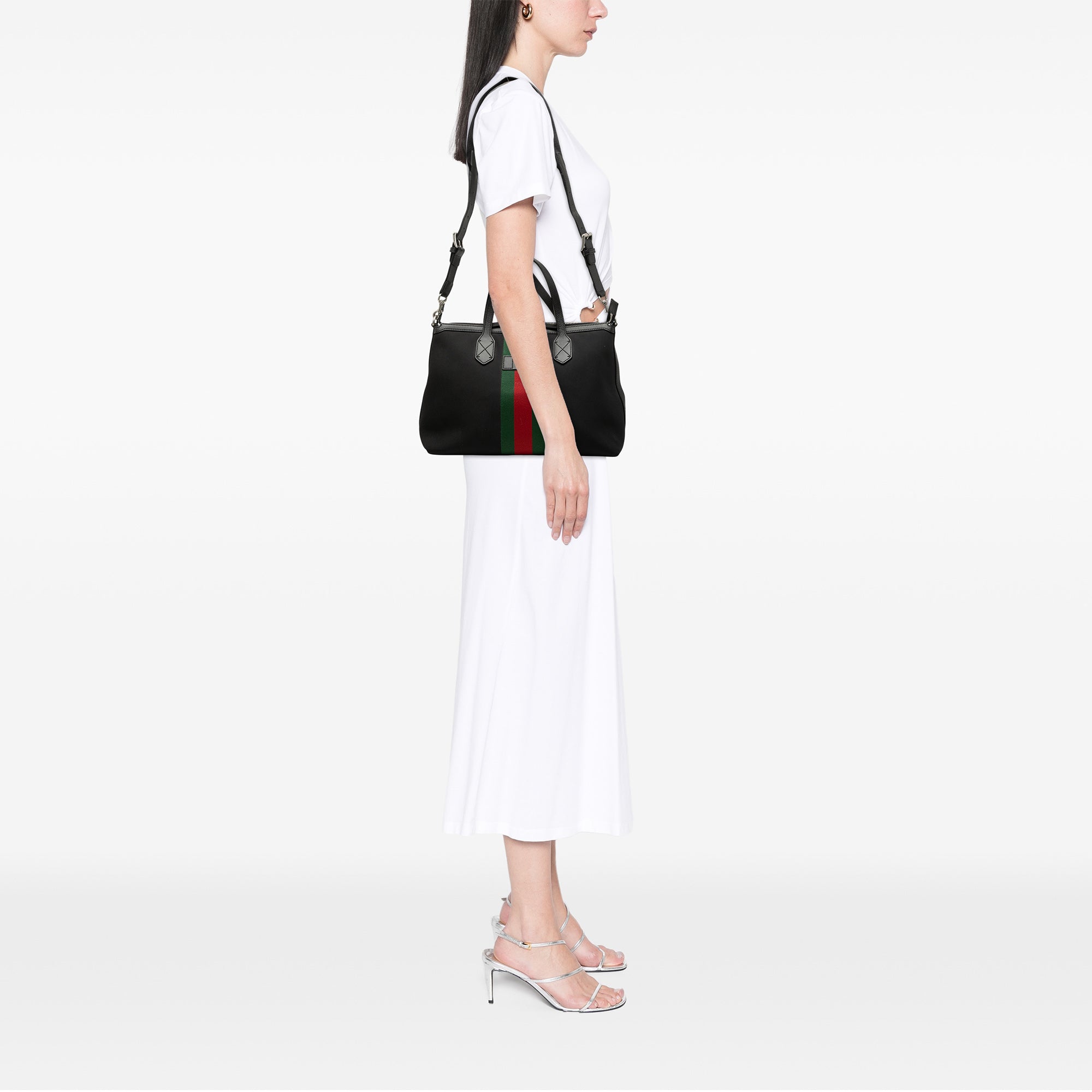 Product Details: Black Gucci Canvas Techno Web Satchel. This satchel features a canvas body with web detail and leather trim, flat leather handles, a detachable and adjustable flat canvas strap, a top zip closure, and interior zip and slip pockets. 9.4" L x 13.8" W x 5.5" D, 5.1" drop. Serial number 630923.204991.