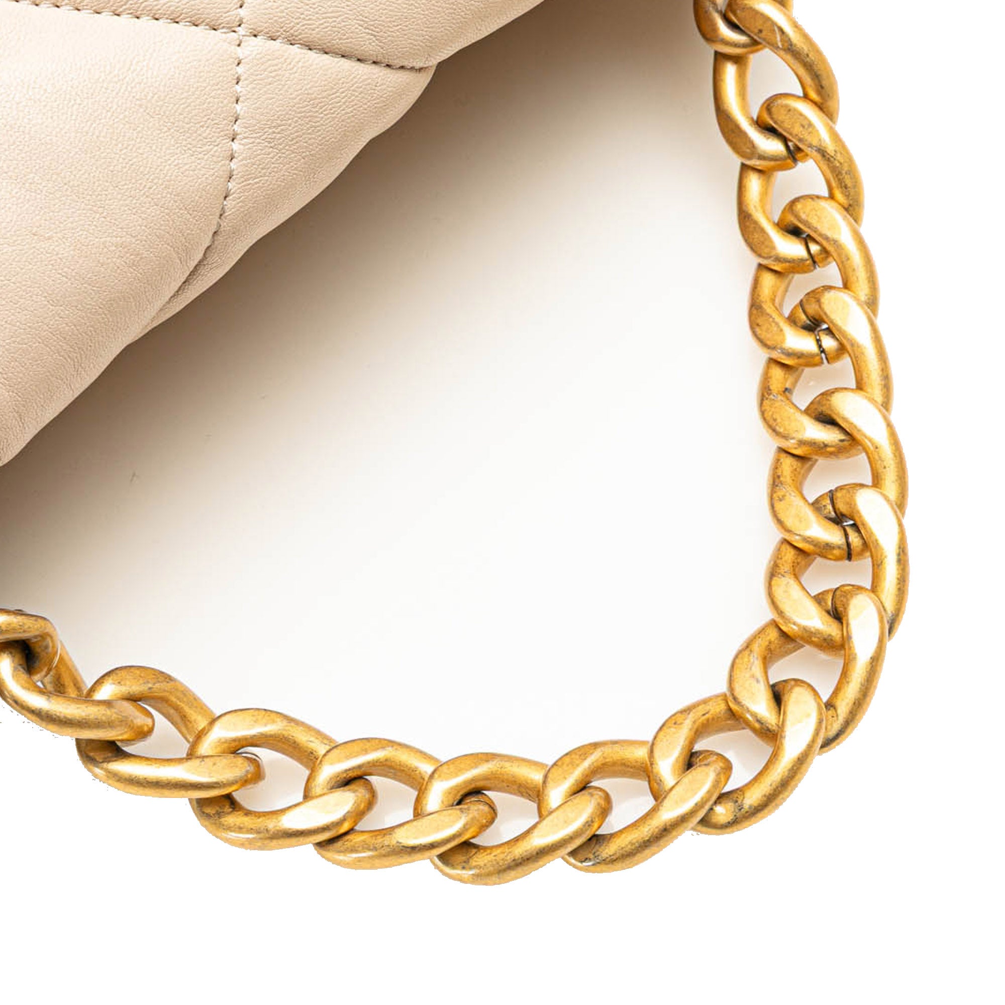 Product Details: Brown Chanel Large Lambskin 19 Flap Satchel. The Large 19 Flap bag features a quilted lambskin leather body, a gold-tone chain handle, a woven leather chain shoulder strap, a flap with a CC twist lock closure, an exterior slip pocket, and an interior zip pocket. 8.3" L x 11.8" W x 3.3" D, 4.7" drop. Serial number HHK3TJJ2.