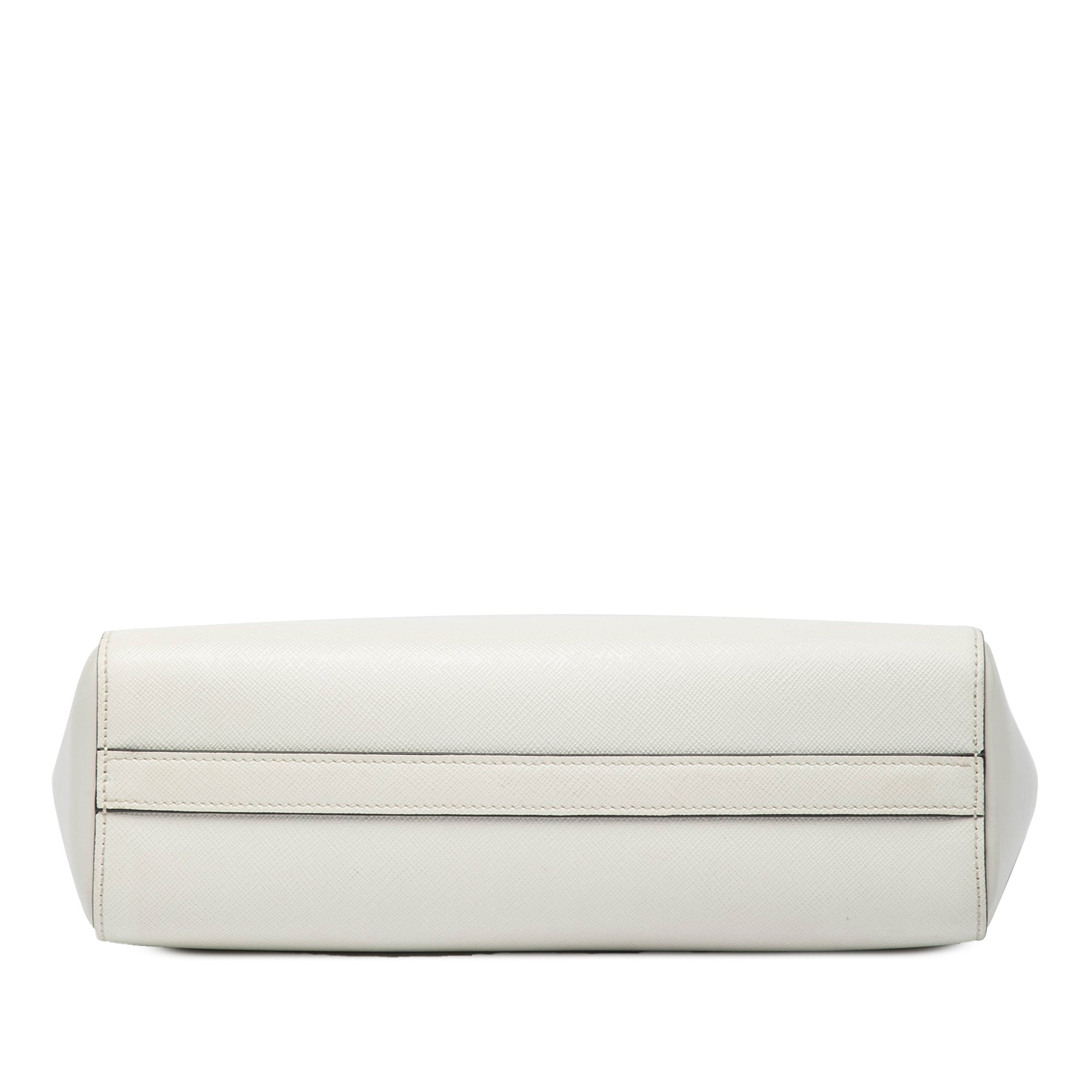 Product Details: White Prada Small Soft Calf Trimmed Saffiano Zippered Tote Satchel. This satchel features a saffiano leather body, rolled leather handles, a top zip closure, and interior zip and slip pockets. 8.7" L x 10.2" W x 3.3" D, 5.1" drop.