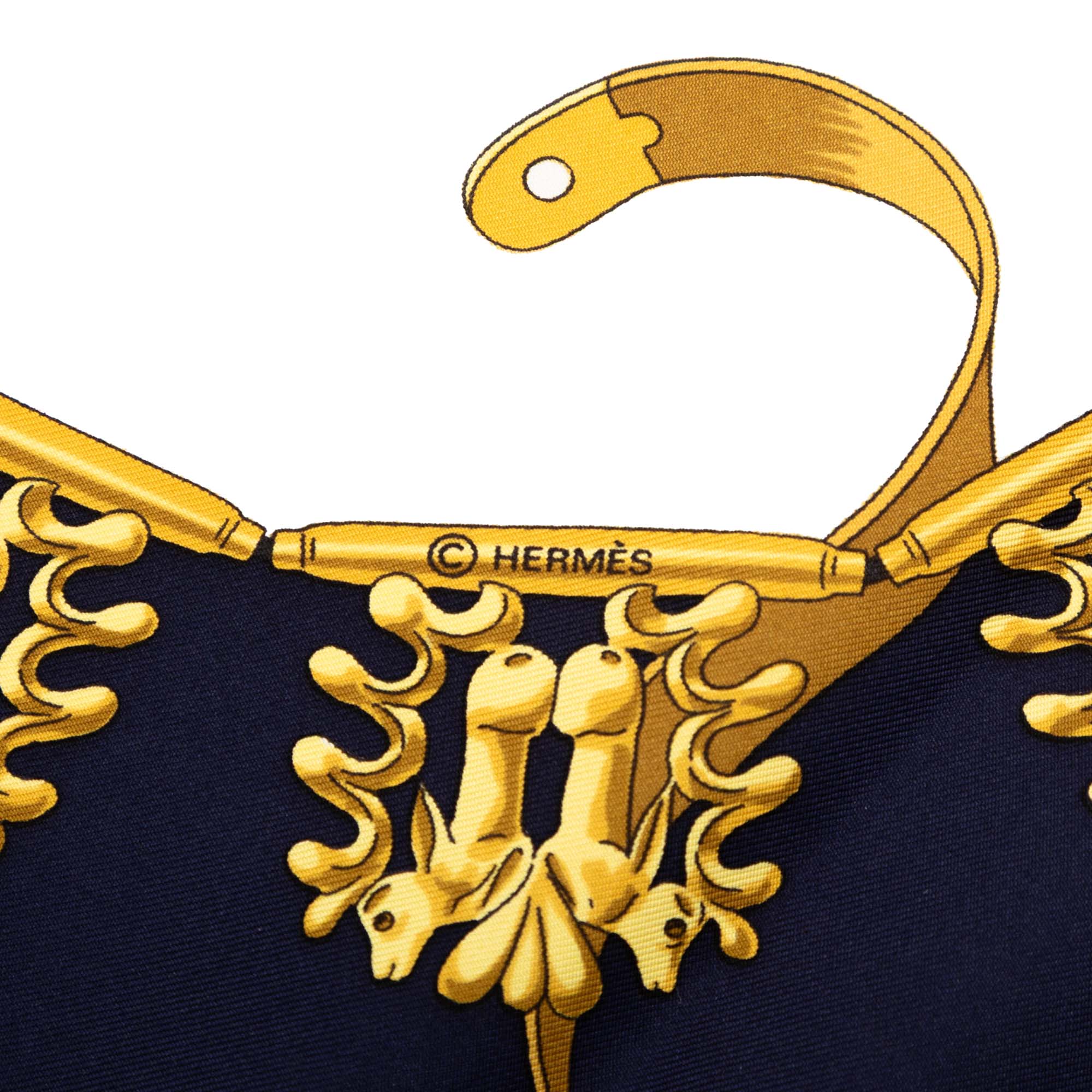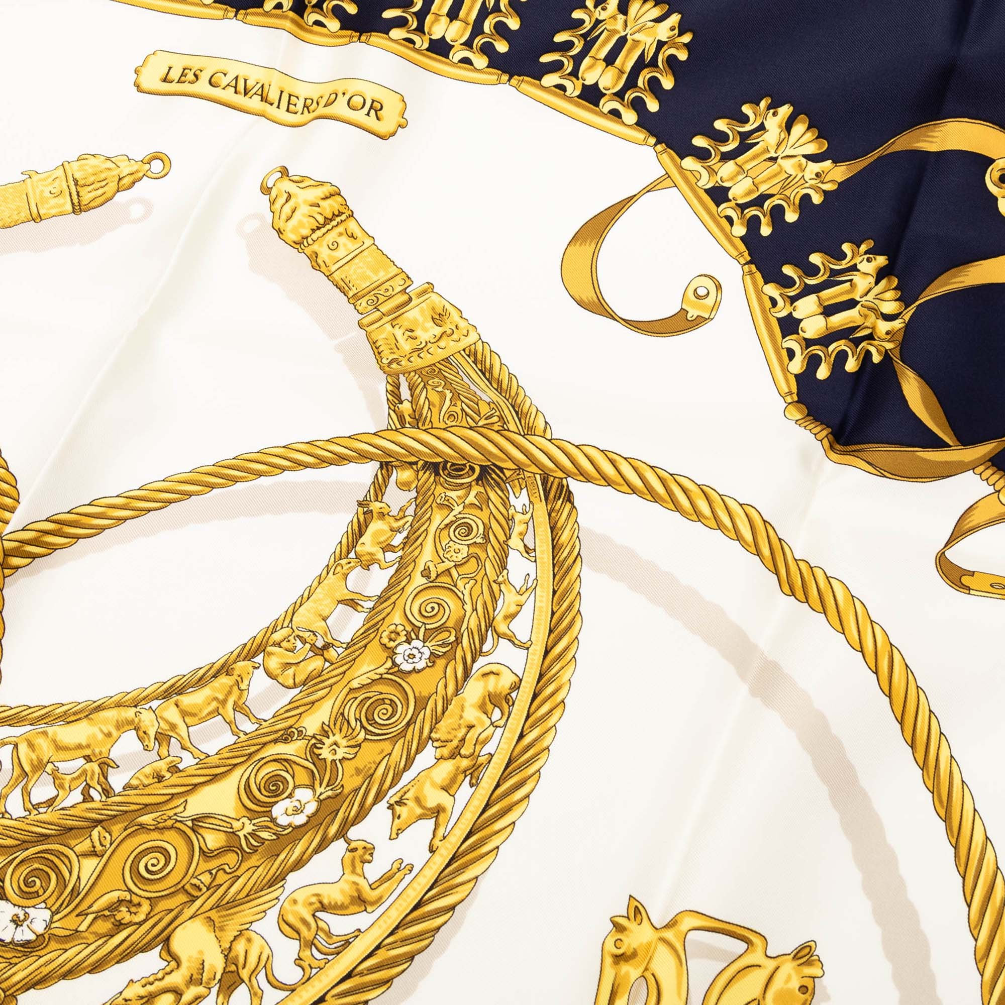 Product Details: White Hermès Les Cavaliers d Or Silk Scarf Scarves. This scarf features Les Cavaliers d'Or print on 100% silk. 35" L x 34.8" W x 0" D.