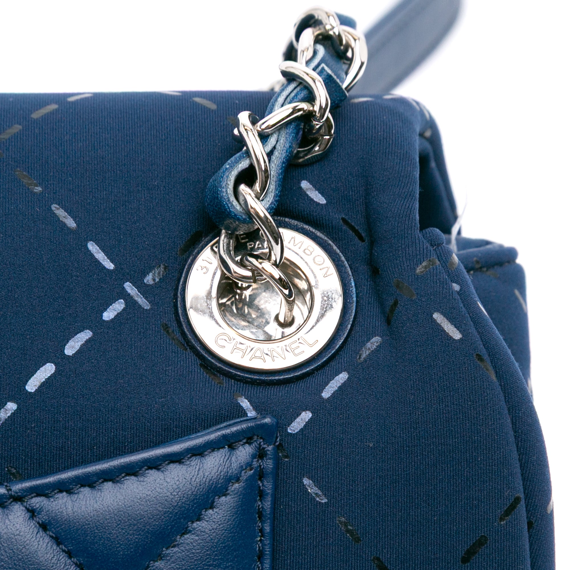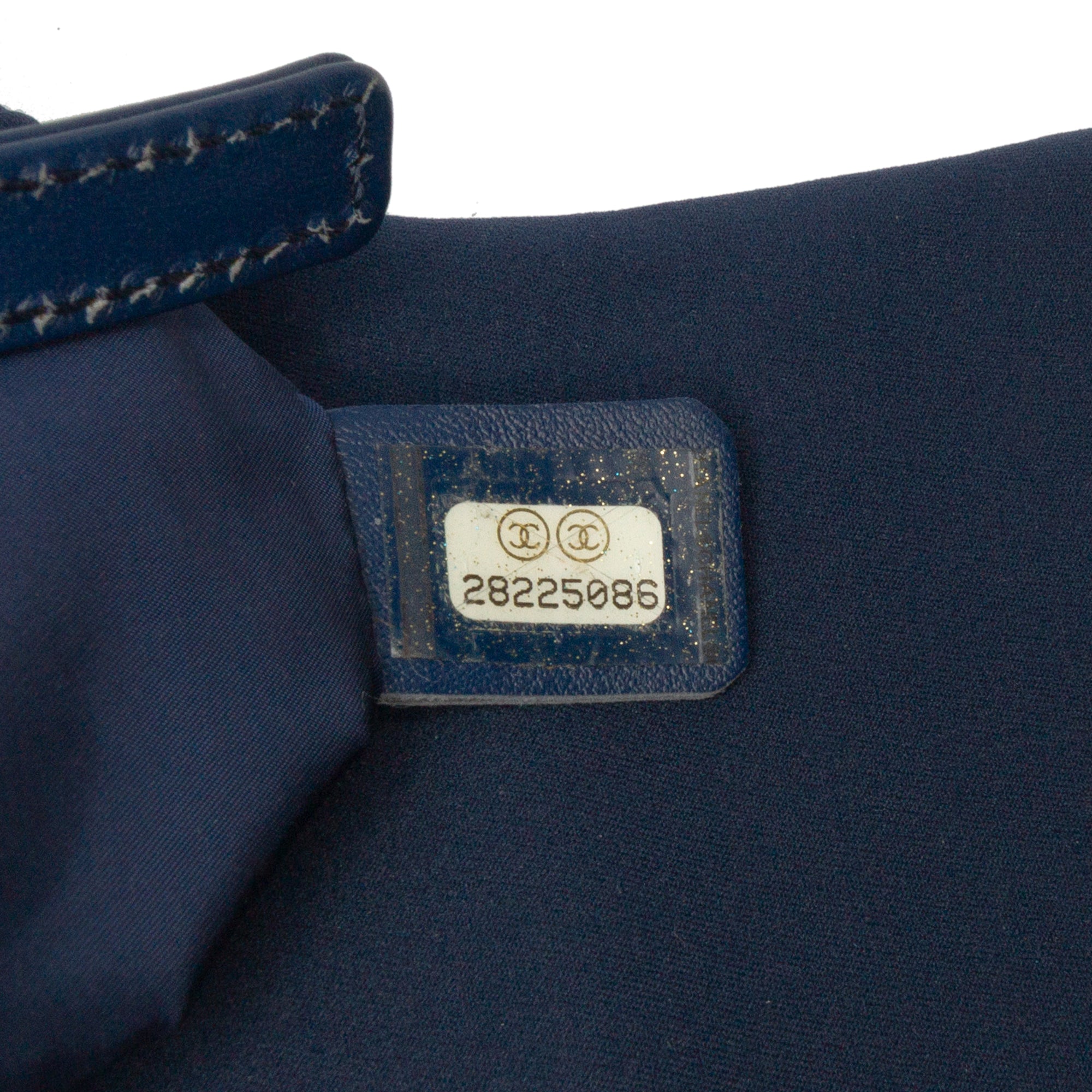 Product Details: Blue Chanel Classic Jersey Single Flap Shoulder Bag. This shoulder bag features a jersey body, a woven chain shoulder strap with leather guard, a flap with CC turn-lock closure, and an exterior back slip pocket. 6.1" L x 9.4" W x 1" D. Serial number 28225086.