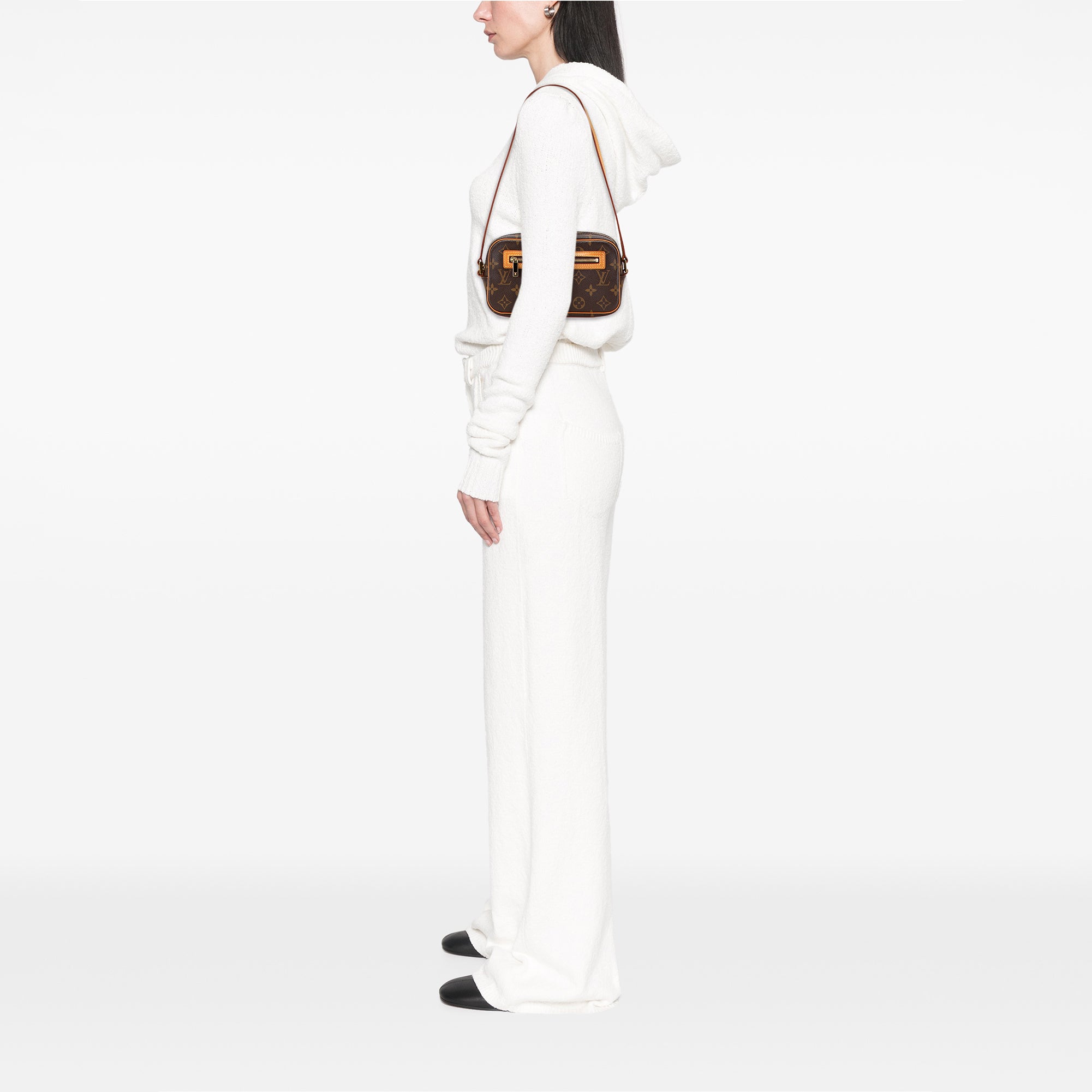 Product Details: Brown Louis Vuitton Monogram Pochette Cite Shoulder Bag. The Cite features a monogram canvas body with vachetta leather trim, a flat vachetta leather shoulder strap, a top zip closure, an exterior front zip pocket, and an interior slip pocket. 4.7" L x 8.3" W x 2.4" D.