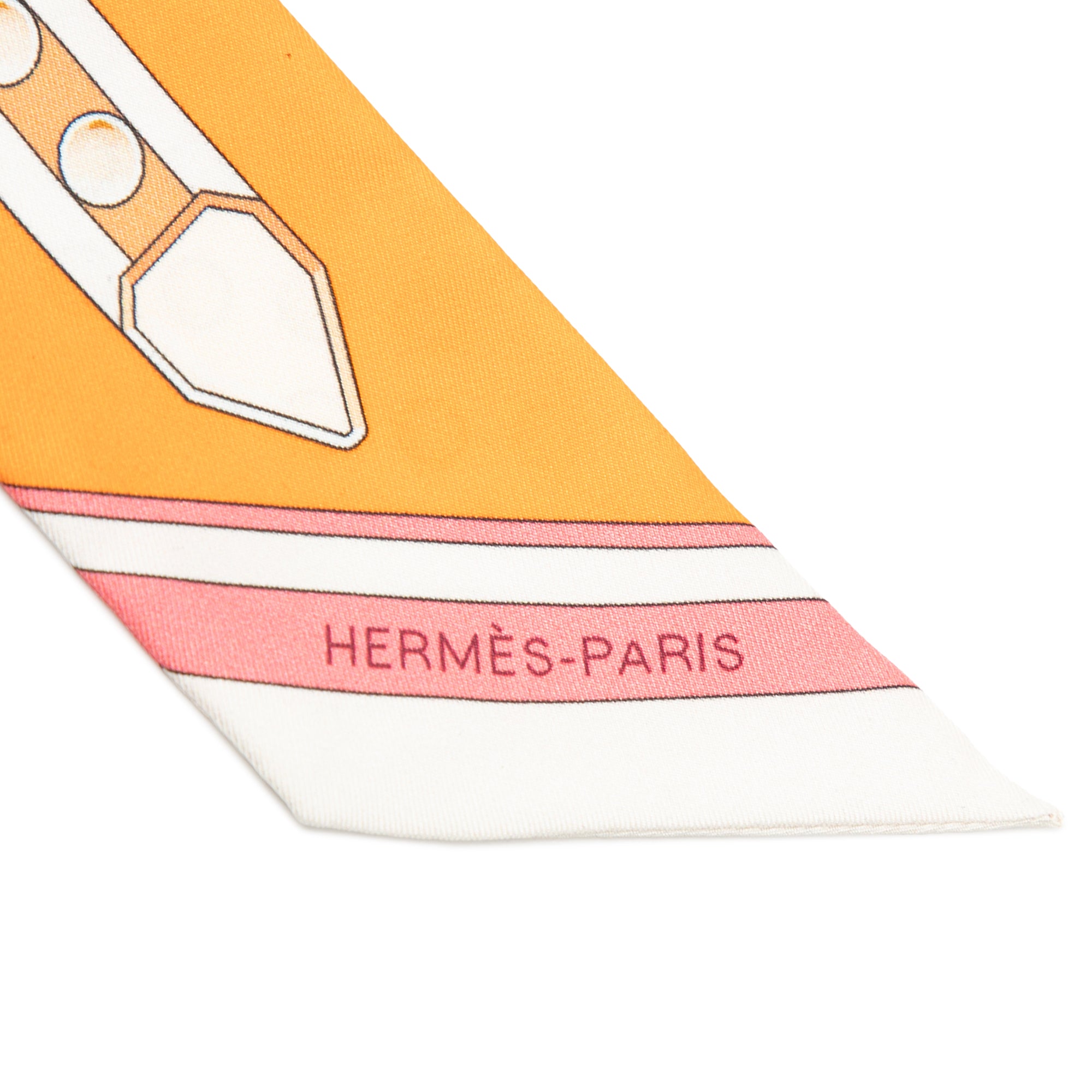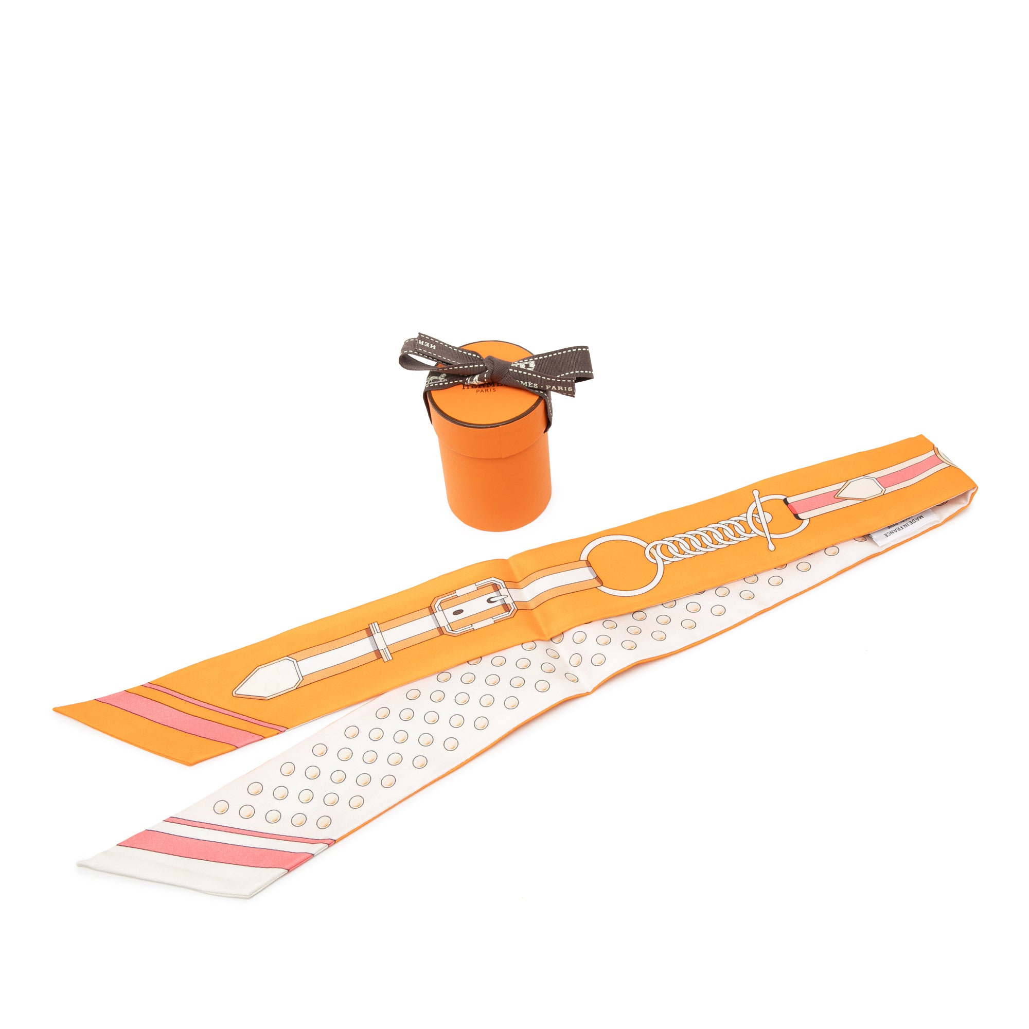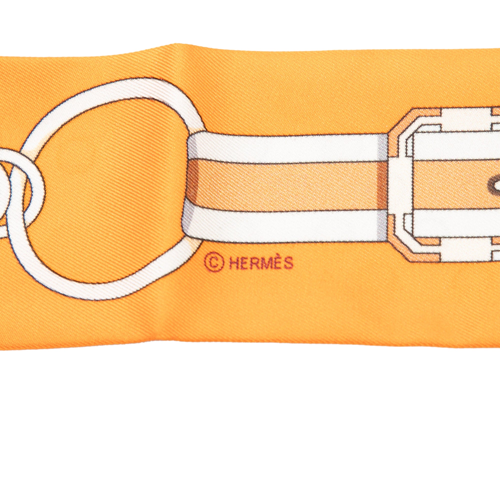 Product Details: Orange Hermès Grand Tralala Silk Twilly Scarf Scarves. This twilly scarf features the Grand Tralala print on 100% silk. 34.1" L x 2" W x 0" D.
