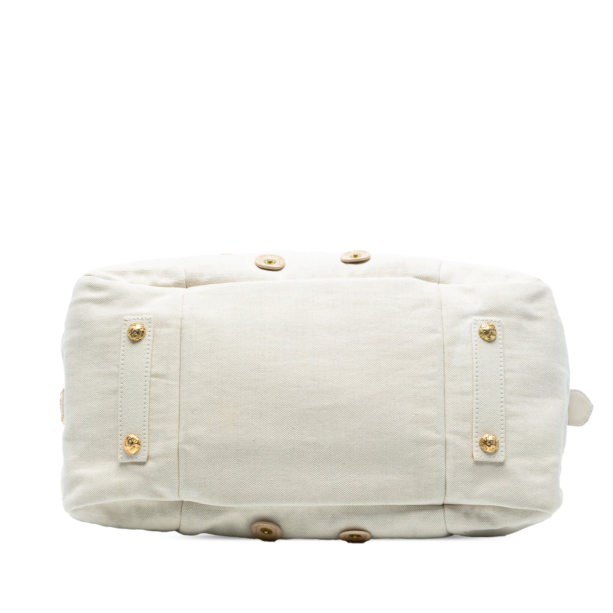 Product Details: White Louis Vuitton Polka Dots Bowly Handbag. The Bowly Bag features a canvas body, brass hardware, logo disc embellishments, rolled handles, a top zip closure, and an interior slip pocket. 11.8" L x 16.1" W x 8.3" D, 6.7" drop. Serial number MB0067.