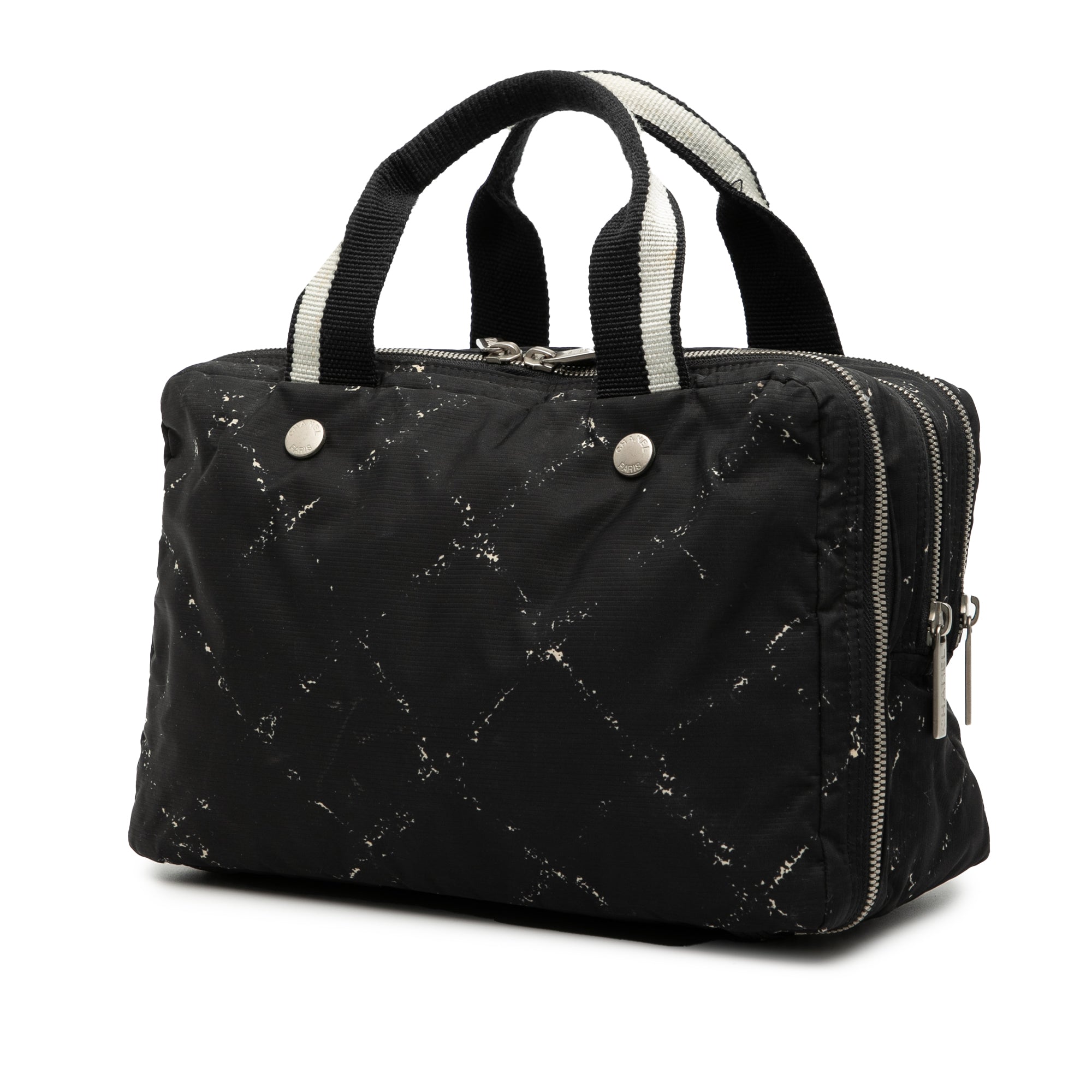 Product Details: Black Chanel Old Travel Line Nylon Handbag. This handbag features a nylon body, flat straps, and a top zip closure. 7.9" L x 11.8" W x 5.9" D, 4.7" drop. Serial number 6348515.