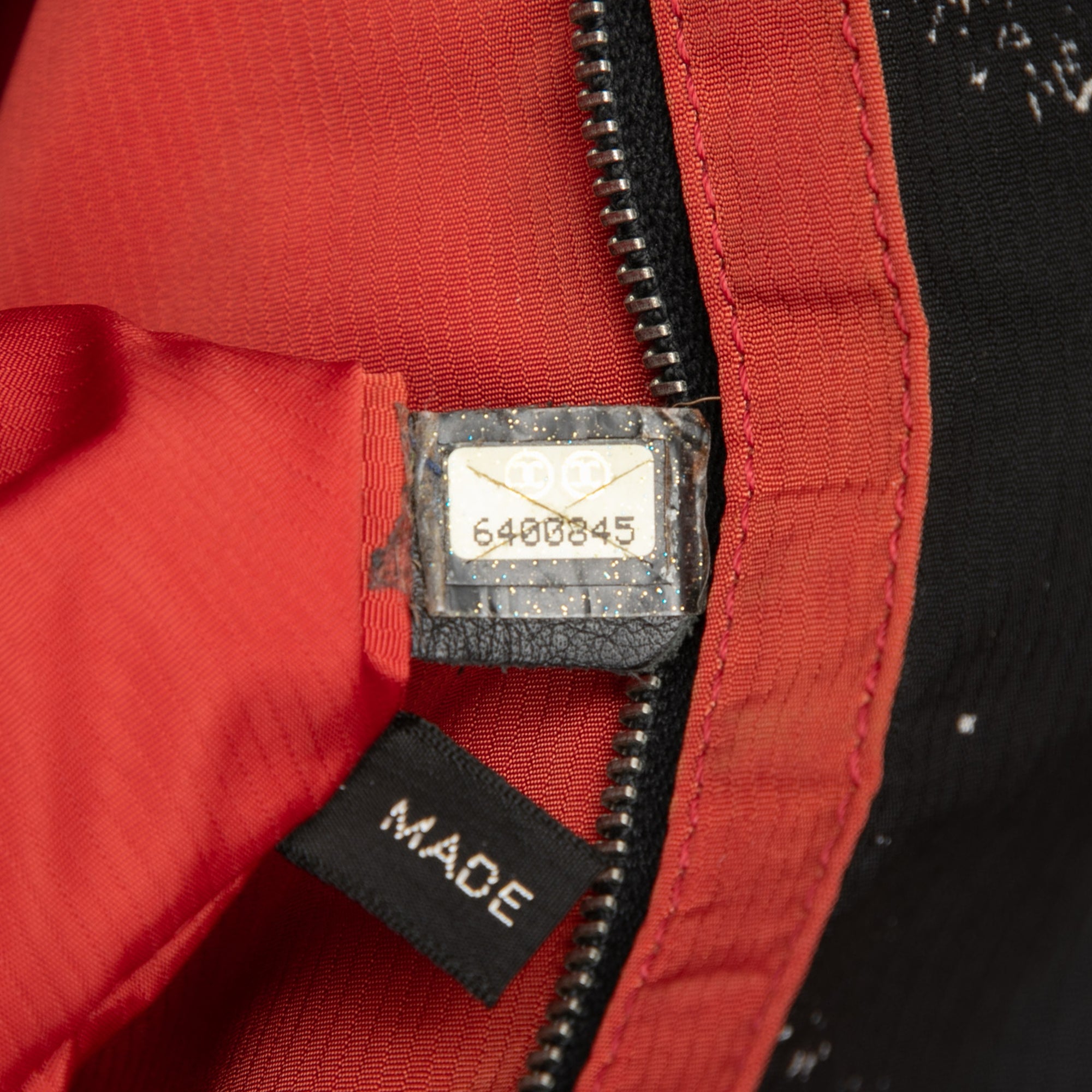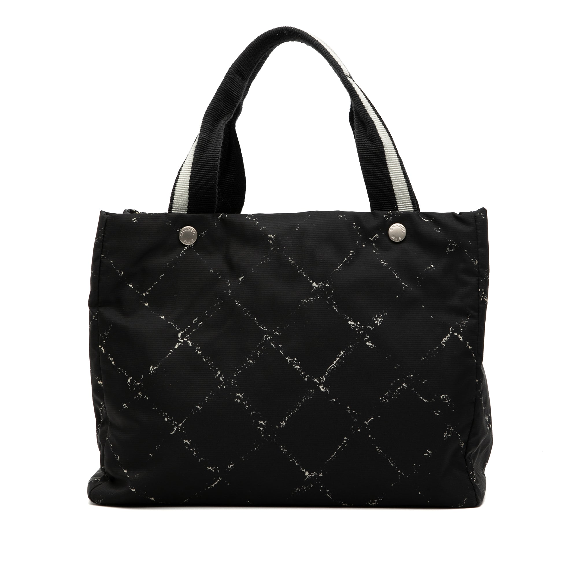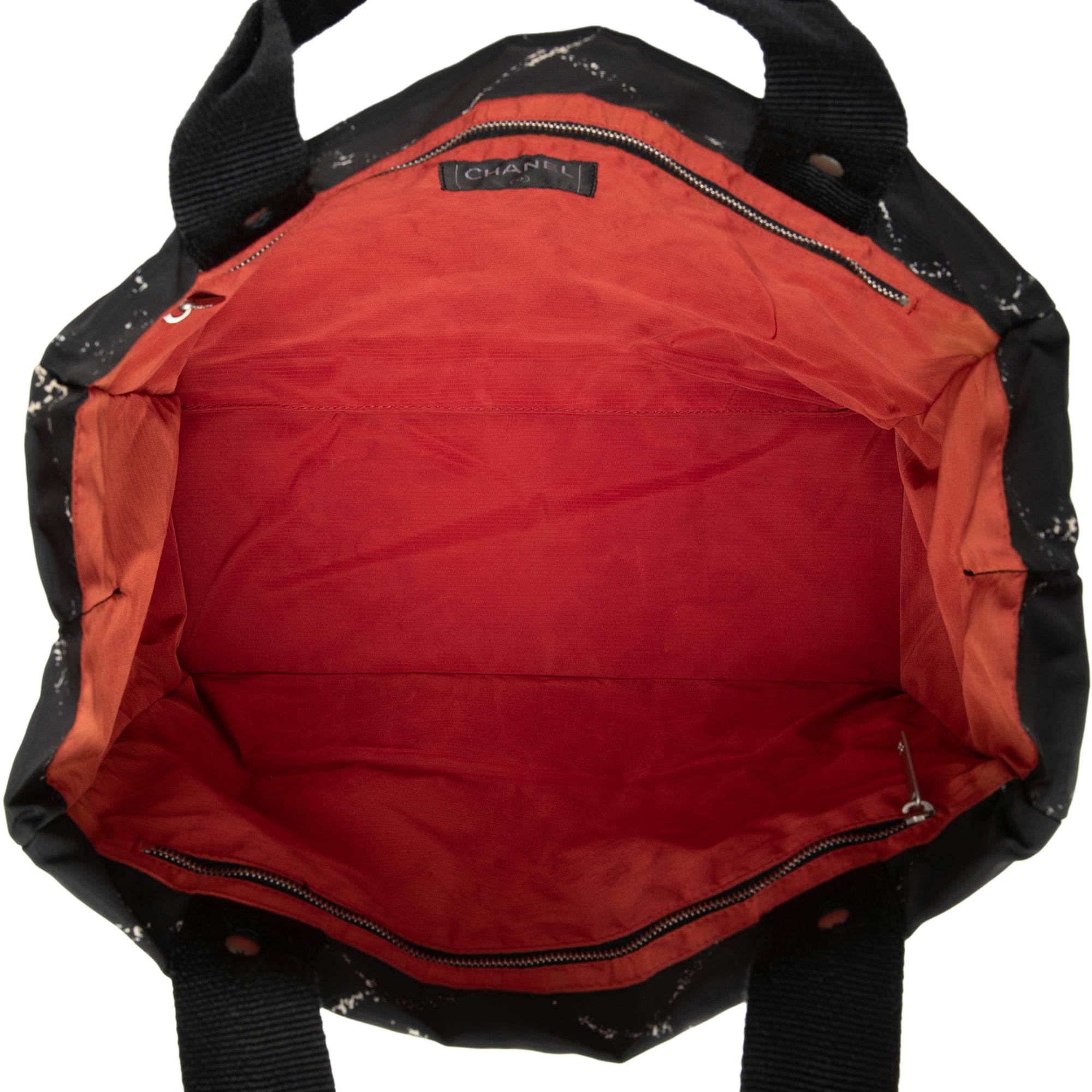 Product Details: Black Chanel Old Travel Line Nylon Tote. The Old Travel Line tote bag features a nylon body, flat straps, an open top, and interior zip pockets. 9.8" L x 13" W x 6.3" D, 5.9" drop. Serial number 6400845.