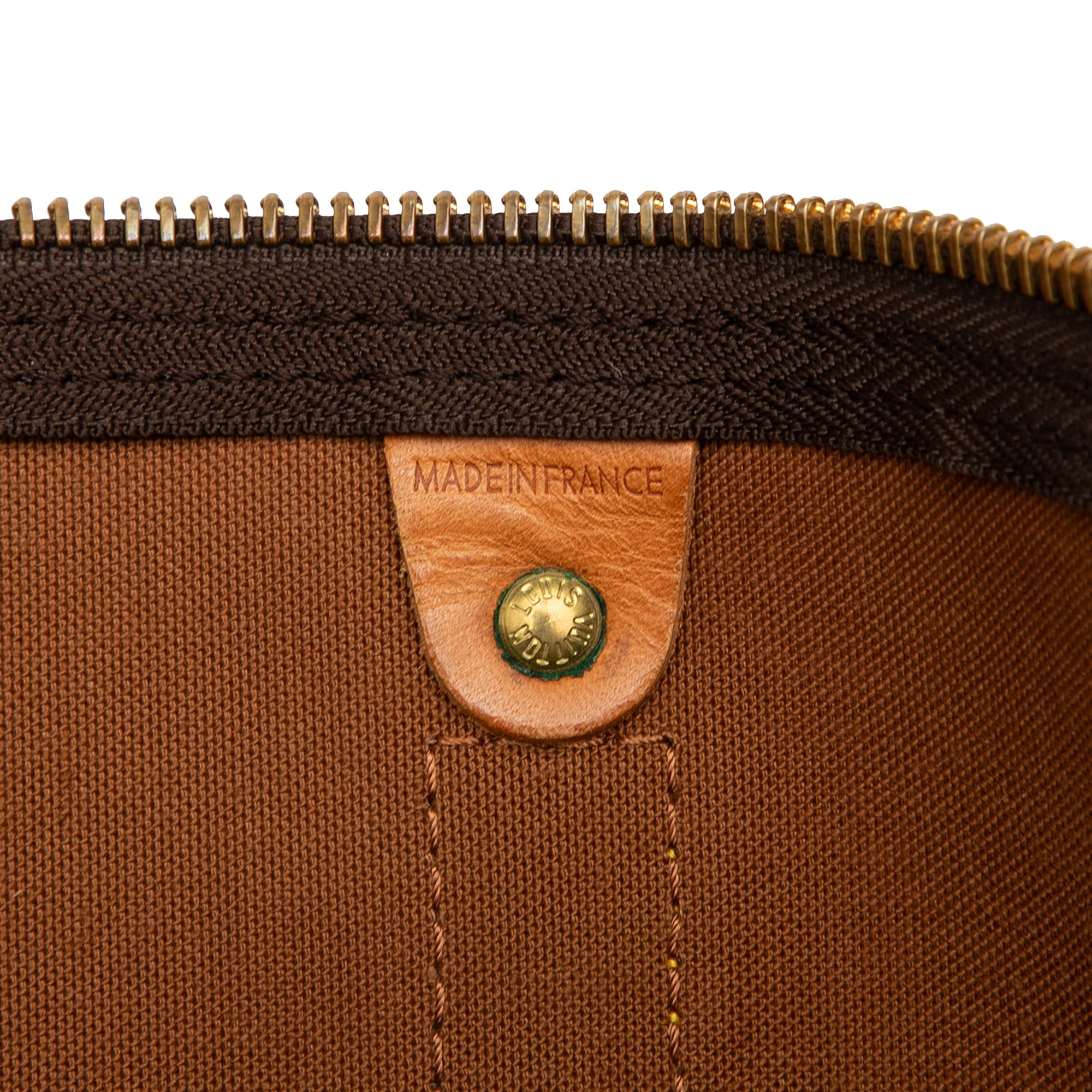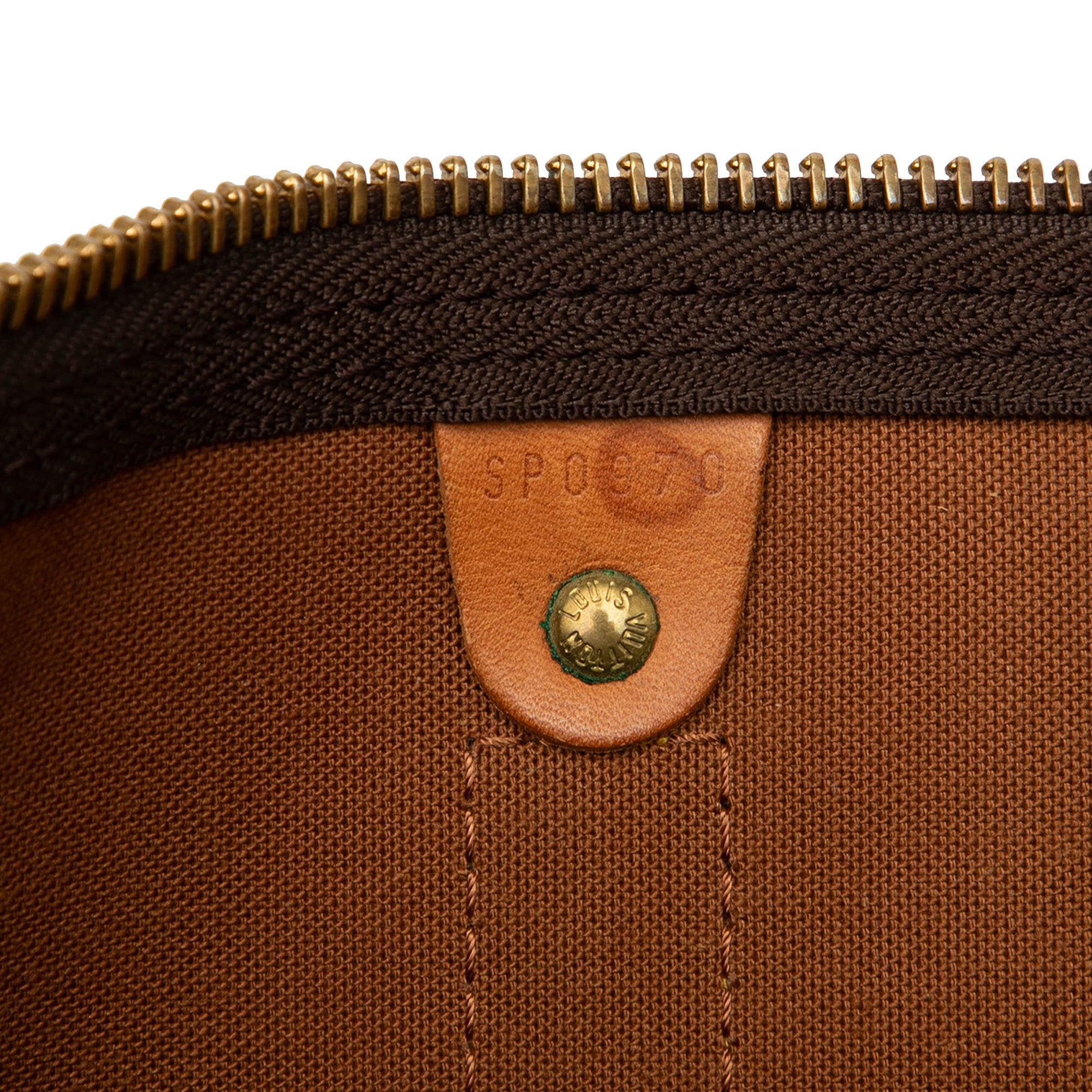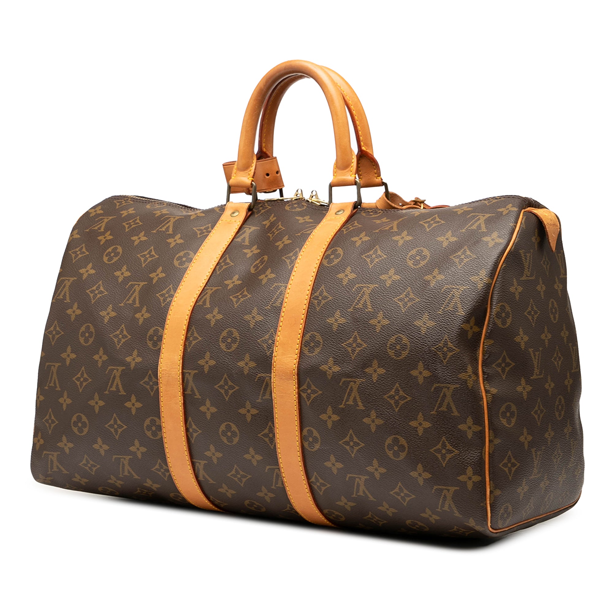 Product Details: Brown Louis Vuitton Monogram Keepall 45 Travel Bag. The Keepall 45 features a monogram canvas body with vachetta leather trim, rolled vachetta leather handles, and a top zip closure. 10.6" L x 18.1" W x 7.9" D, 4.1" drop. Serial number SP0970.
