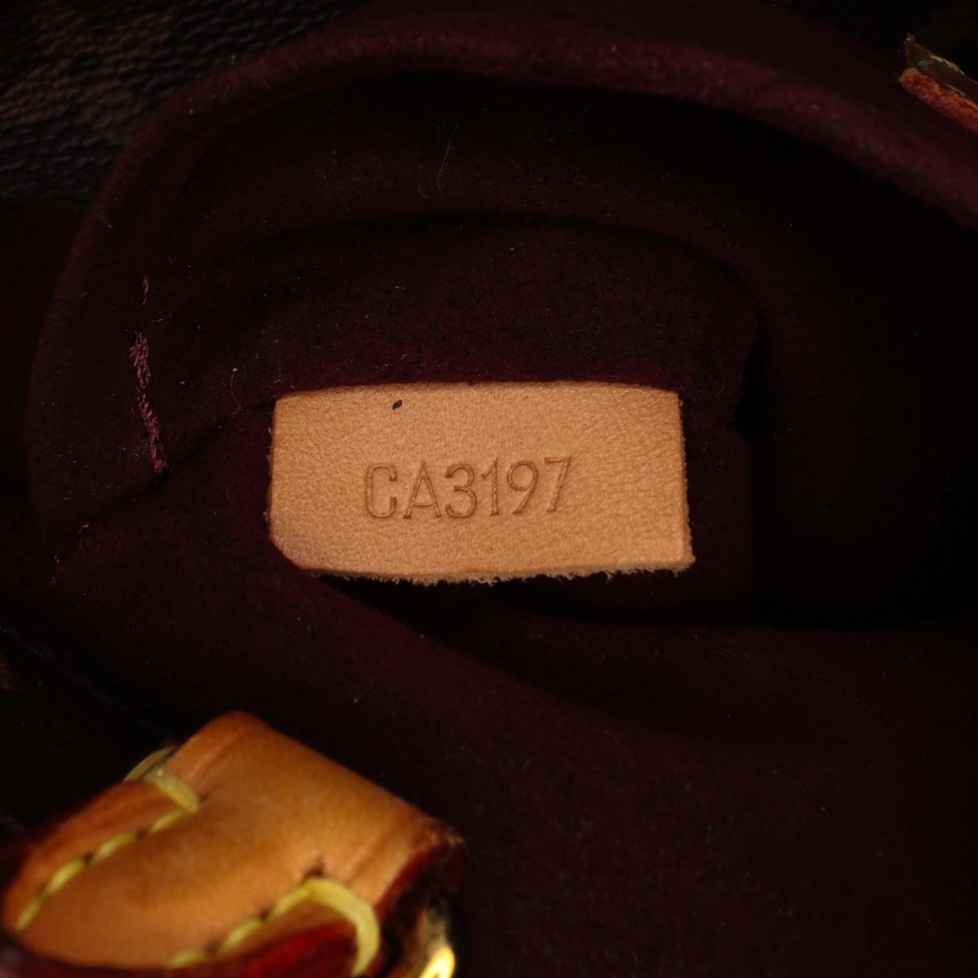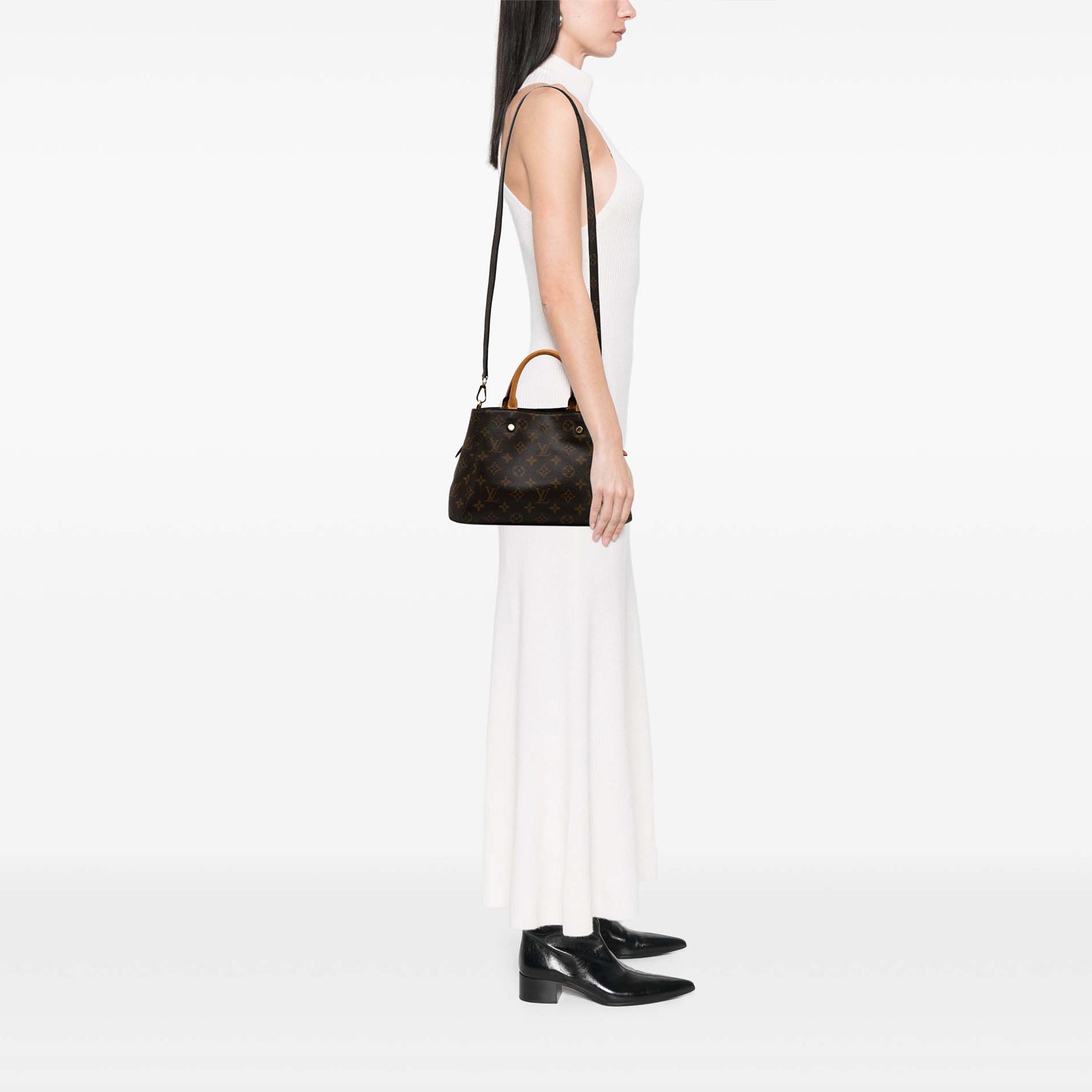 Product Details: Brown Louis Vuitton Monogram Montaigne BB Satchel. The Montaigne BB features a coated canvas body, rolled vachetta leather handles, a detachable flat strap, an open top with lobster claw clasp closure, and interior slip and zip pockets. Exterior edges are repainted. 7.7" L x 11.8" W x 5.1" D, 3.9" drop. Serial number CA3197.