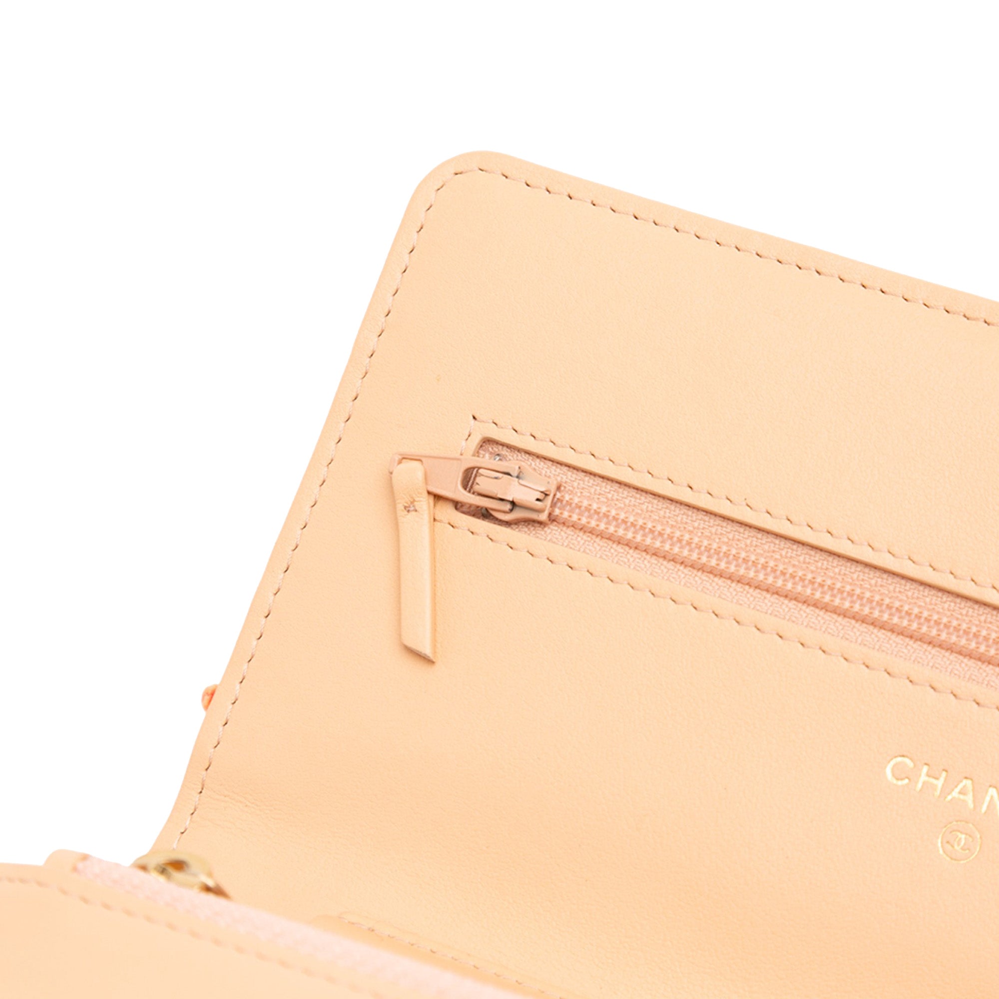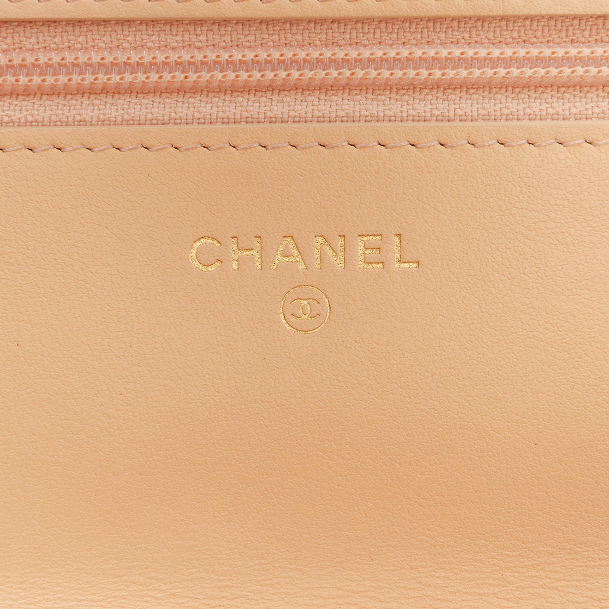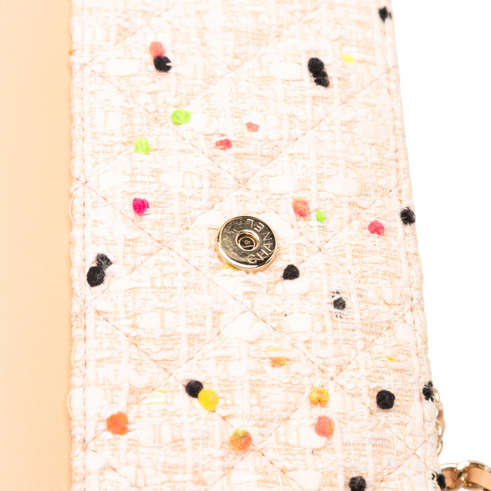 Product Details: Tan Chanel Quilted Tweed Candy Cotton and Beach Ball Wallet On Chain Crossbody Bag. This wallet on chain features a tweed body, a leather-woven chain link strap, a flap with snap closure, an exterior back slip pocket, an interior zip compartment, and interior zip and slip pockets. 5.1" L x 7.5" W x 1.6" D. Serial number 27751565.