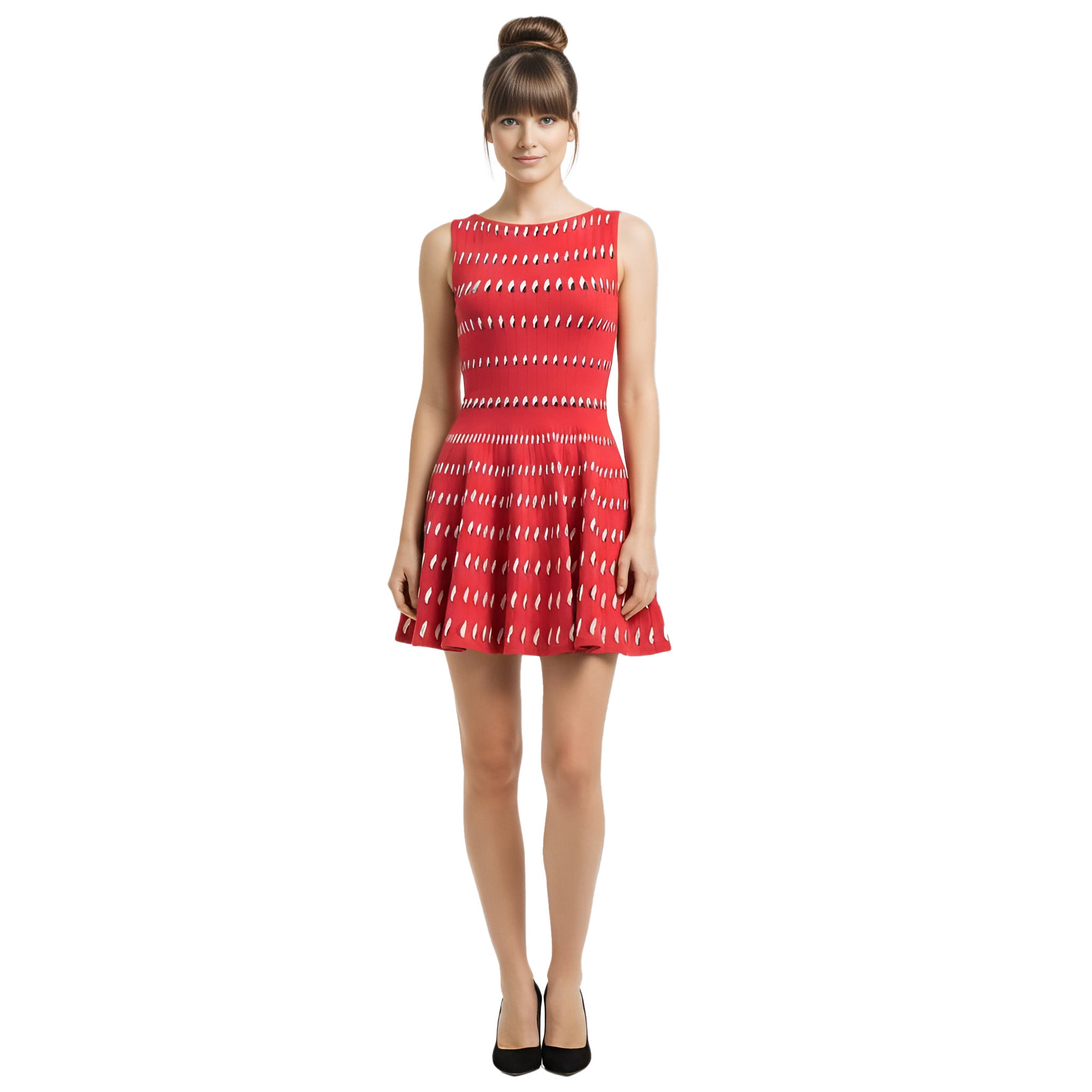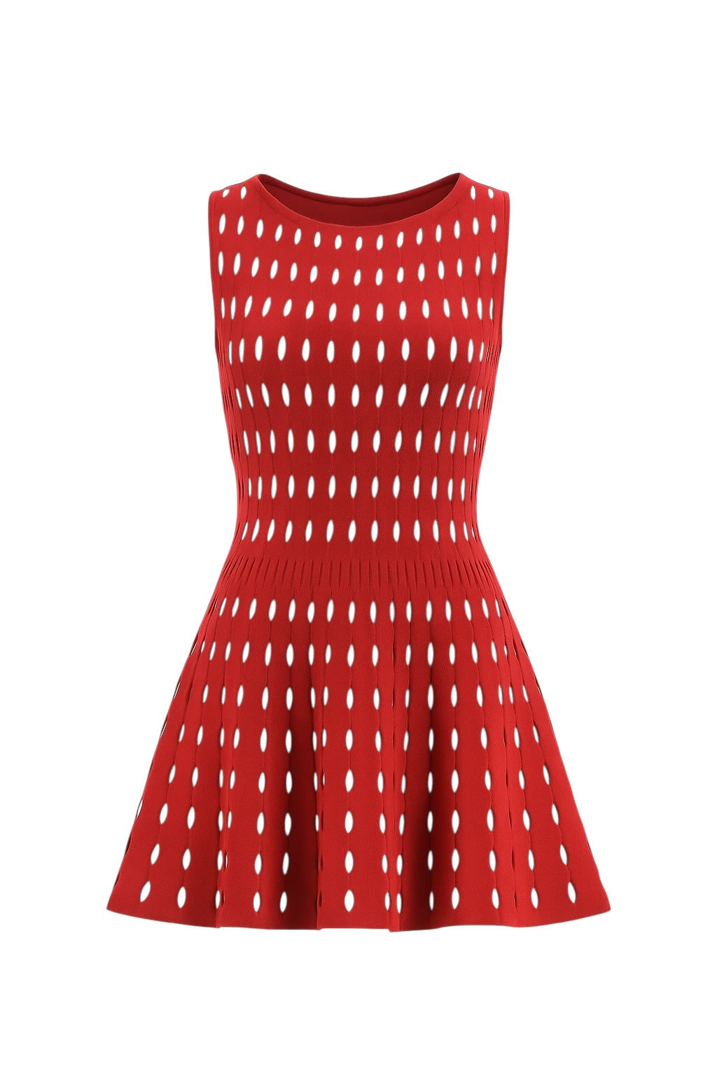 RENT this vivid red sleeveless knit mini dress with white dash detailing. Designed with a high crew neckline, fitted bodice, and a flared skater-style skirt.