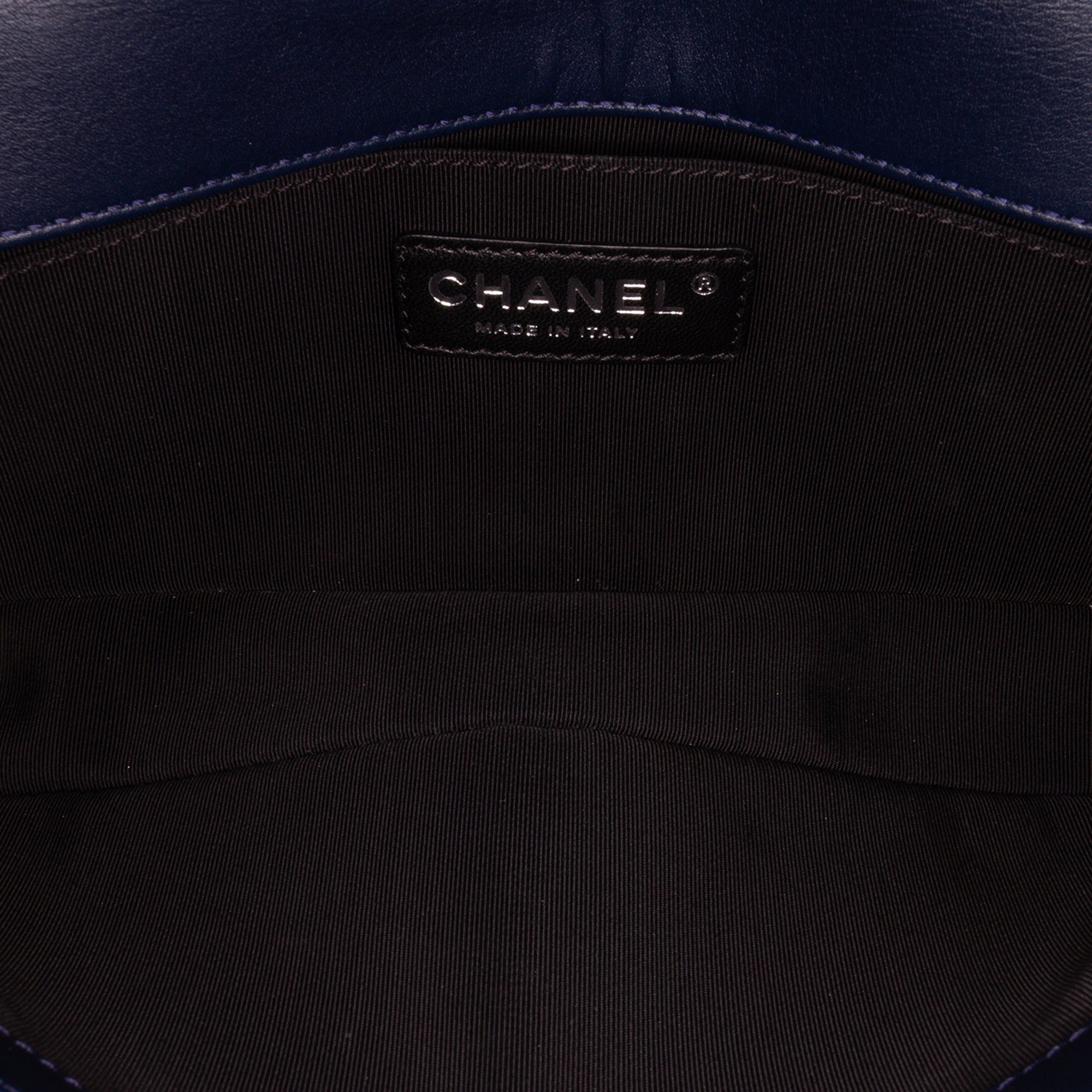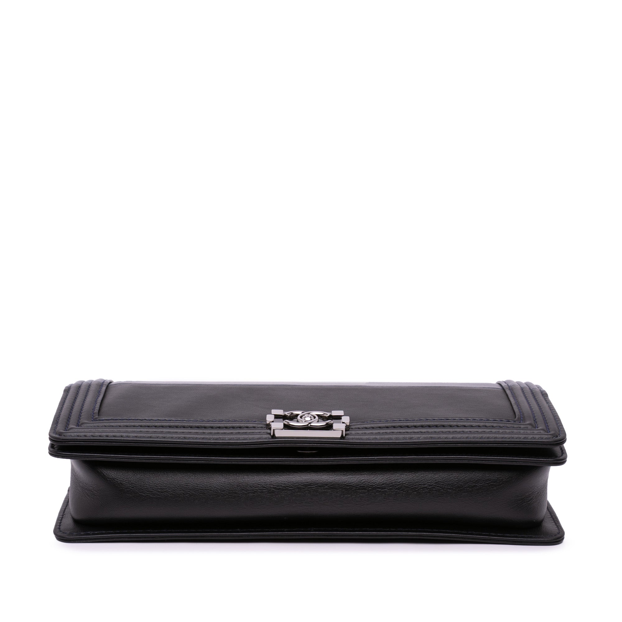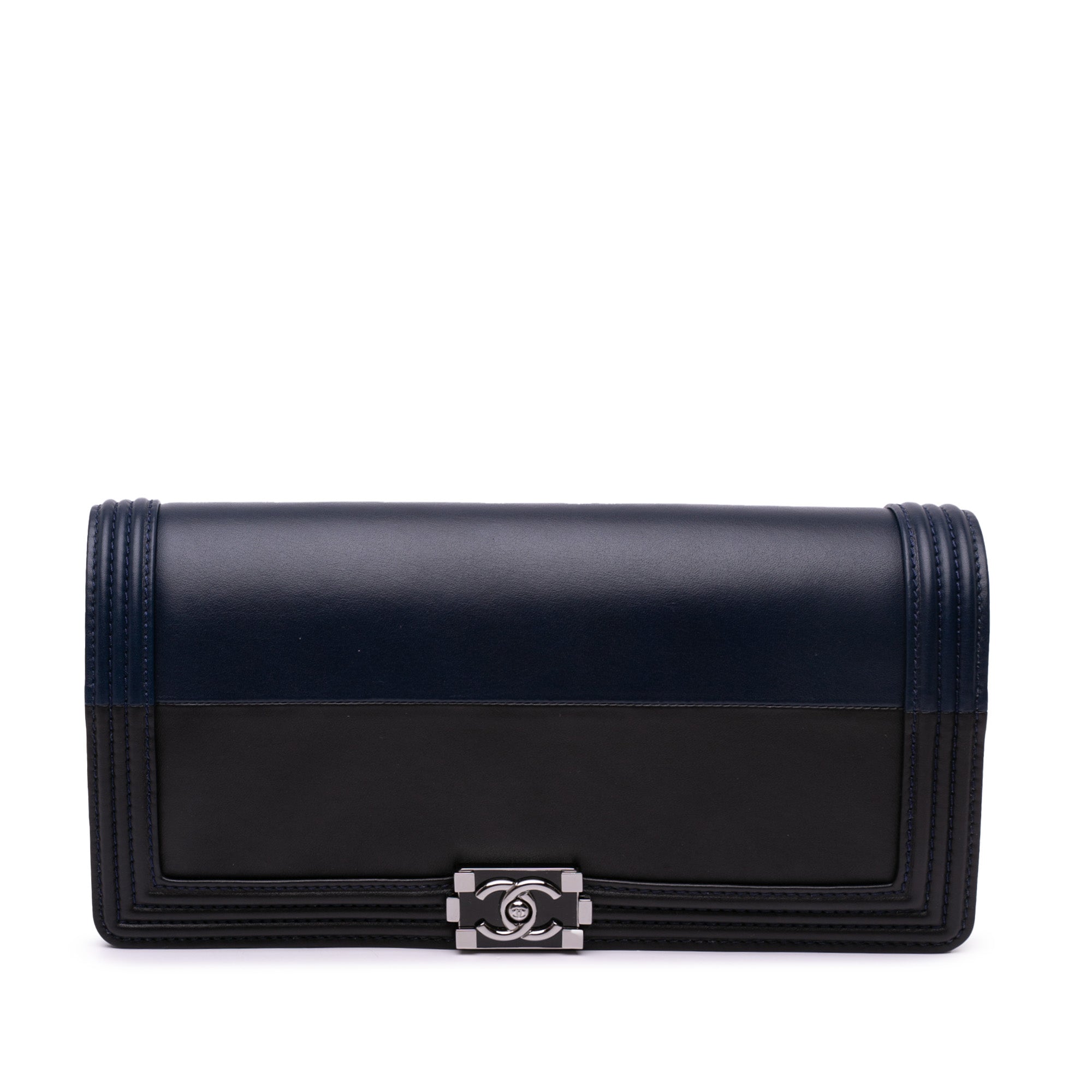 Product Details: Black Chanel Bicolor Lambskin Boy Clutch. This clutch features a lambskin leather body, a flap with push lock closure, and an interior slip pocket. 55.1" L x 10.6" W x 1.6" D. Serial number 21660094.