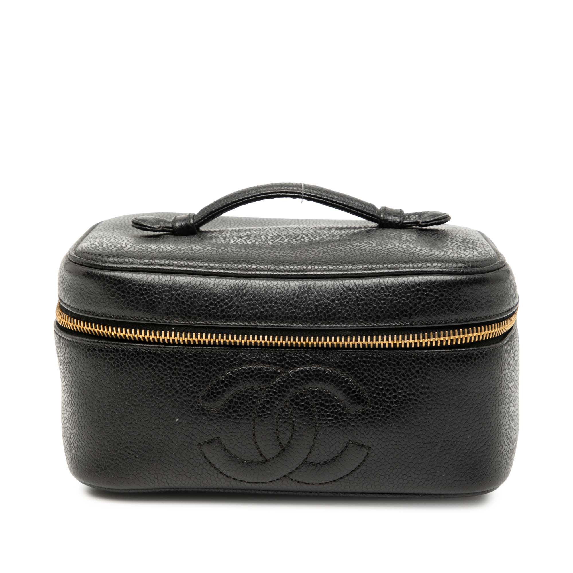 Product Details: Black Chanel CC Caviar Vanity Bag. This vanity bag features a caviar leather body, a flat top handle, a zip-around closure, and an interior slip pocket. 3.9" L x 7.5" W x 5.3" D, 1" drop. Serial number 2880617.