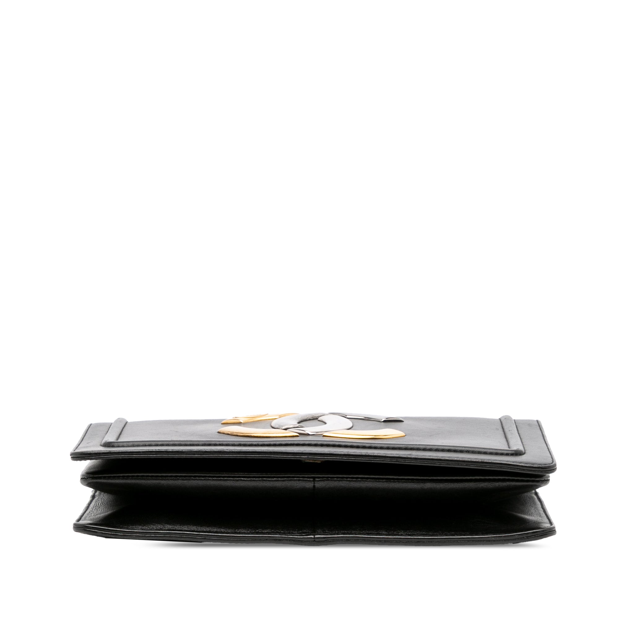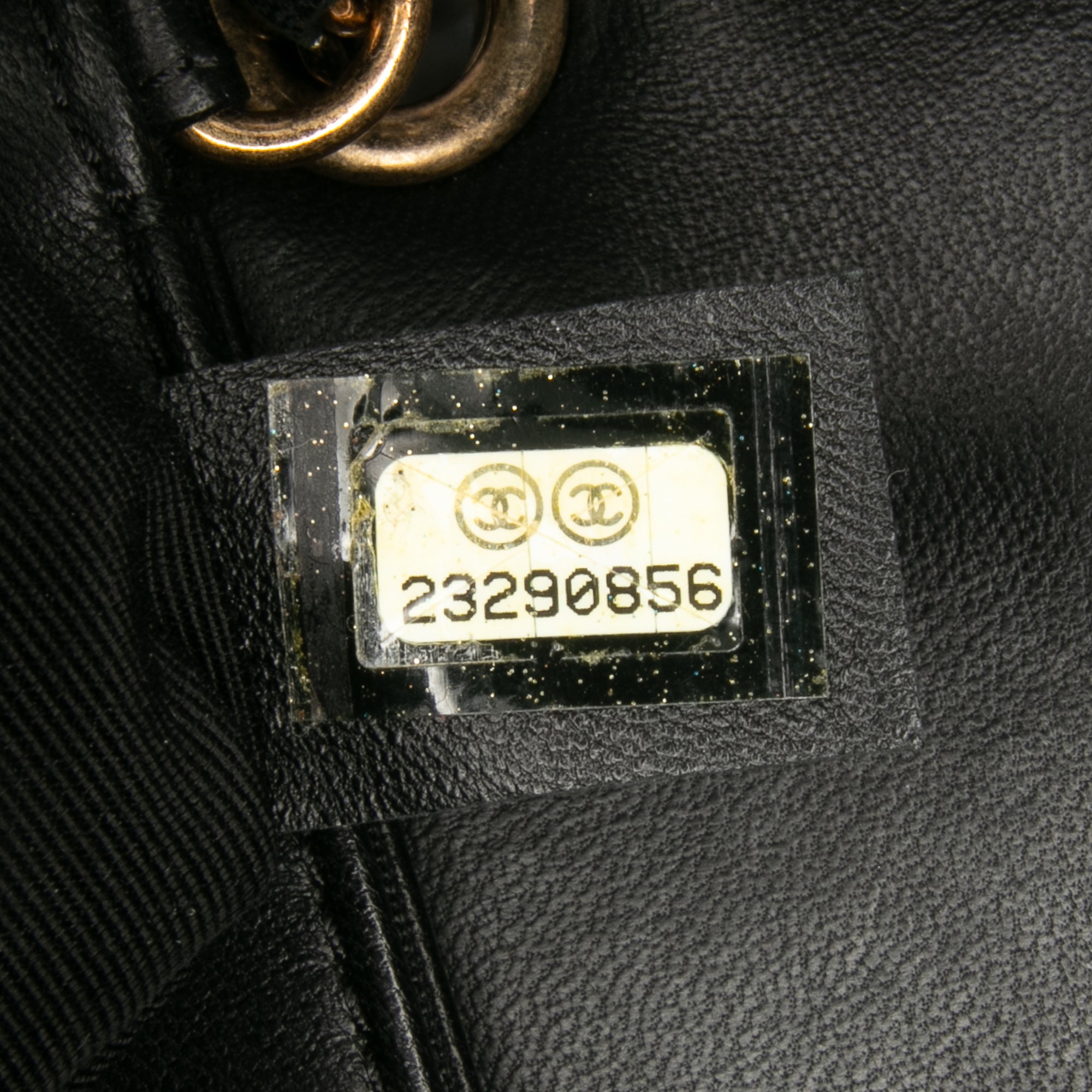 Product Details: Black Chanel Lambskin CC Antico Flap Crossbody Bag. This crossbody bag features a smooth lambskin leather body, a leather-woven chain strap with leather guard, a front flap with magnetic snap closure, and interior slip compartments. 5.9" L x 9.8" W x 0.8" D. Serial number 23290856.