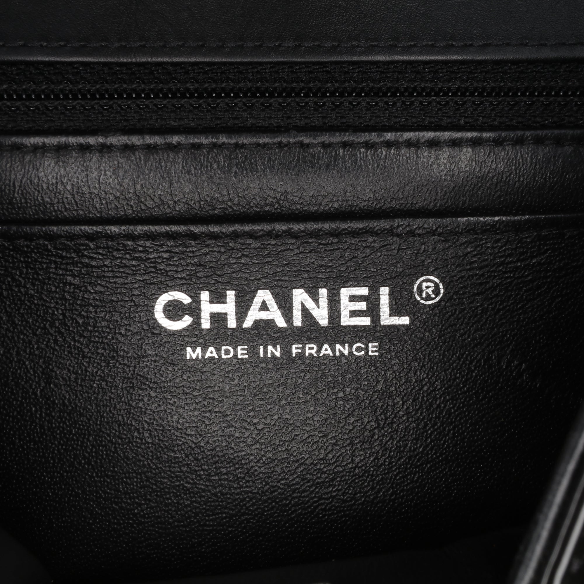 Product Details: Black Chanel Mini Square Classic Patent So Black Single Flap Crossbody Bag. This flap bag features a quilted patent leather body with black hardware, a leather woven chain link shoulder strap, a front flap with interlocking Cs and a twist lock closure, an exterior back slip pocket, and interior zip and slip pockets. 5.1" L x 6.3" W x 3" D. Serial number GJCEE4L2.