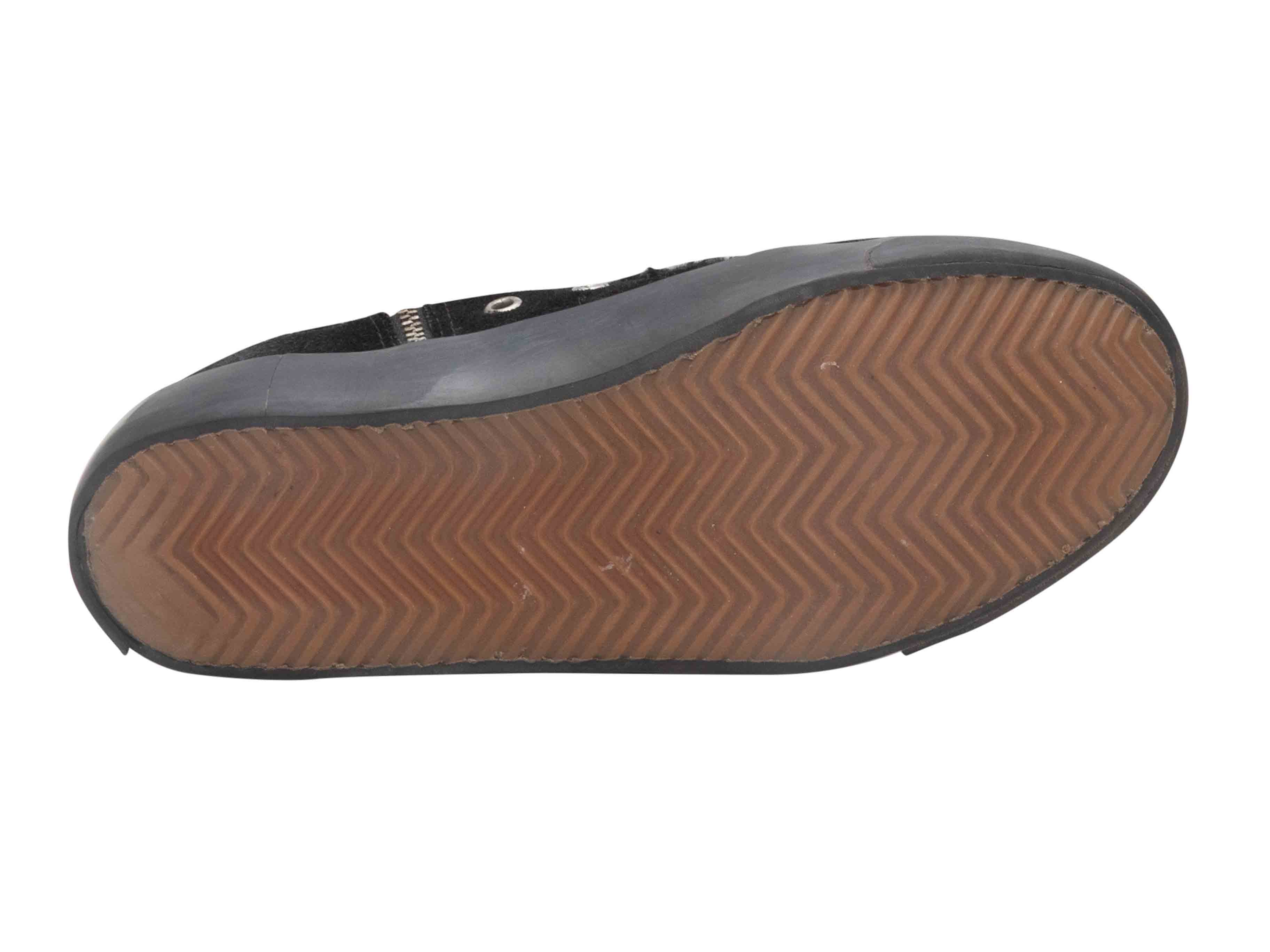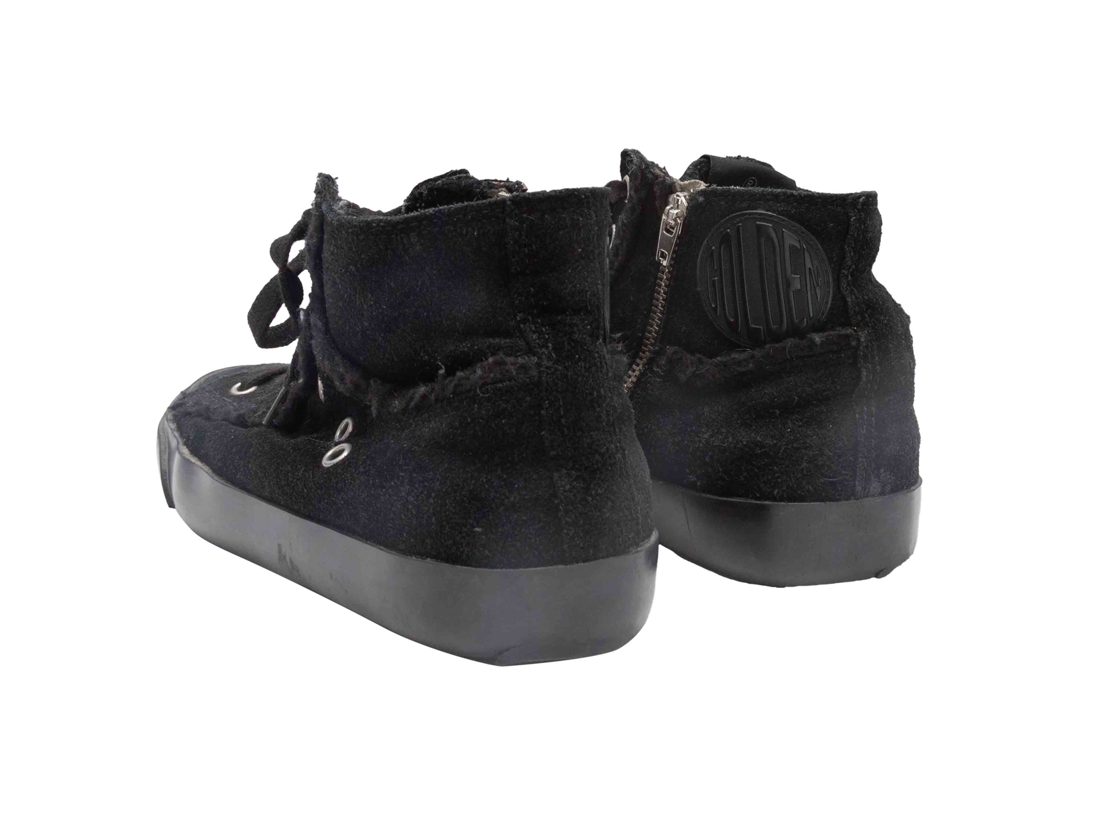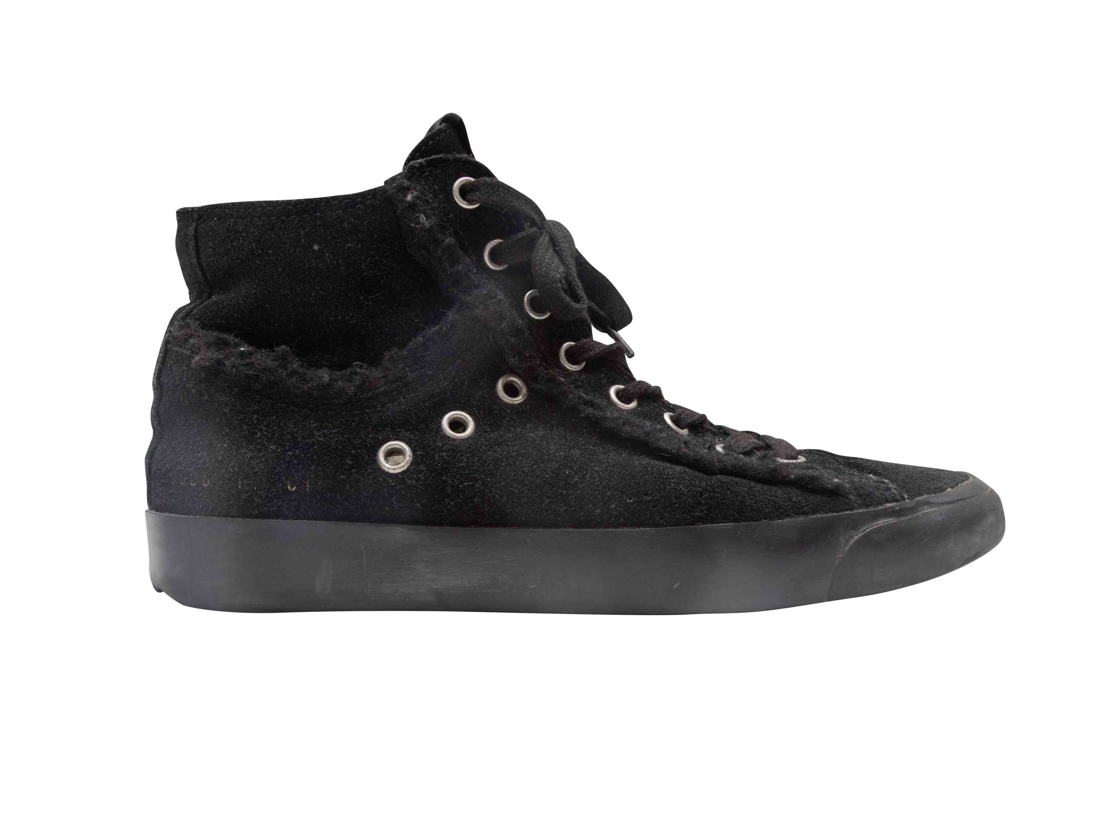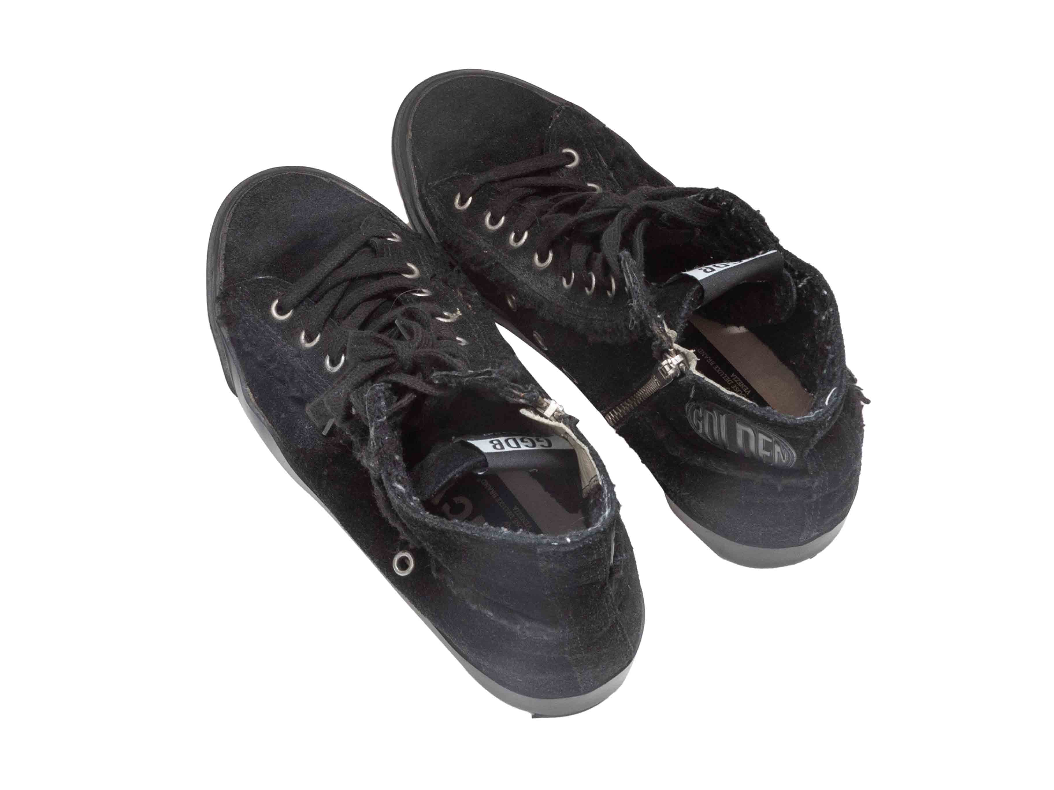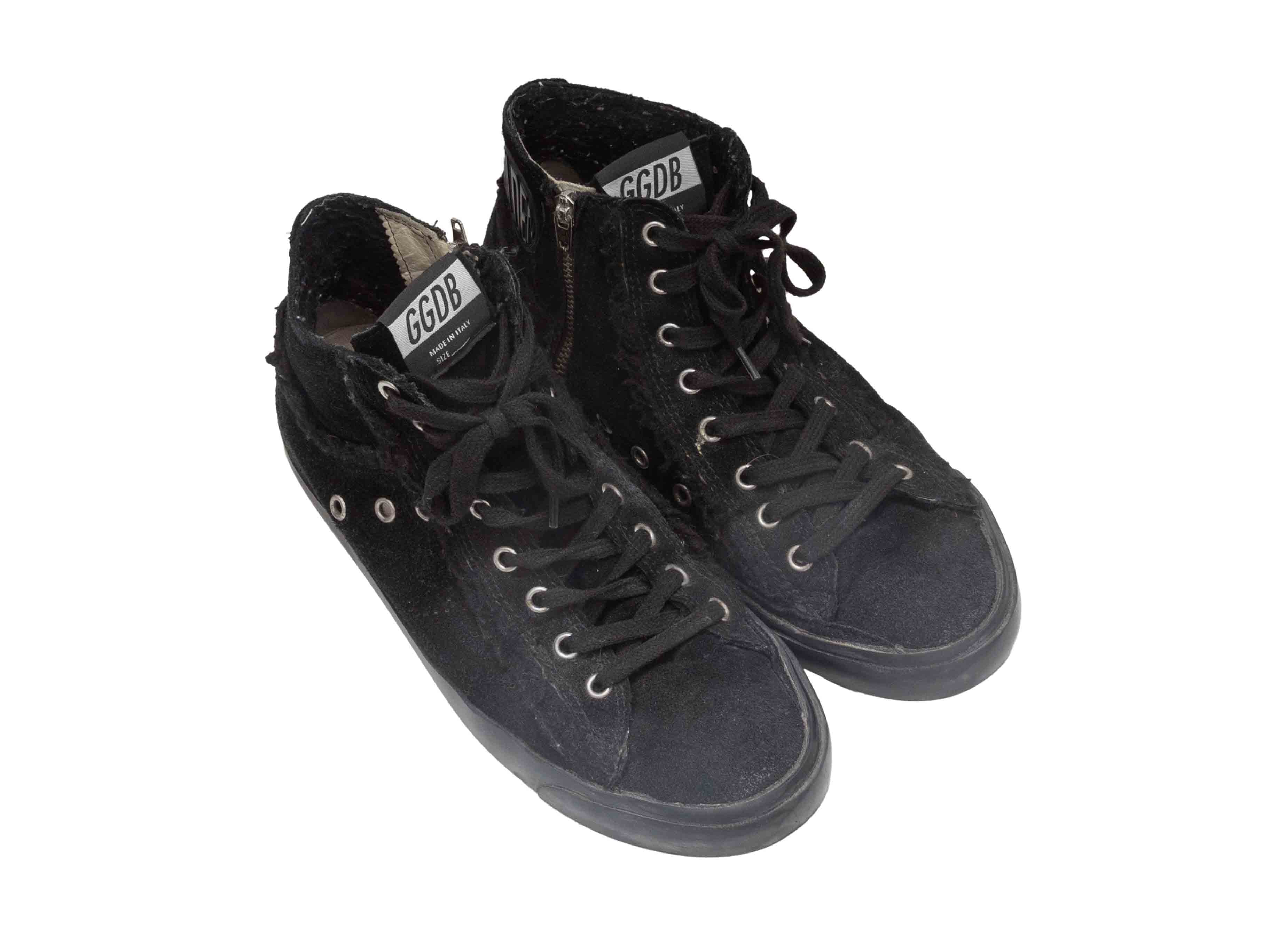 Product Details: Black hightop sneakers by Golden Goose. Rubber soles. Lace-up tie accents at tops. Zip closures at inner sides. 4" shaft height, 1" heel height.
