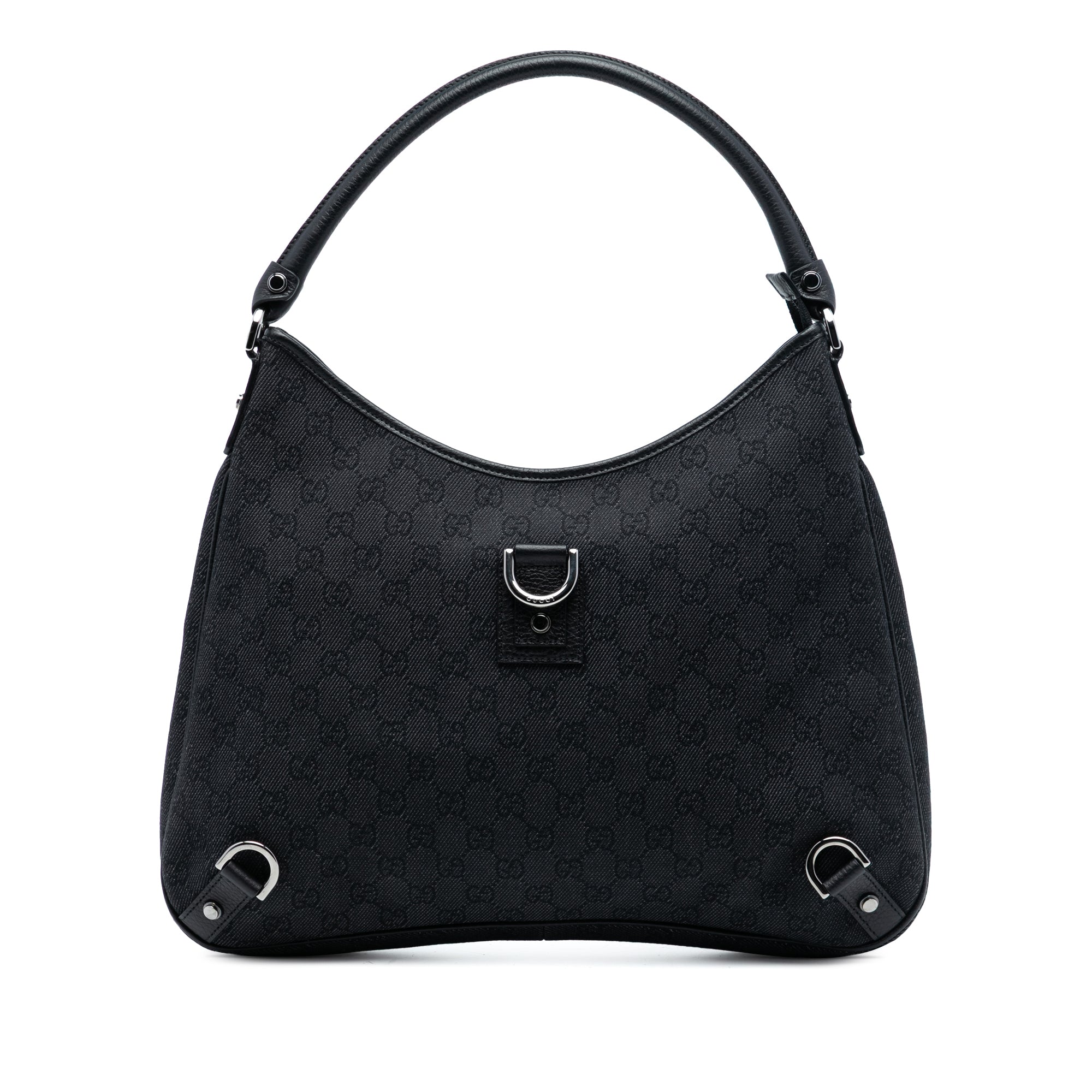 Product Details: Black Gucci GG Canvas Abbey D Ring Shoulder Bag. The Abbey shoulder bag features a canvas body with leather trim, a rolled leather handle, a top zip closure, and interior zip and slip pockets. 12.4" L x 15.2" W x 1.8" D. Serial number 268636 498879.