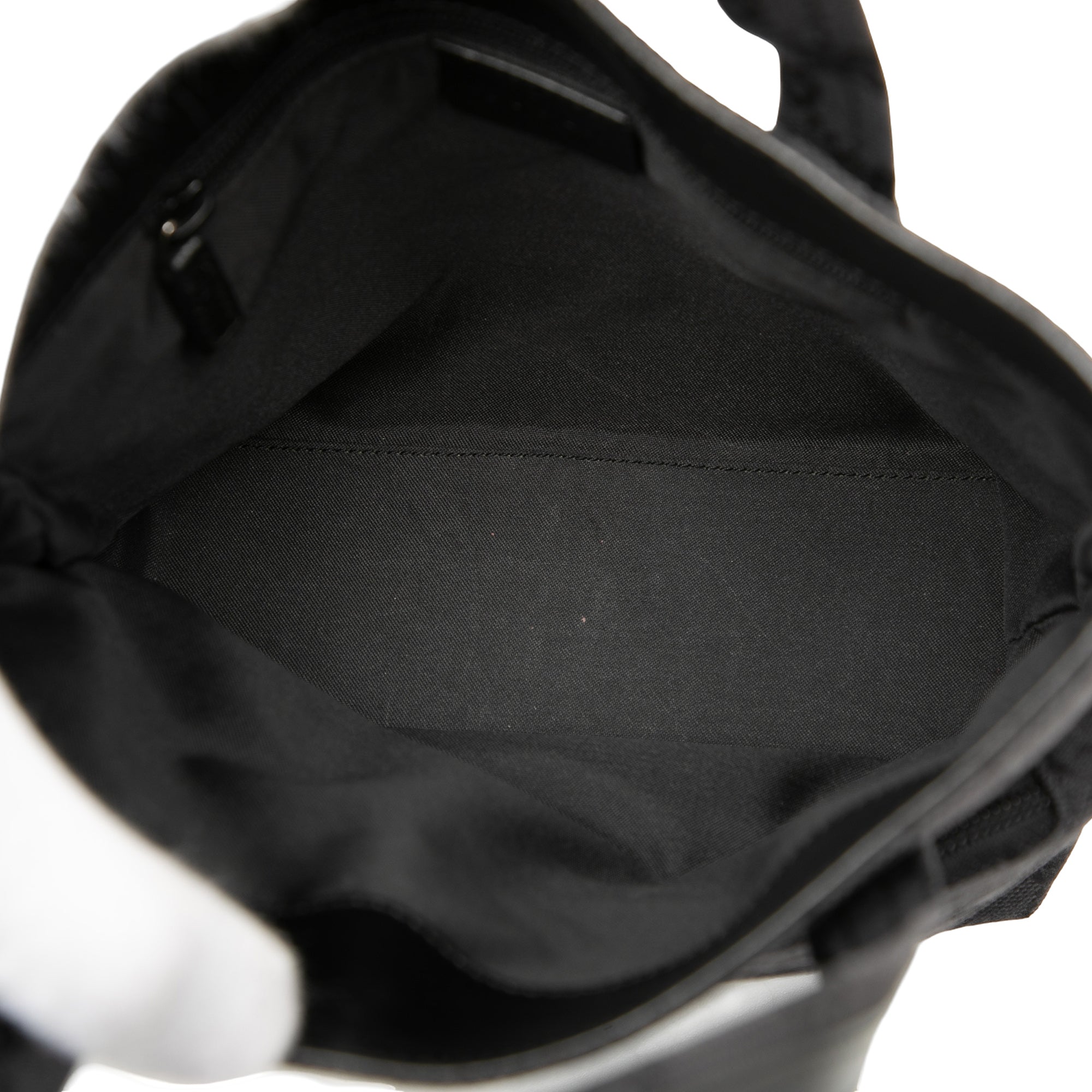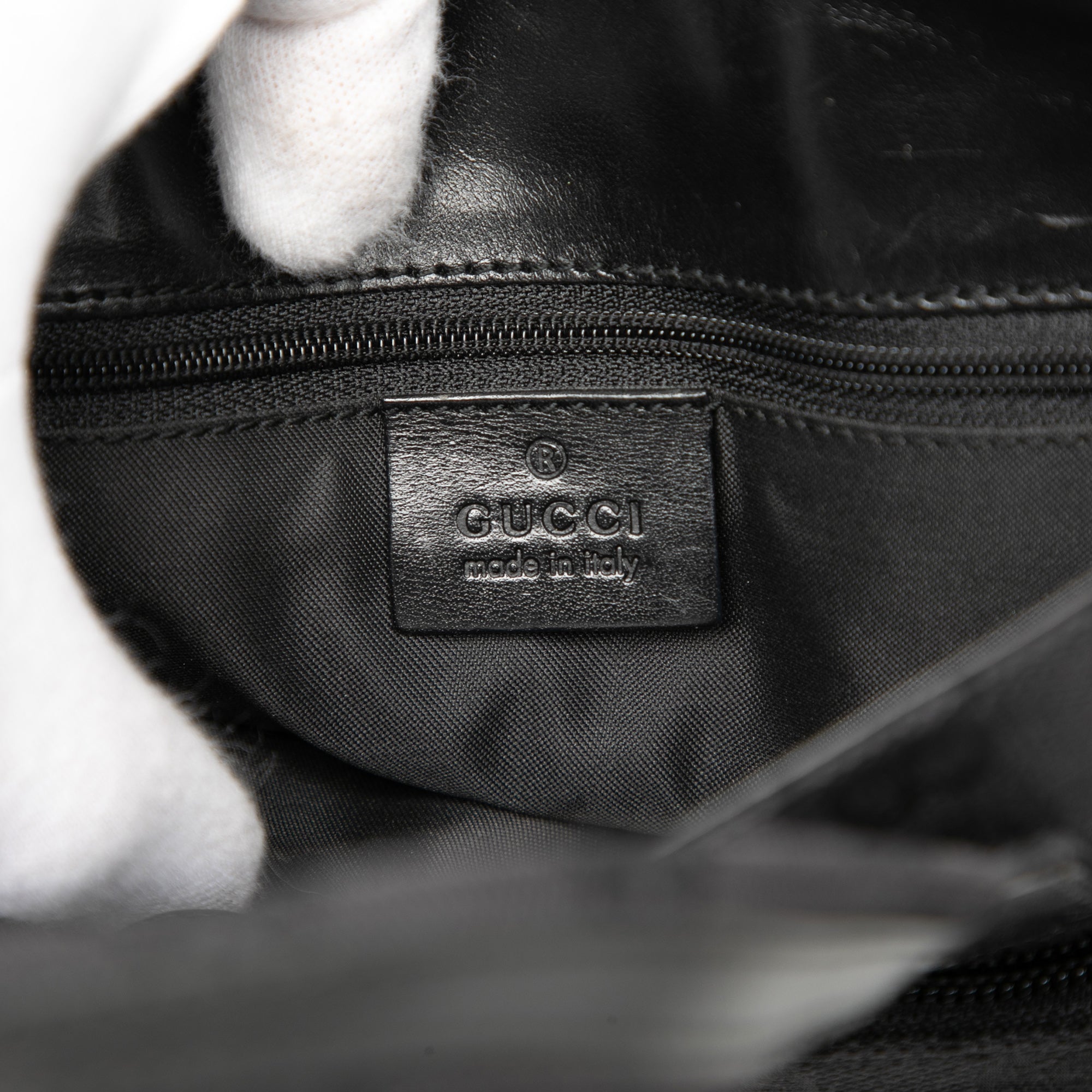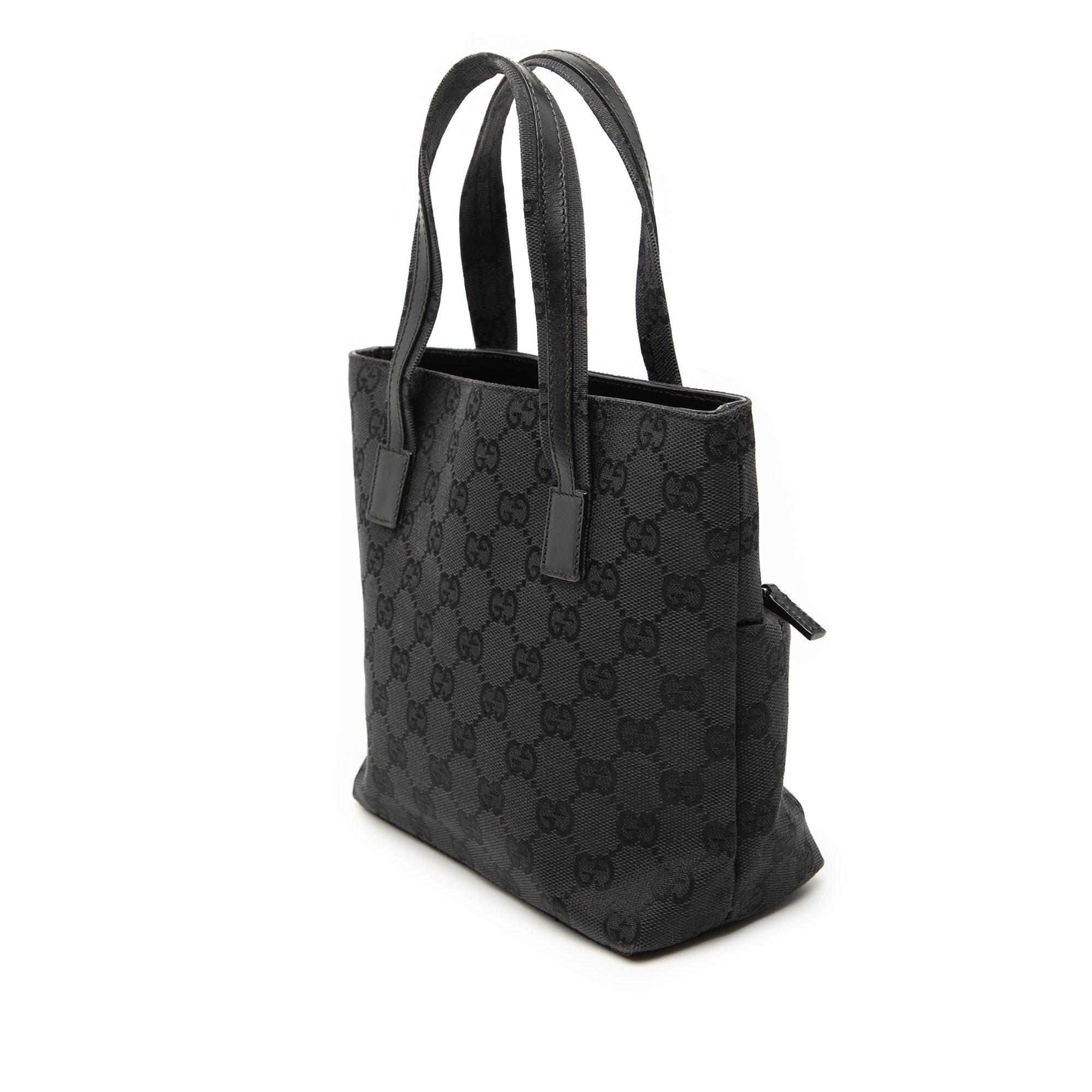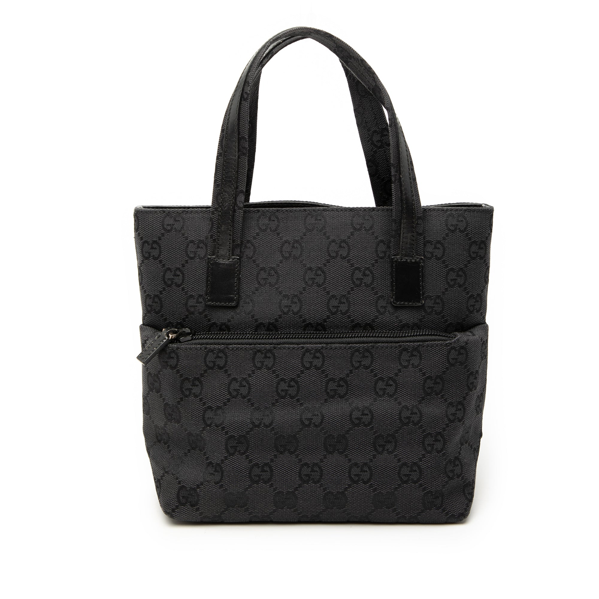 Product Details: Black Gucci GG Canvas Handbag. This handbag features a canvas body, flat leather handles, a top zip closure, an exterior front zip pocket, and an interior zip pocket. 7.5" L x 7.1" W x 3.5" D, 4.1" drop. Serial number 002 1079 001998.