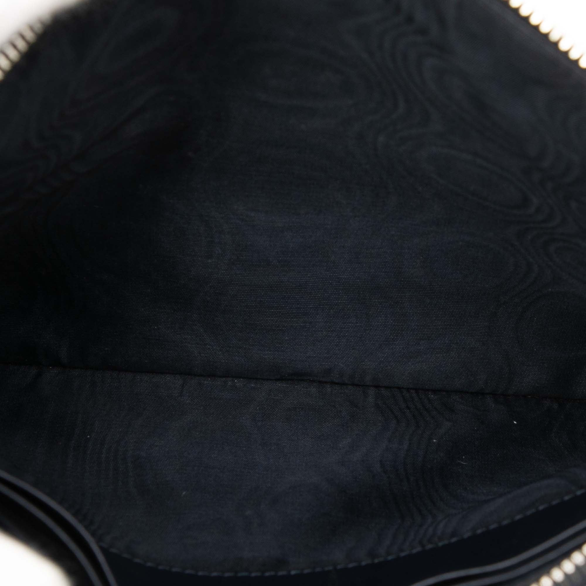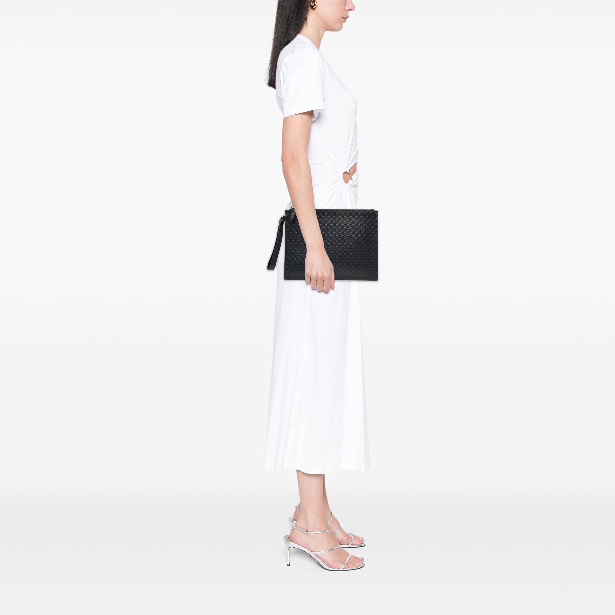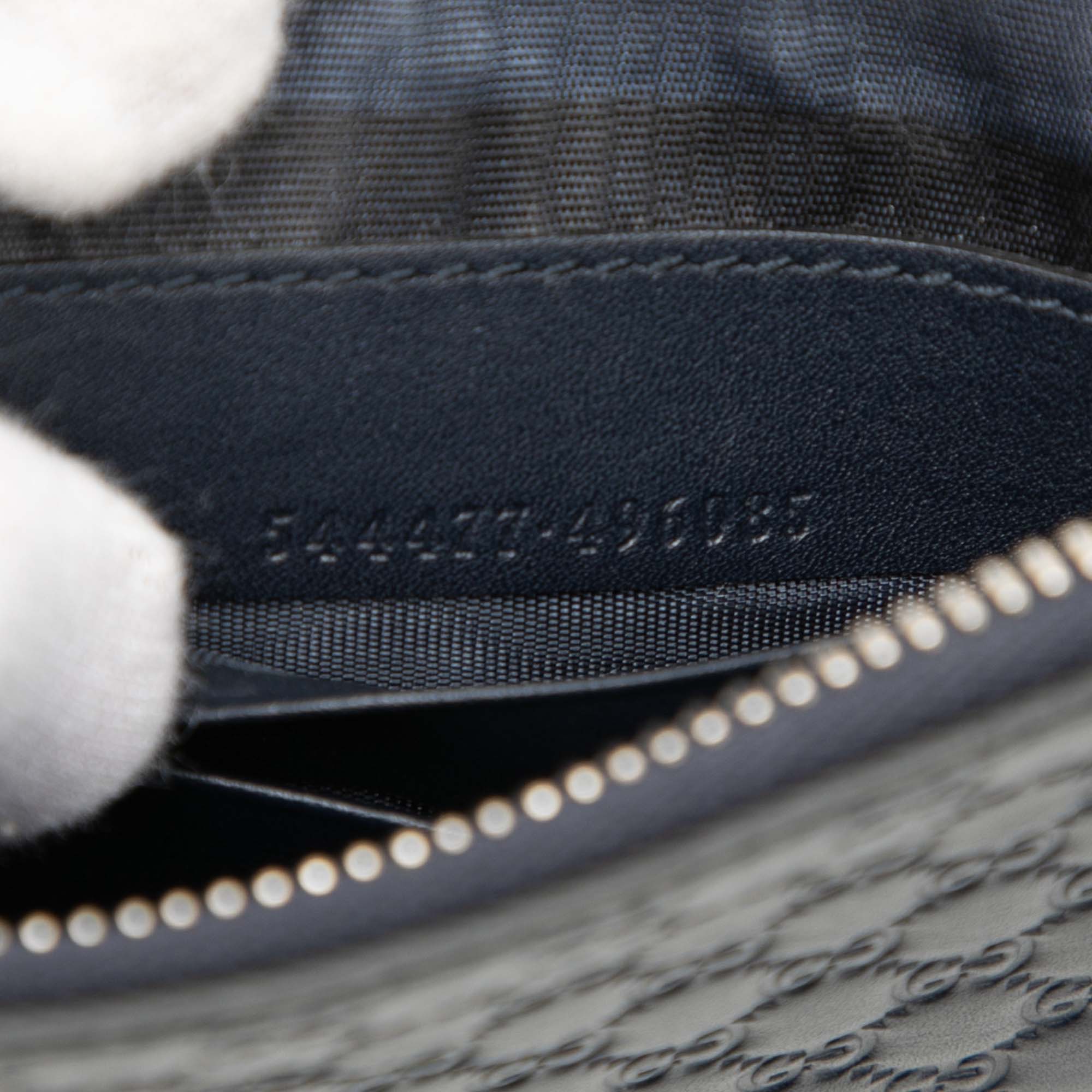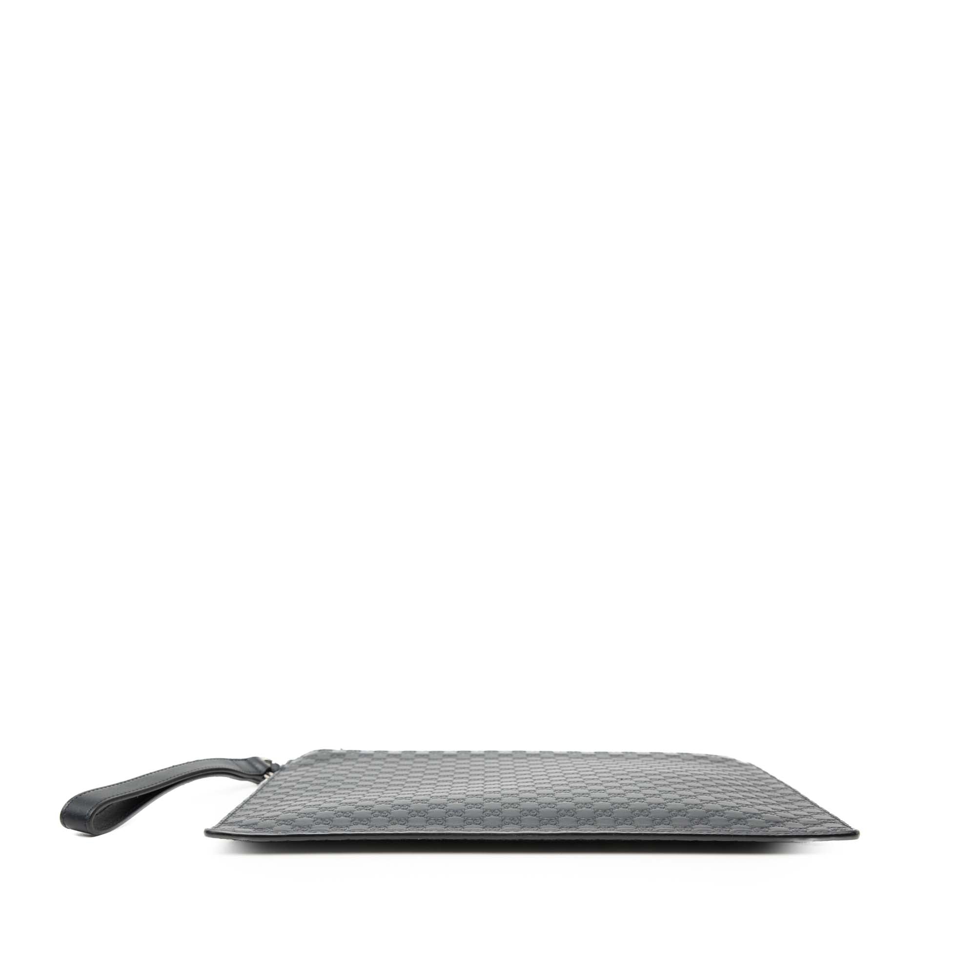 Product Details: Black Gucci Microguccissima Clutch. This clutch bag features an embossed leather body, a flat leather wrist strap, a top zip closure, and interior slip pockets. 8.1" L x 11" W x 0.2" D, 6.3" drop. Serial number 544477 496085.