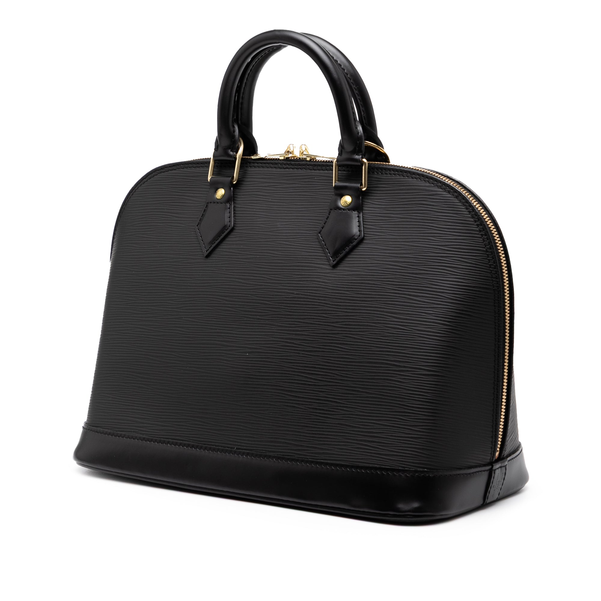 Product Details: Black Louis Vuitton Epi Alma PM Handbag. The Alma PM features an epi leather body, rolled handles, a top zip closure and an interior slip pocket. 9.4" L x 12" W x 6.5" D, 3.1" drop. Serial number AR0041.