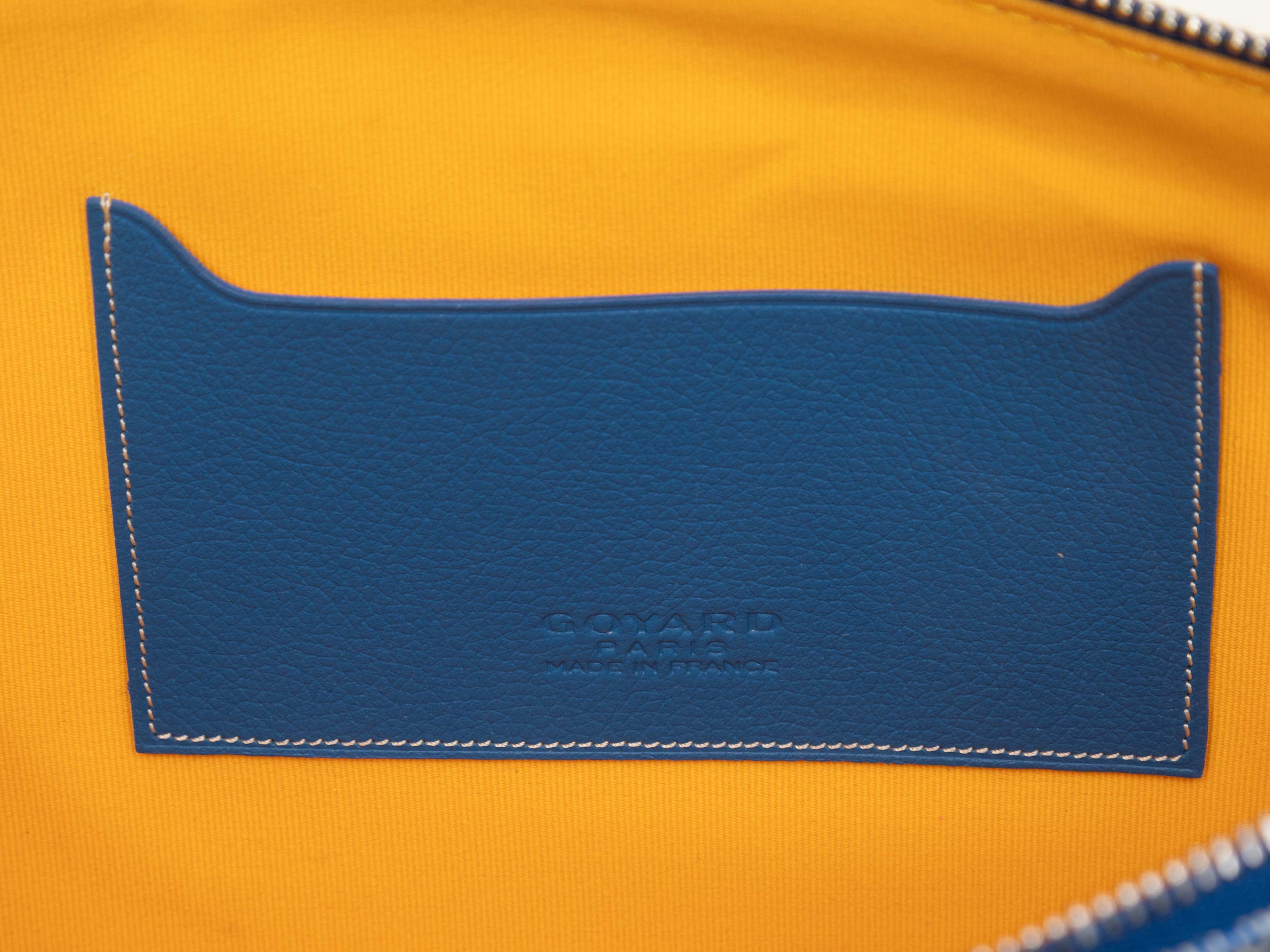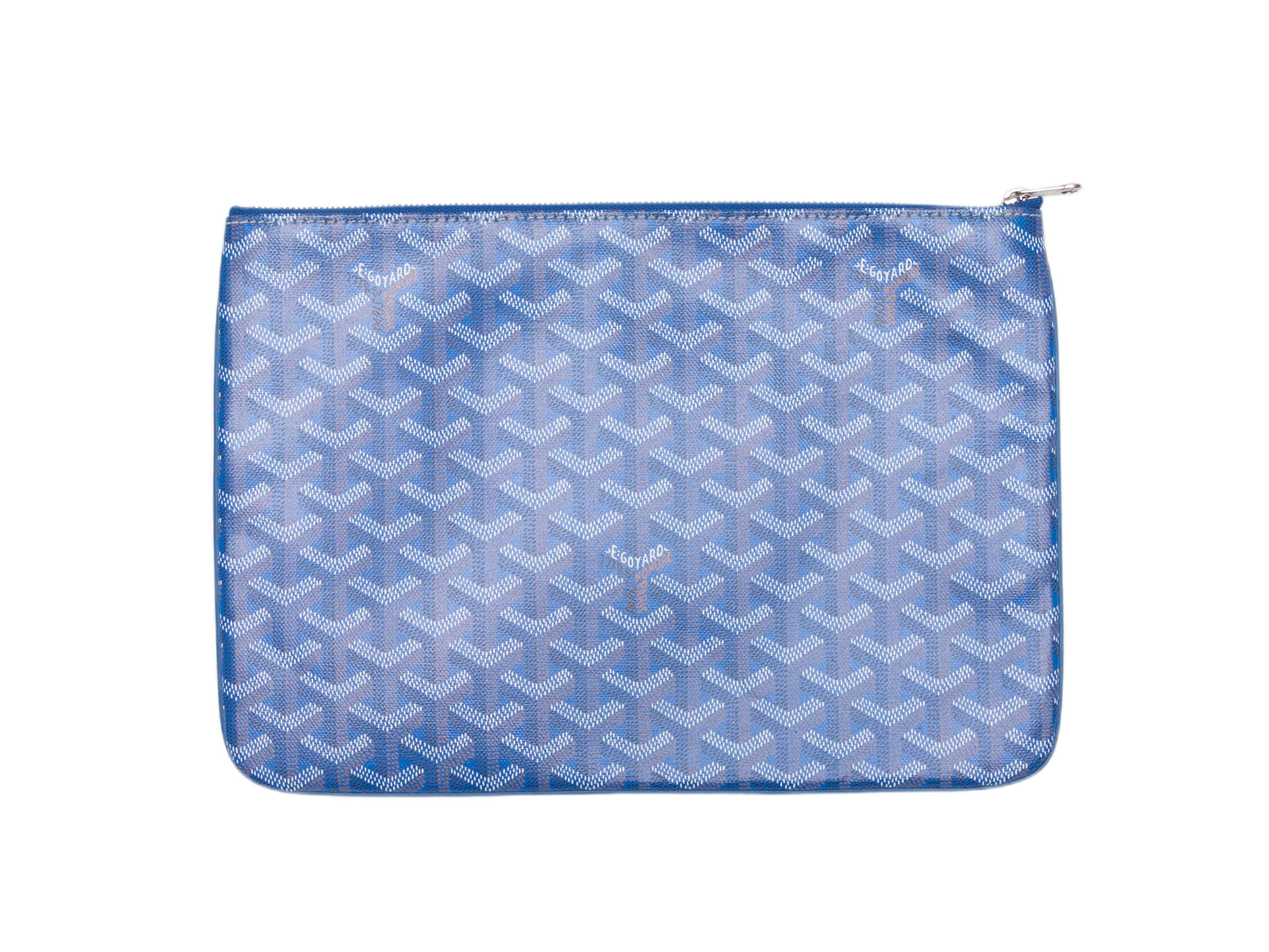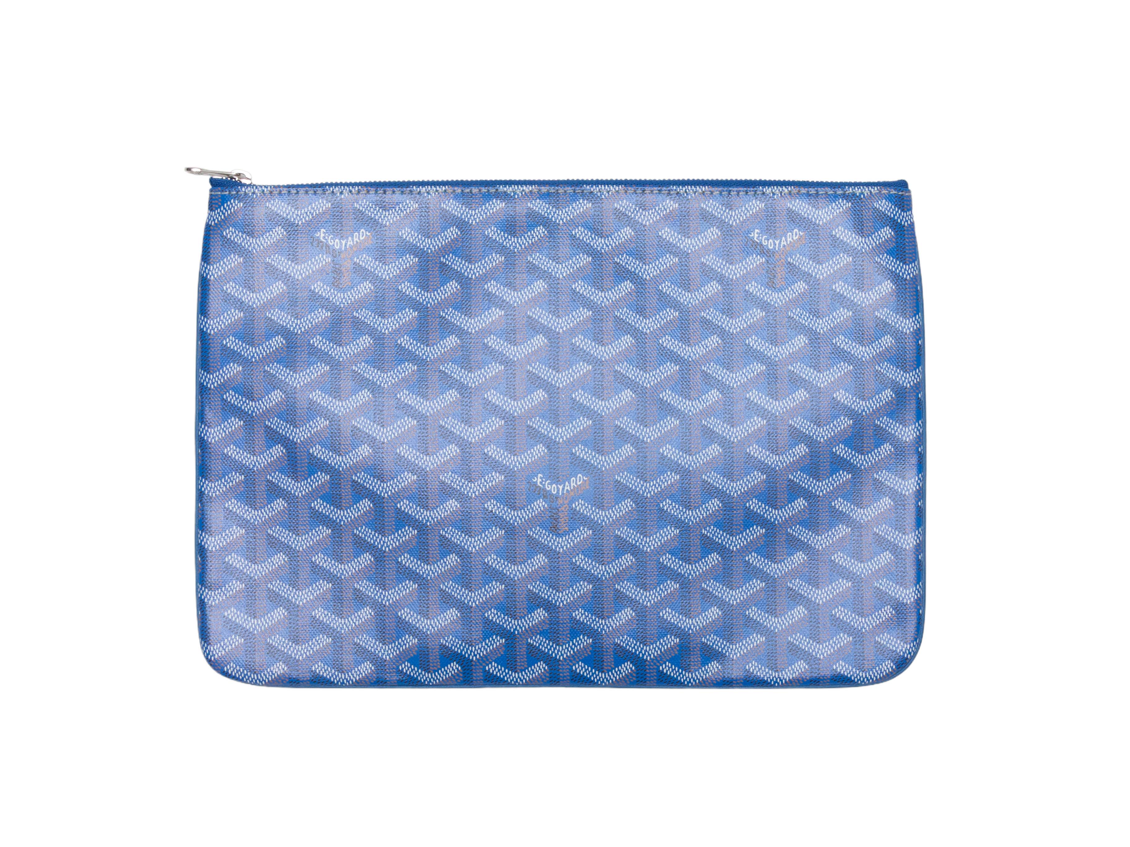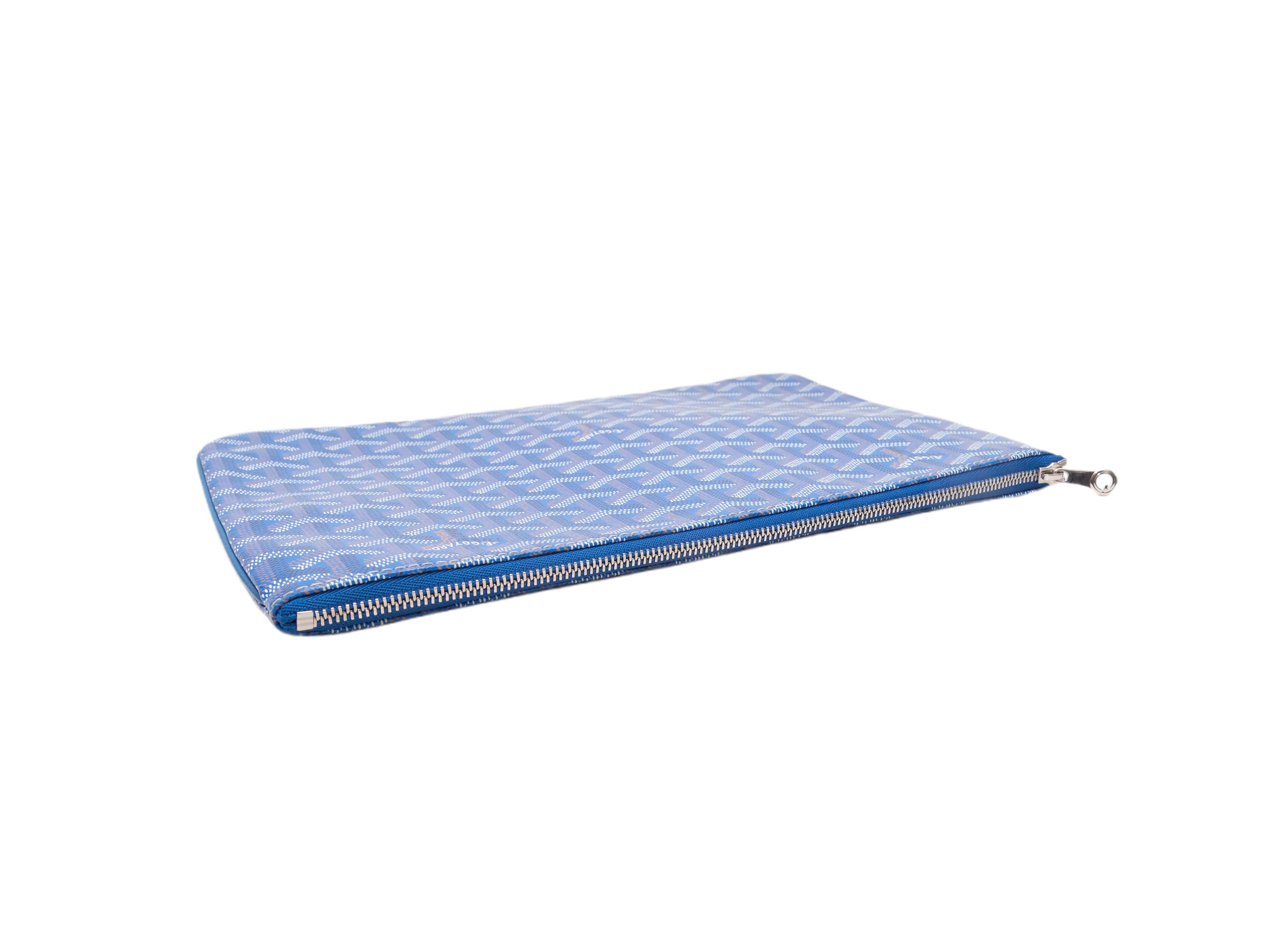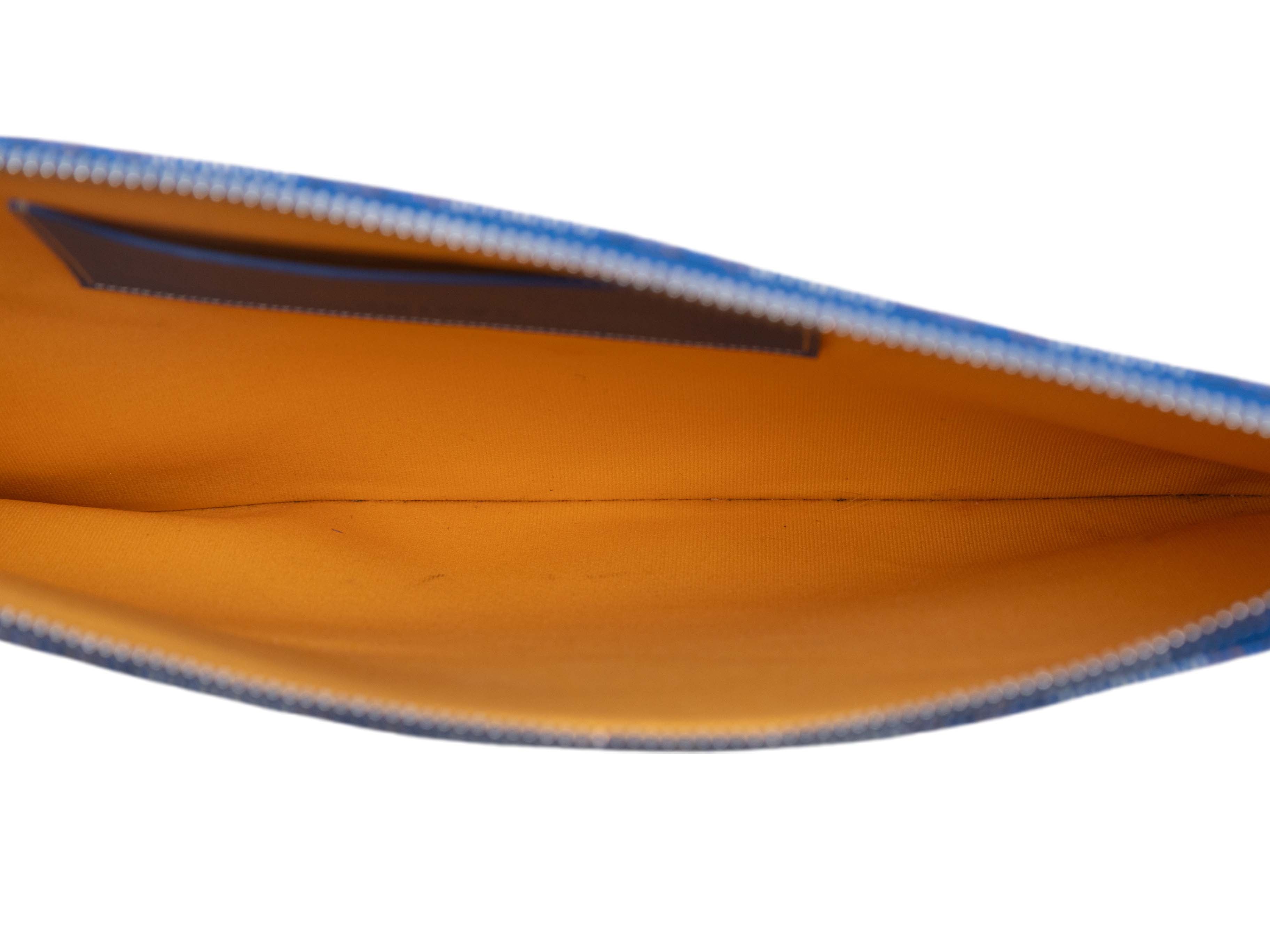 Product Details: Blue & Multicolor Goyard Senat MM Zip Pouch. The Senat MM Zip Pouch features a monogram leather body and a top silver-tone zip closure. 11.5" L x 8" H.