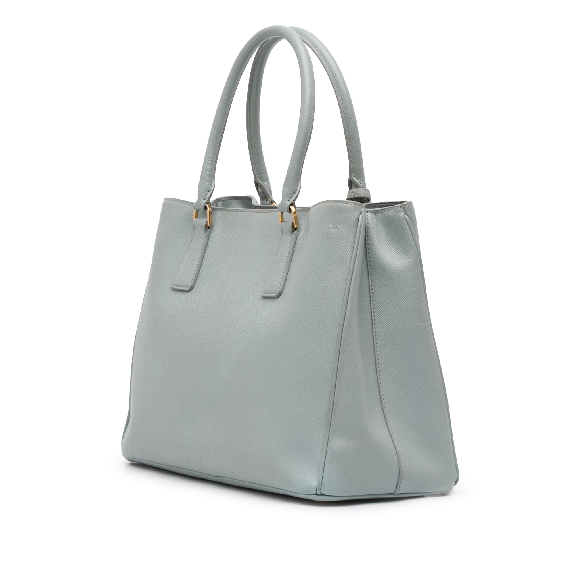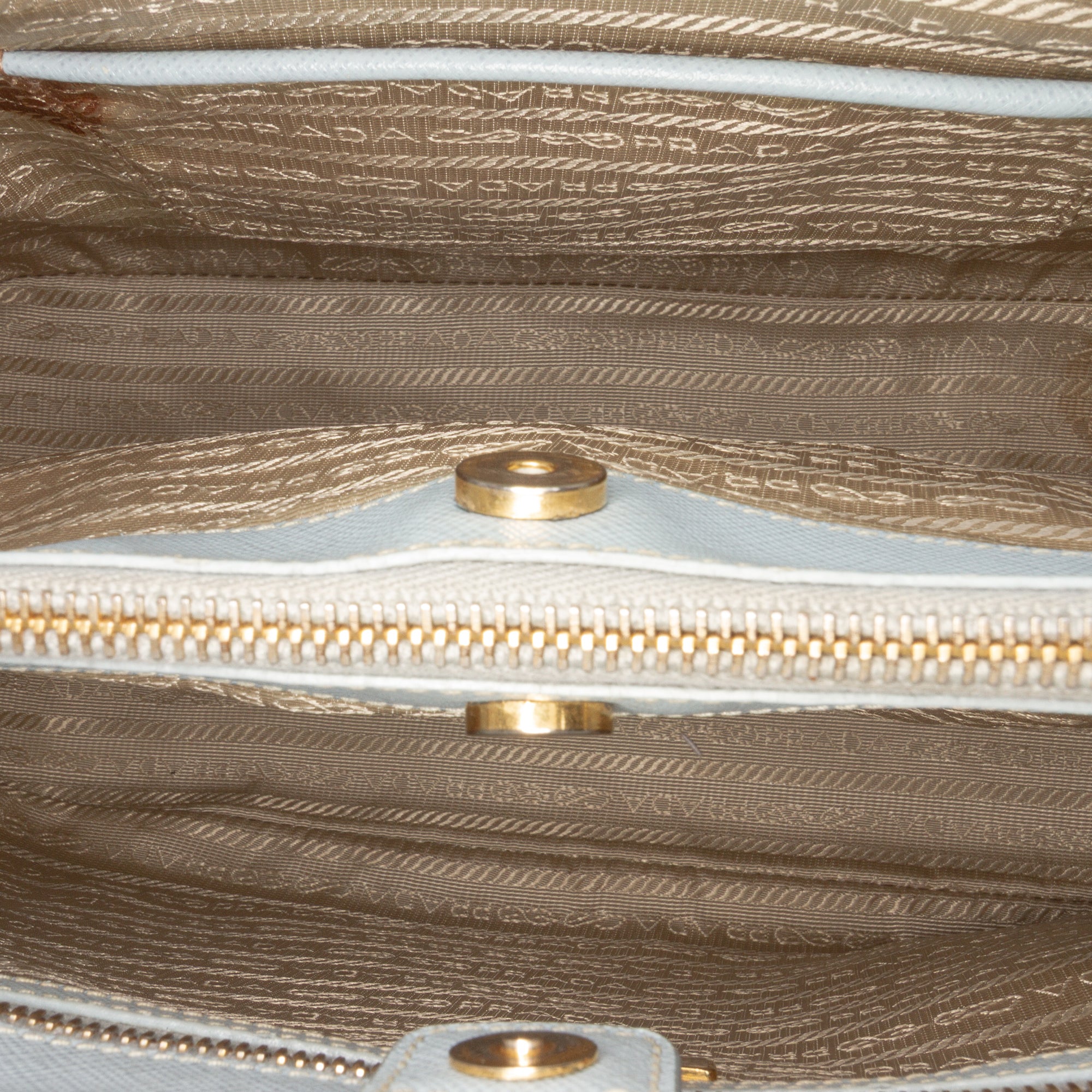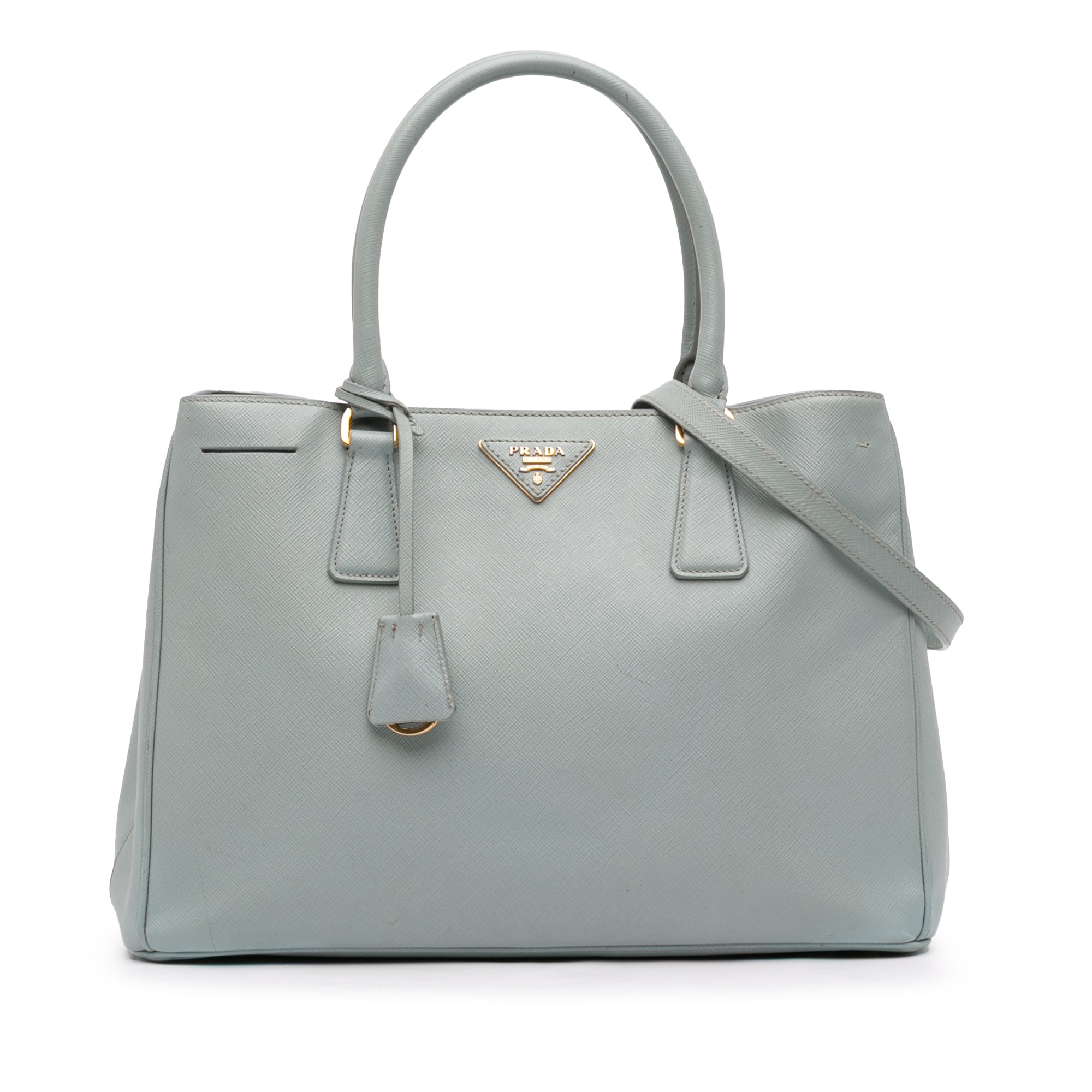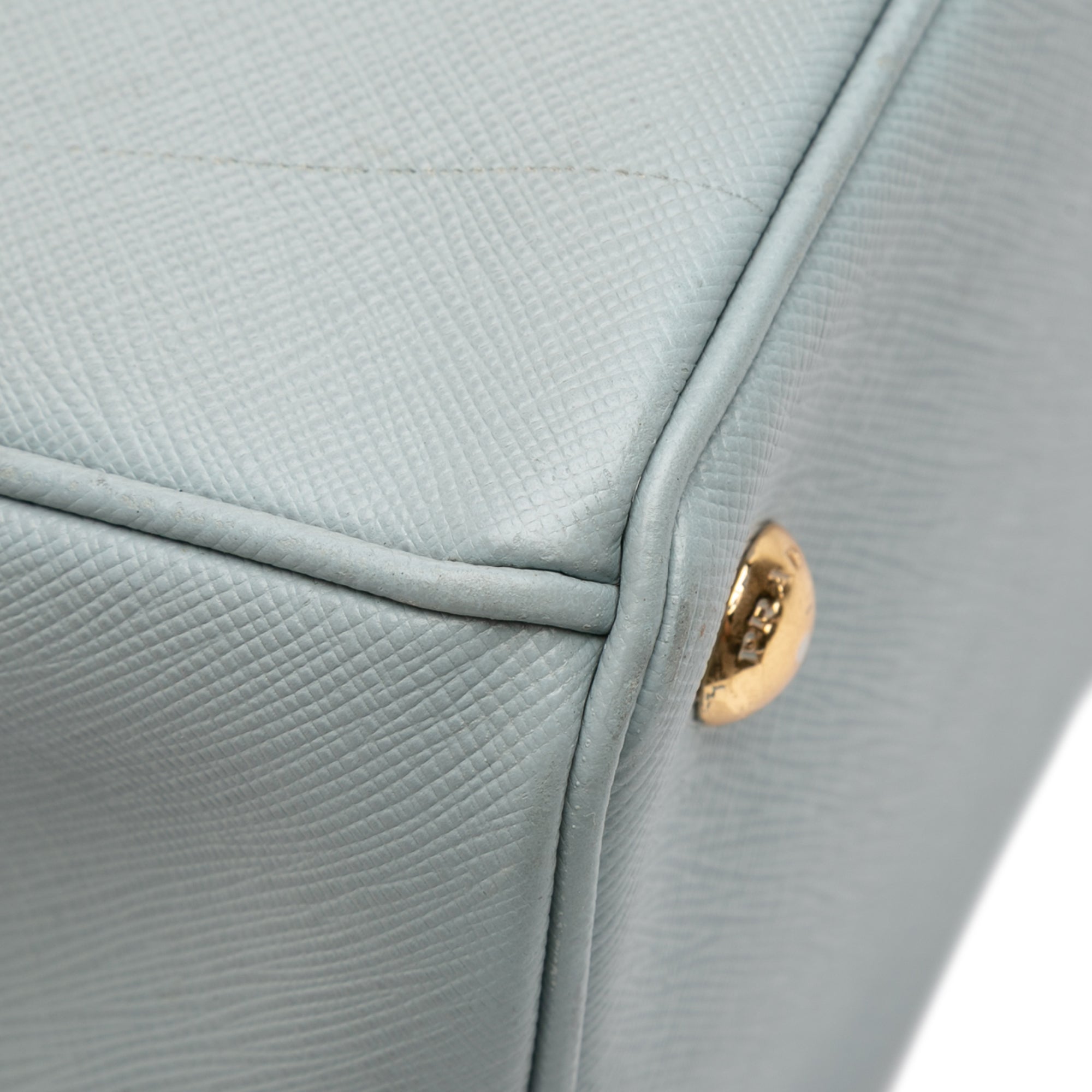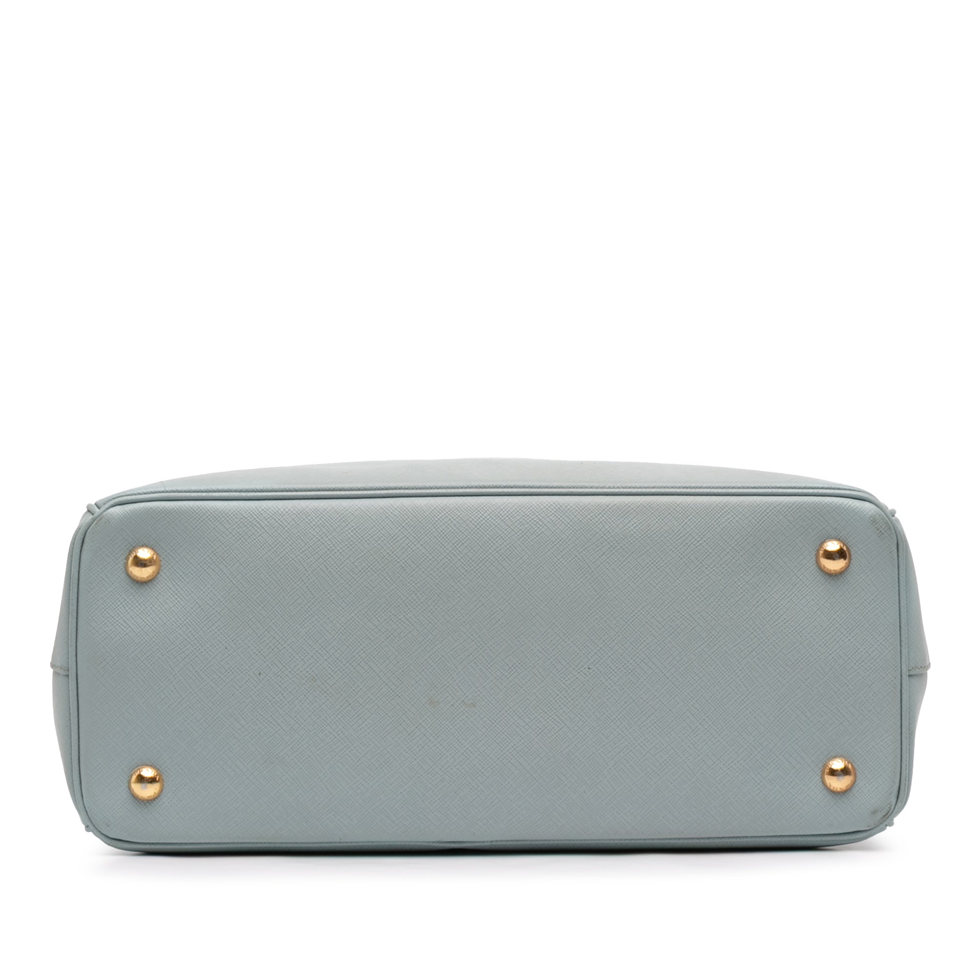 Product Details: Blue Prada Medium Saffiano Lux Galleria Satchel. The Galleria features a saffiano leather body, rolled leather handles, a detachable flat leather strap, an open top with magnetic snap closure, an interior center zip compartment, and interior zip and slip pockets. Exterior bottom and corners has been repainted. 9.1" L x 13.2" W x 5.7" D, 5.9" drop.