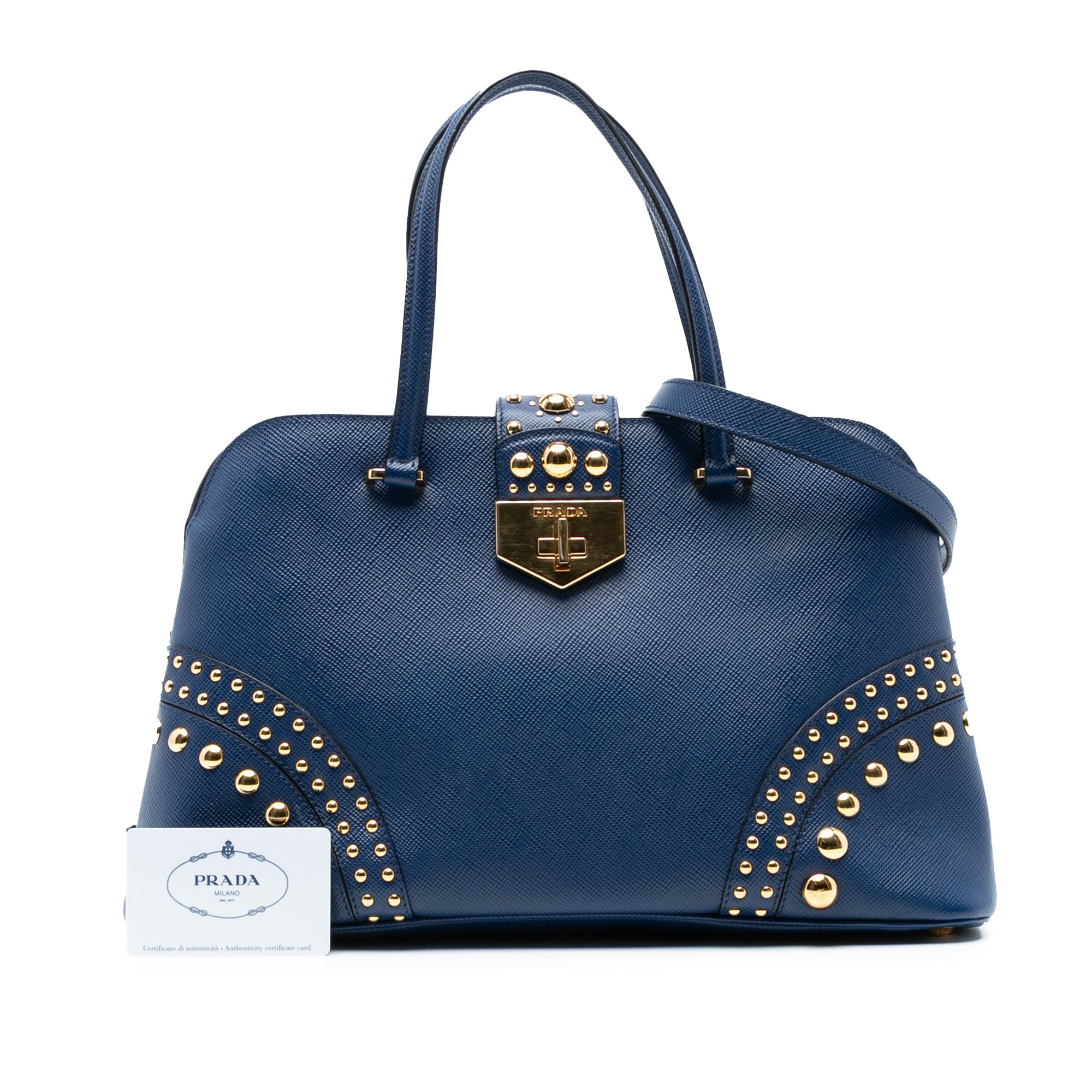Blue Prada Studded Saffiano Cuir Promenade Satchel