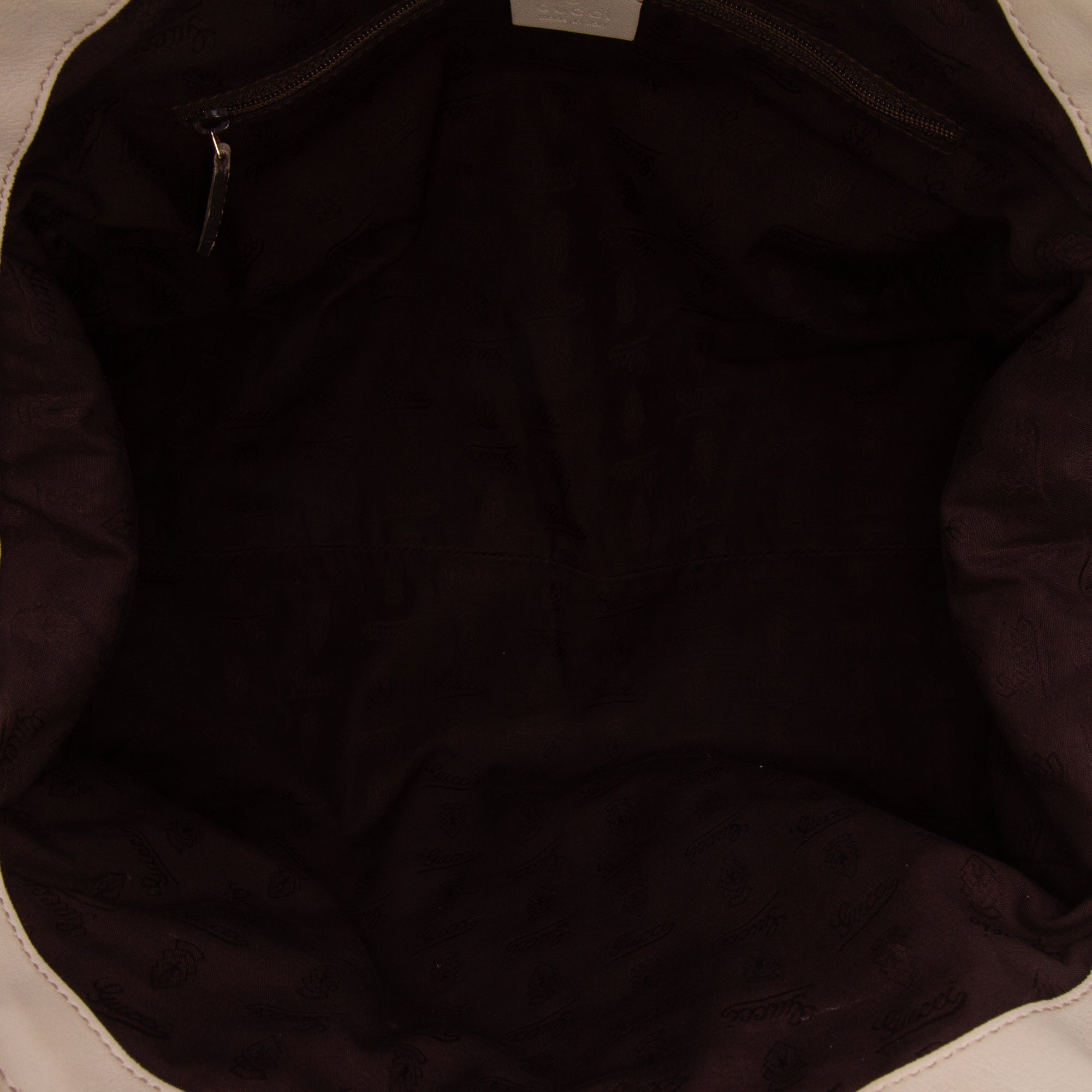 Product Details: Beige Gucci Guccissima Sukey Satchel. The Sukey satchel features an embossed leather body, rolled leather top handles, a detachable flat leather shoulder strap, a top zip closure, and interior zip and slip pockets. 11.8" L x 13.2" W x 7.9" D, 6.7" drop. Serial number 223974 002122.