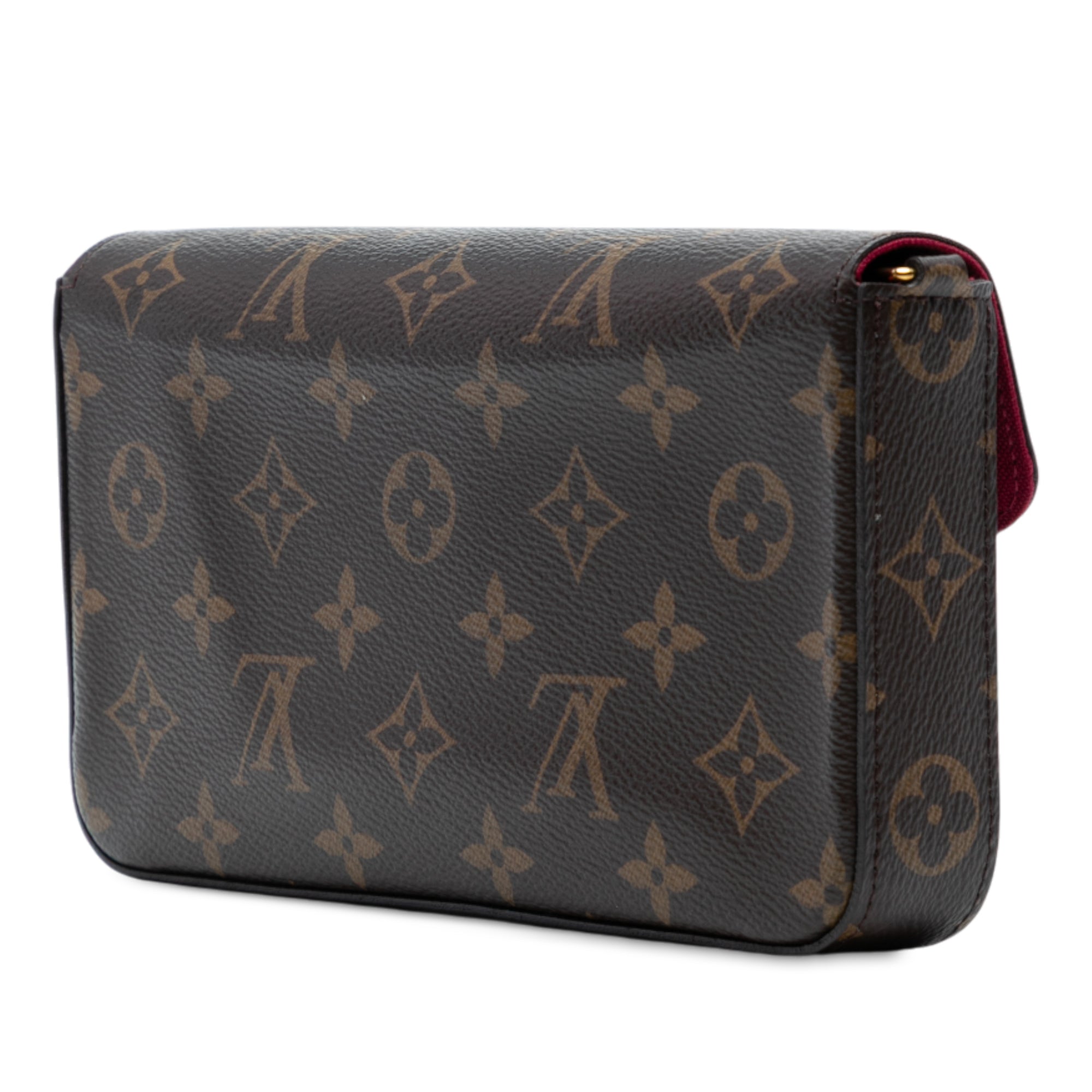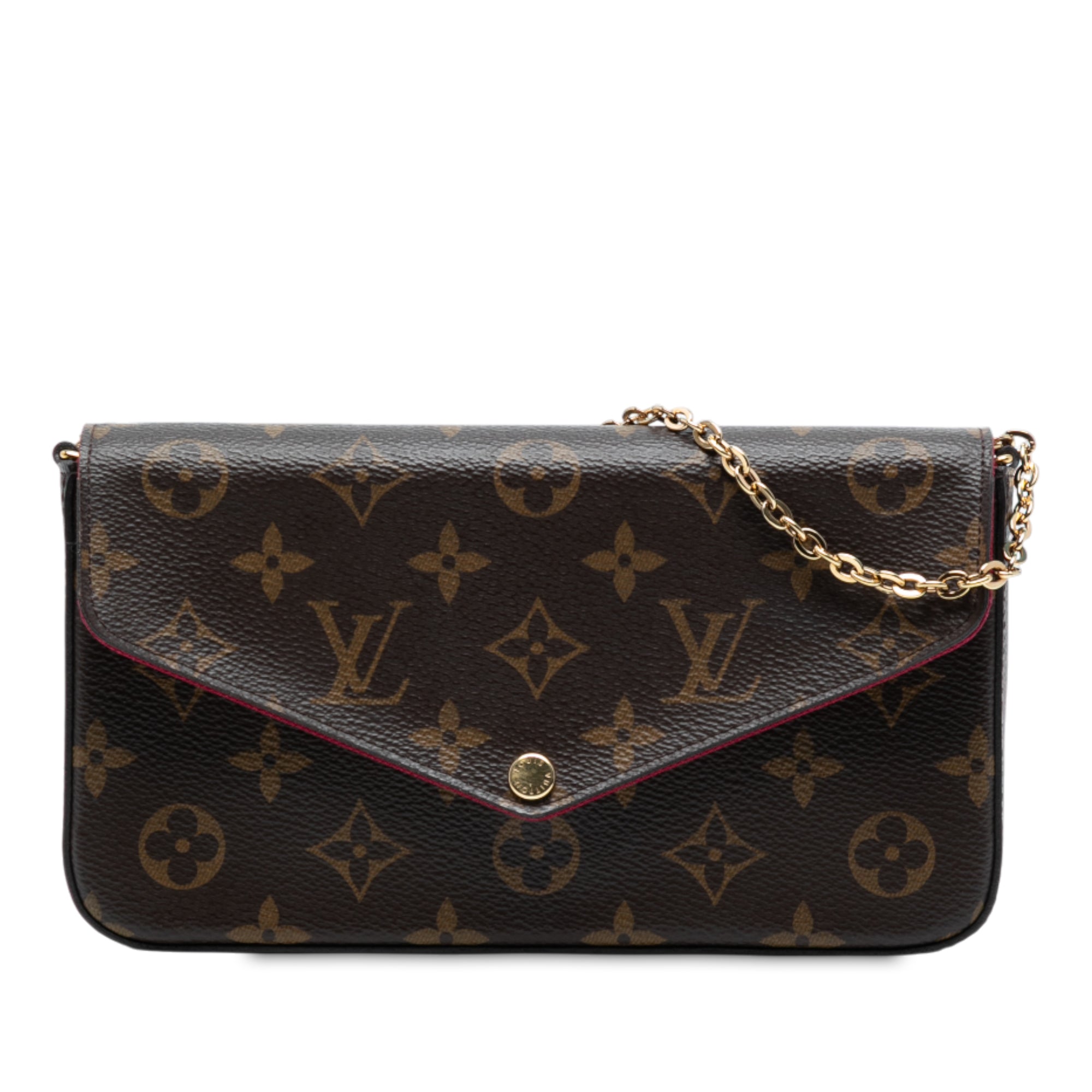 Product Details: Brown Louis Vuitton Monogram Pochette Felicie Crossbody Bag. The Pochette Felicie crossbody bag features a monogram canvas body, a detachable gold-tone chain shoulder strap, a top flap with snap closure, an interior slip pocket, and pouch inclusions. 5.1" L x 8.3" W x 1.2" D. Serial number TJ1200.