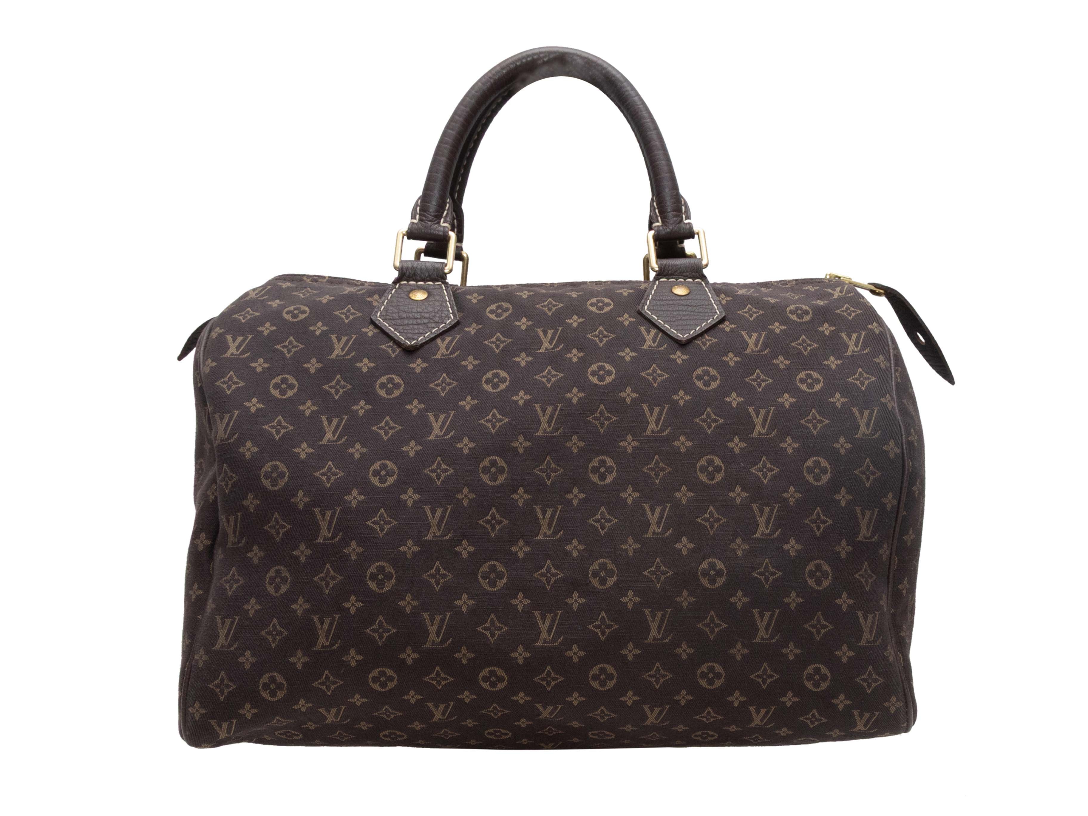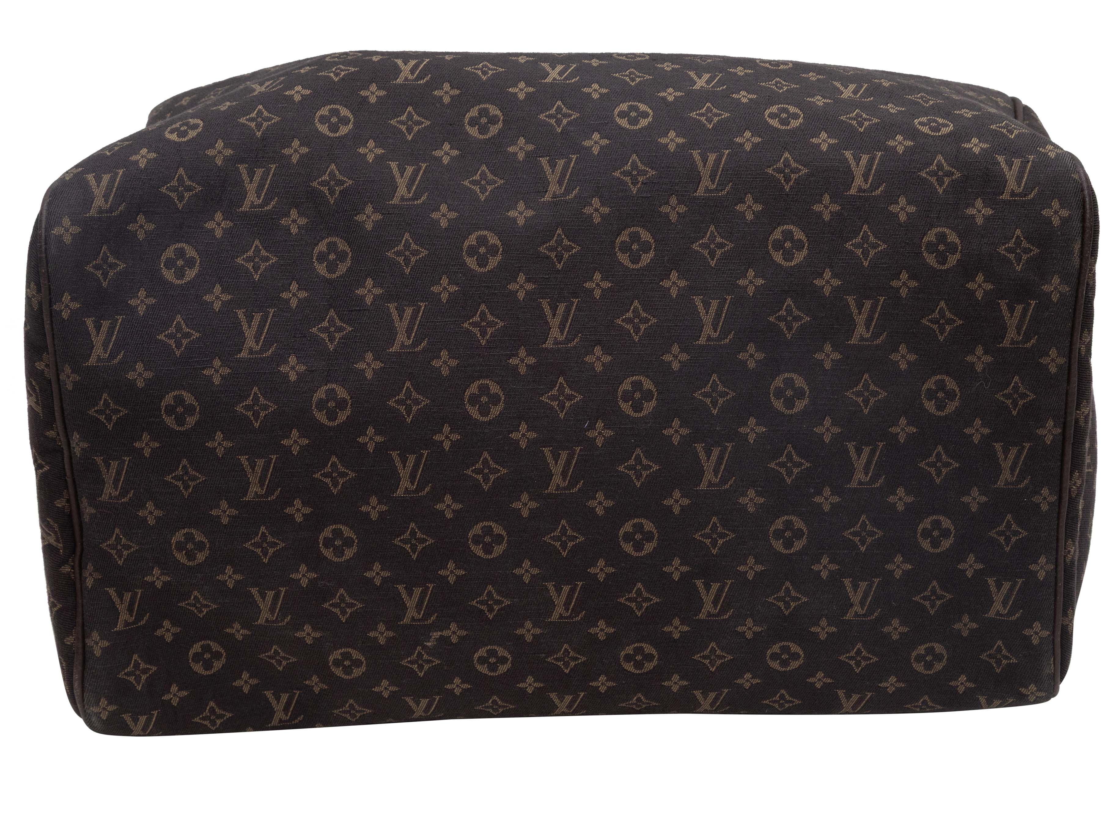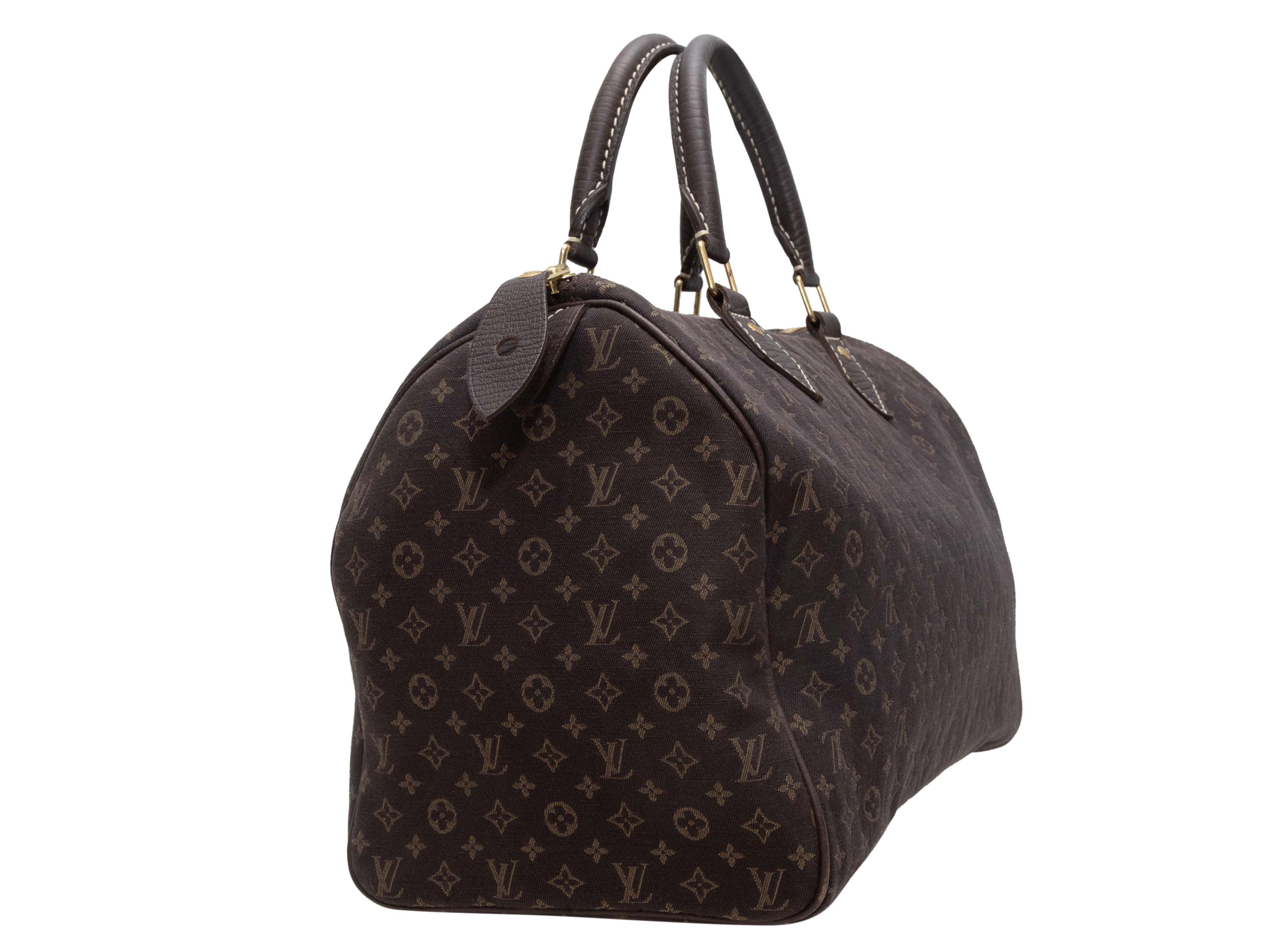 Product Details: Brown & Tan Louis Vuitton Mini Lin Speedy Bag. The Mini Lin Speedy Bag features a monogram canvas body, leather trim, gold-tone hardware, dual rolled top handles, and a top zip closure. 9.5" L x 12" H x 6.5" D, 5" handle drop.