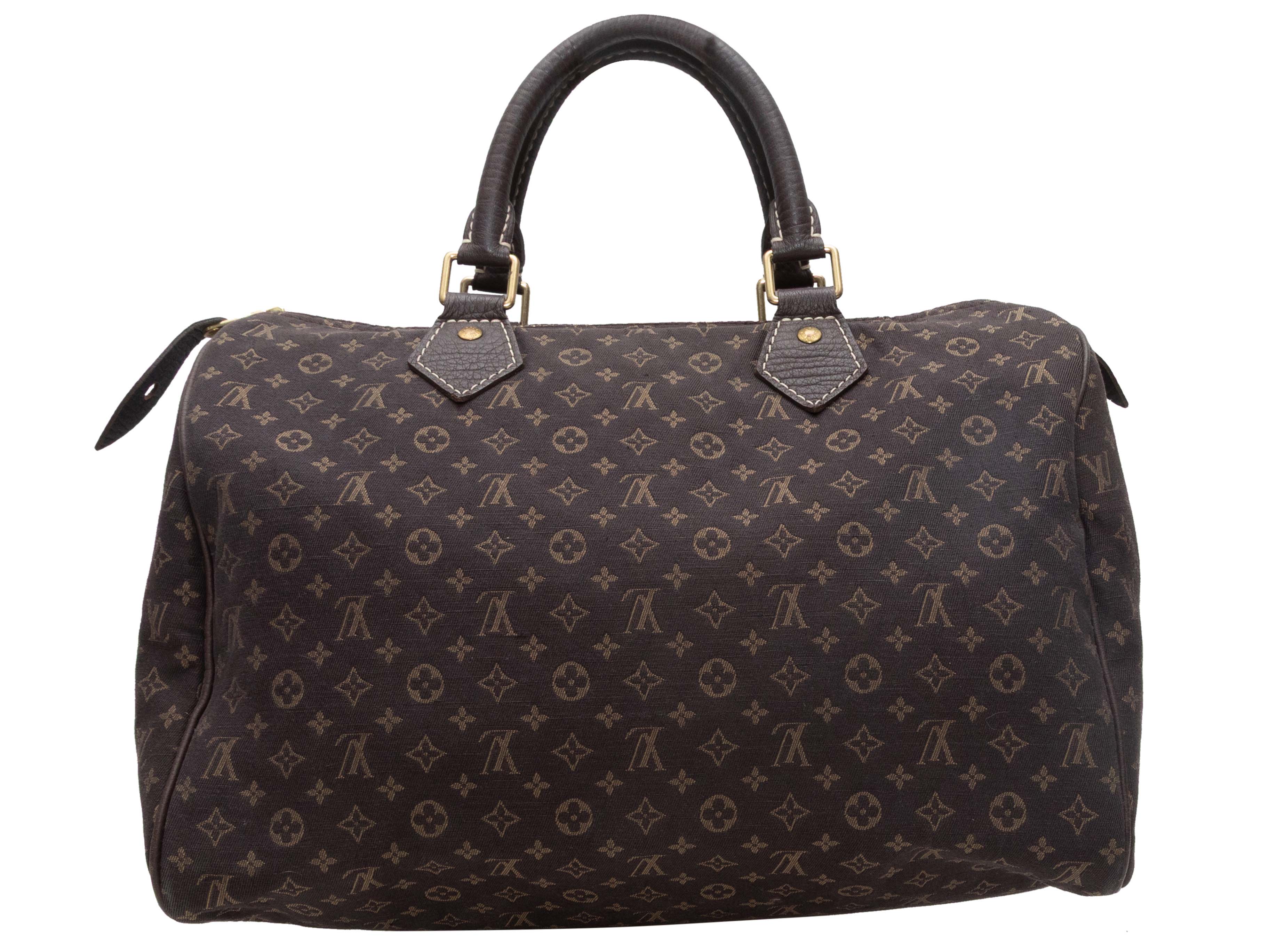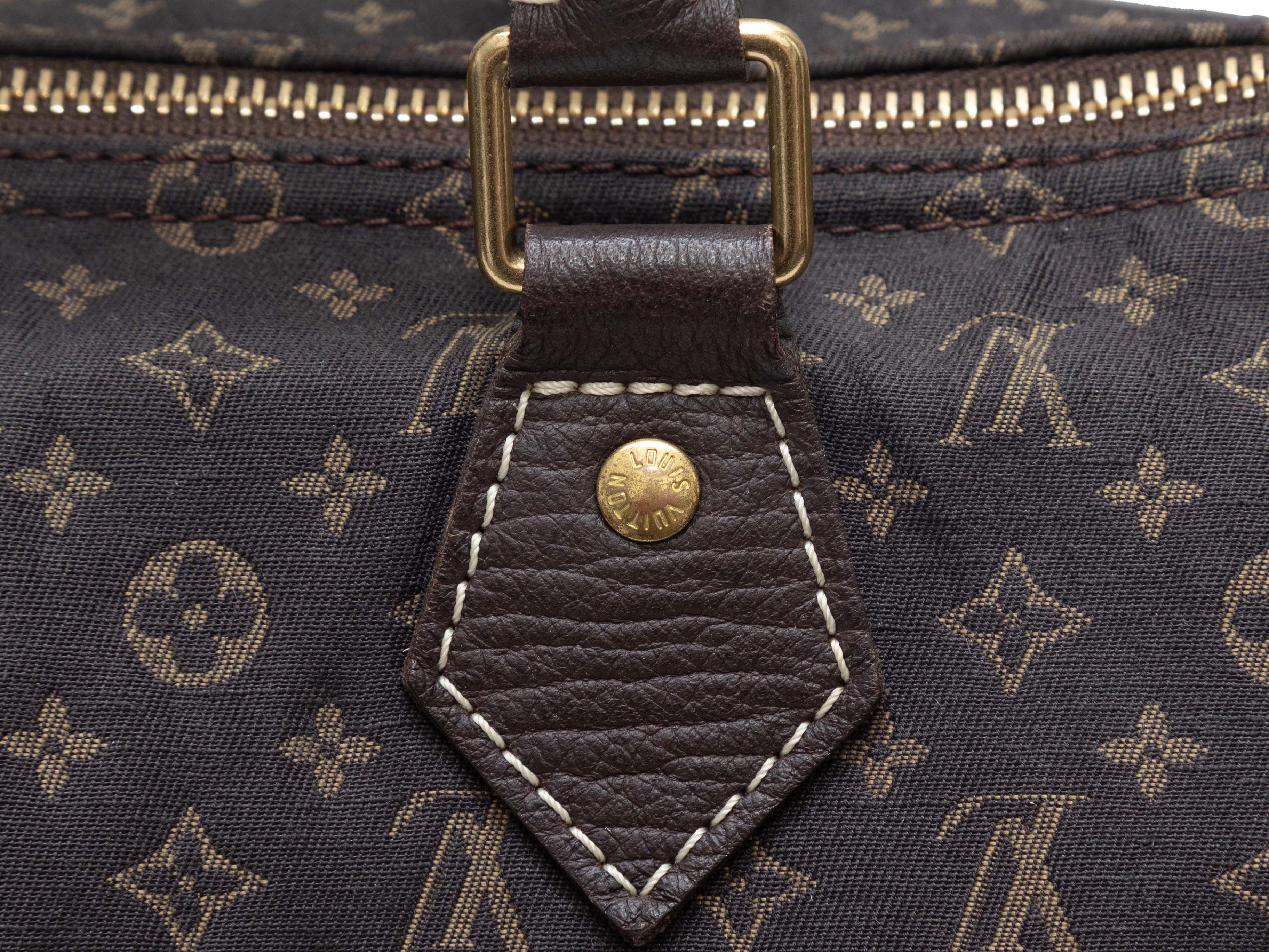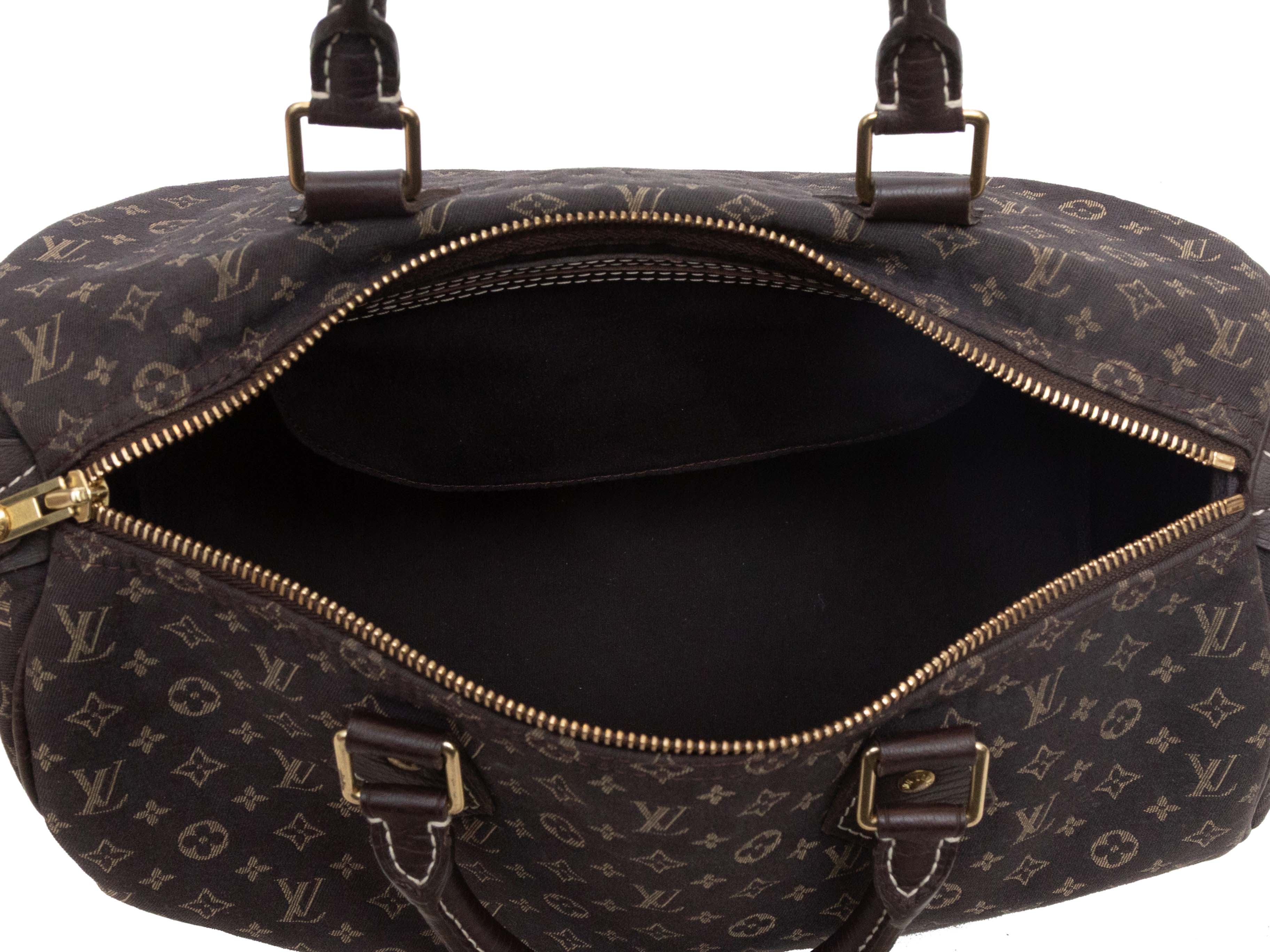 Product Details: Brown & Tan Louis Vuitton Mini Lin Speedy Bag. The Mini Lin Speedy Bag features a monogram canvas body, leather trim, gold-tone hardware, dual rolled top handles, and a top zip closure. 9.5" L x 12" H x 6.5" D, 5" handle drop.