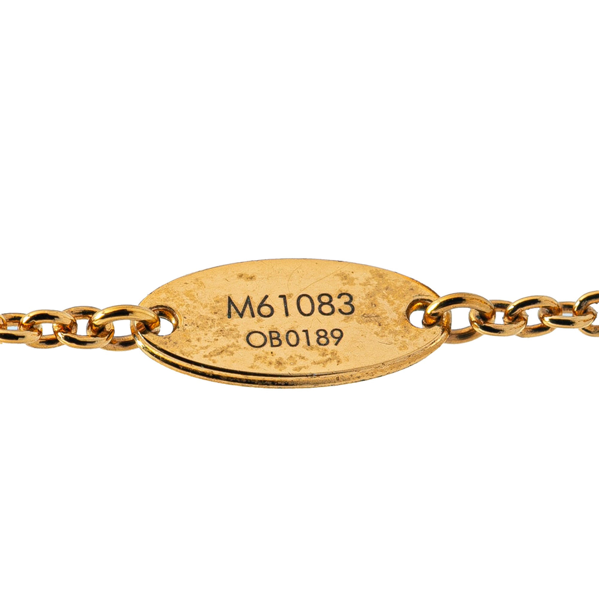 Product Details: Gold Louis Vuitton Gold Plated Essential V Necklace. This necklace features a gold-plated metal body and a lobster claw clasp closure. 18.5" L x 0.6" W x 0" D. Serial number OB0189.