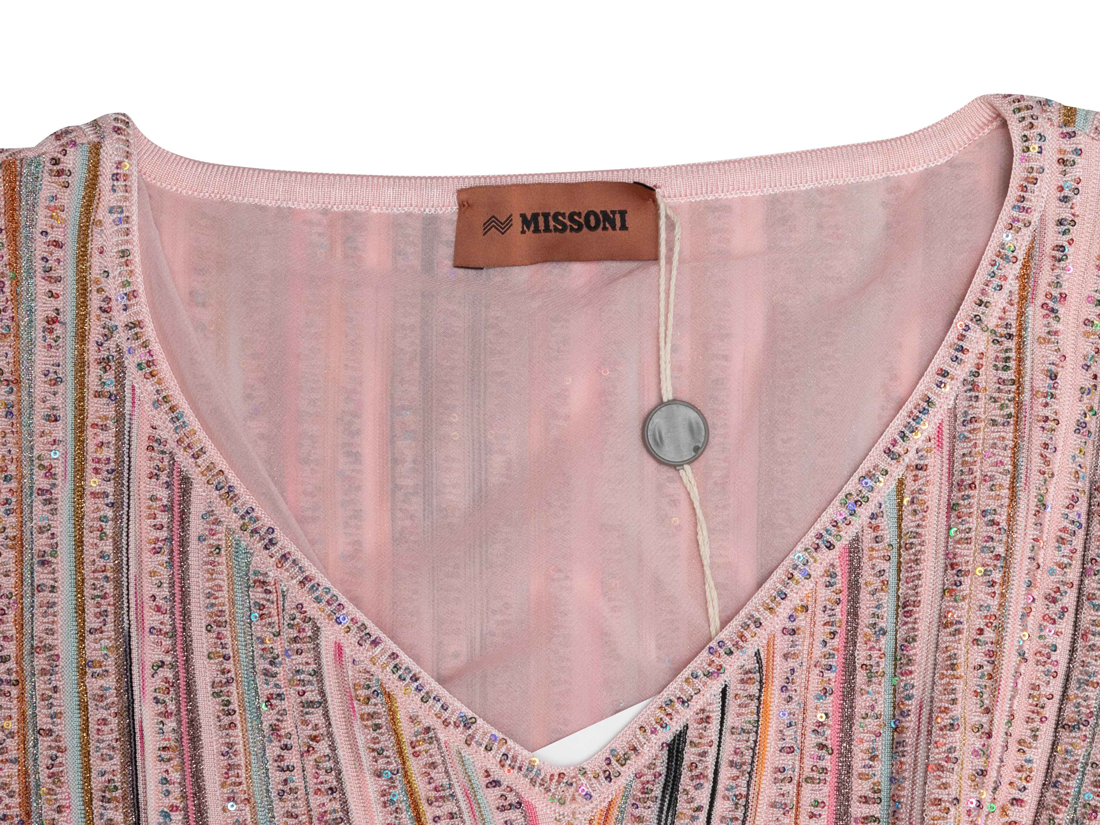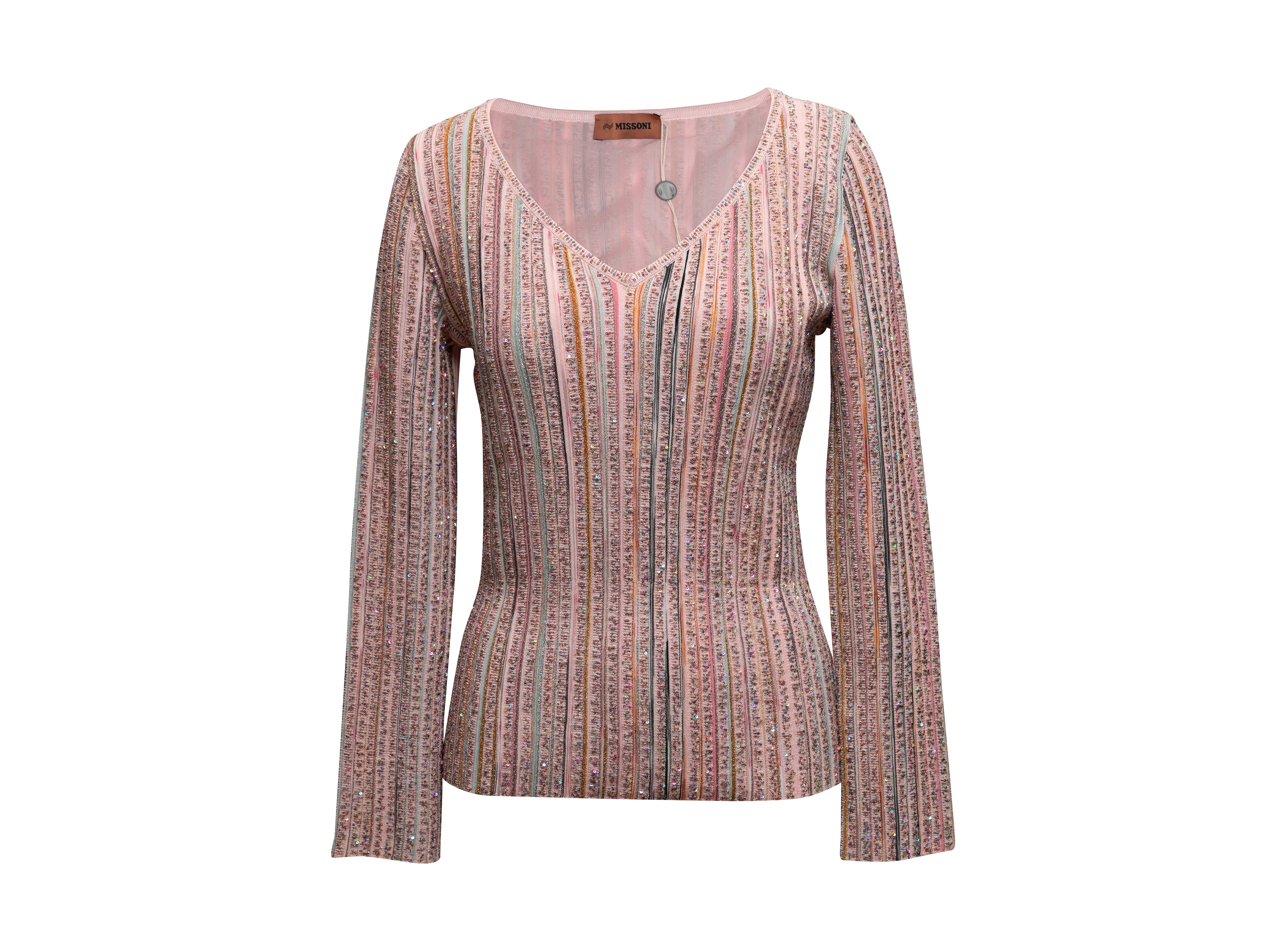 Product Details: Light pink and multicolor striped sequin-embellished sweater by Missoni. V-neck. 30" bust, 16" shoulder width, 22" length.