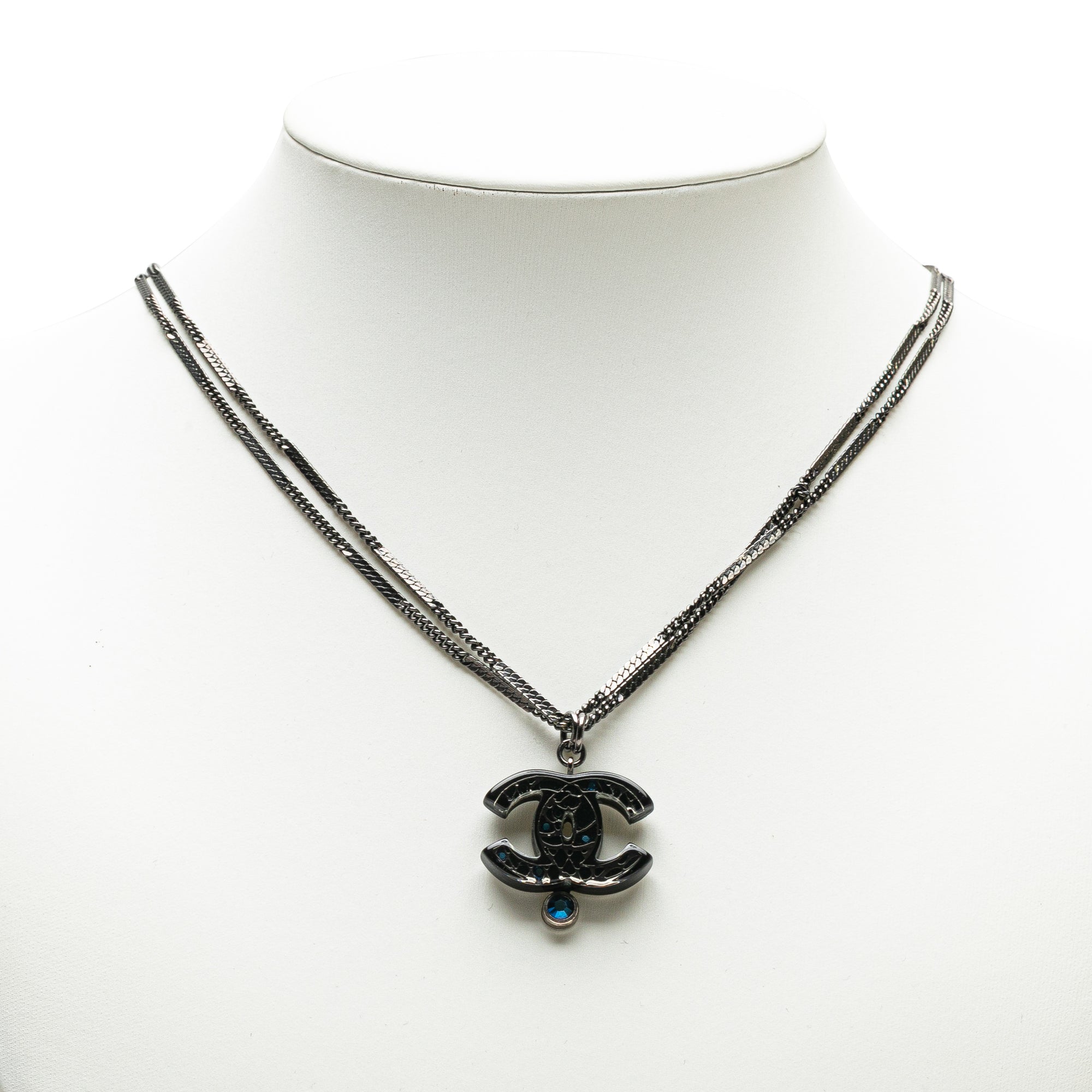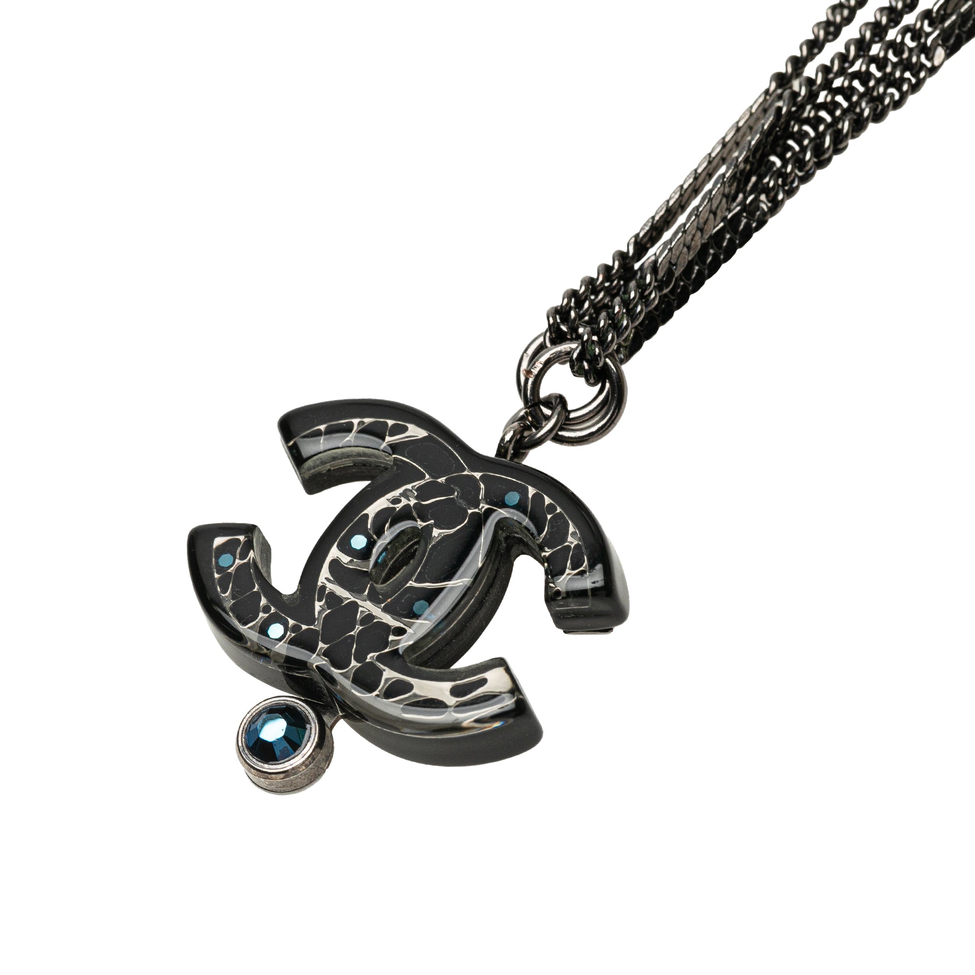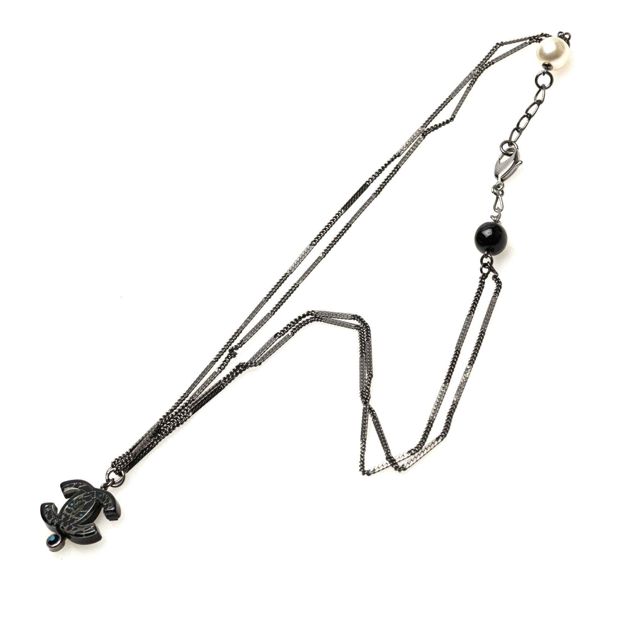 Product Details: Black Chanel Ruthenium Resin Faux Pearl and Crystal Double Chain Necklace. This necklace features a ruthenium body, CC resin with crystal pendant, crystal and faux pearl details, and lobster clasp closure. 24.6" L x 1.2" W x 0" D. Serial number 06A.