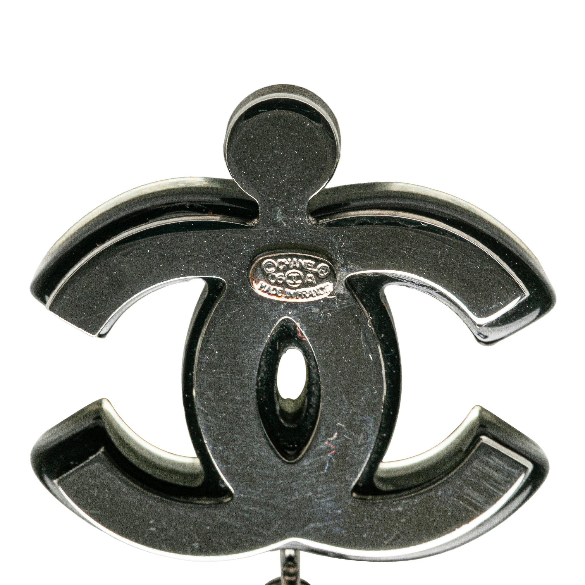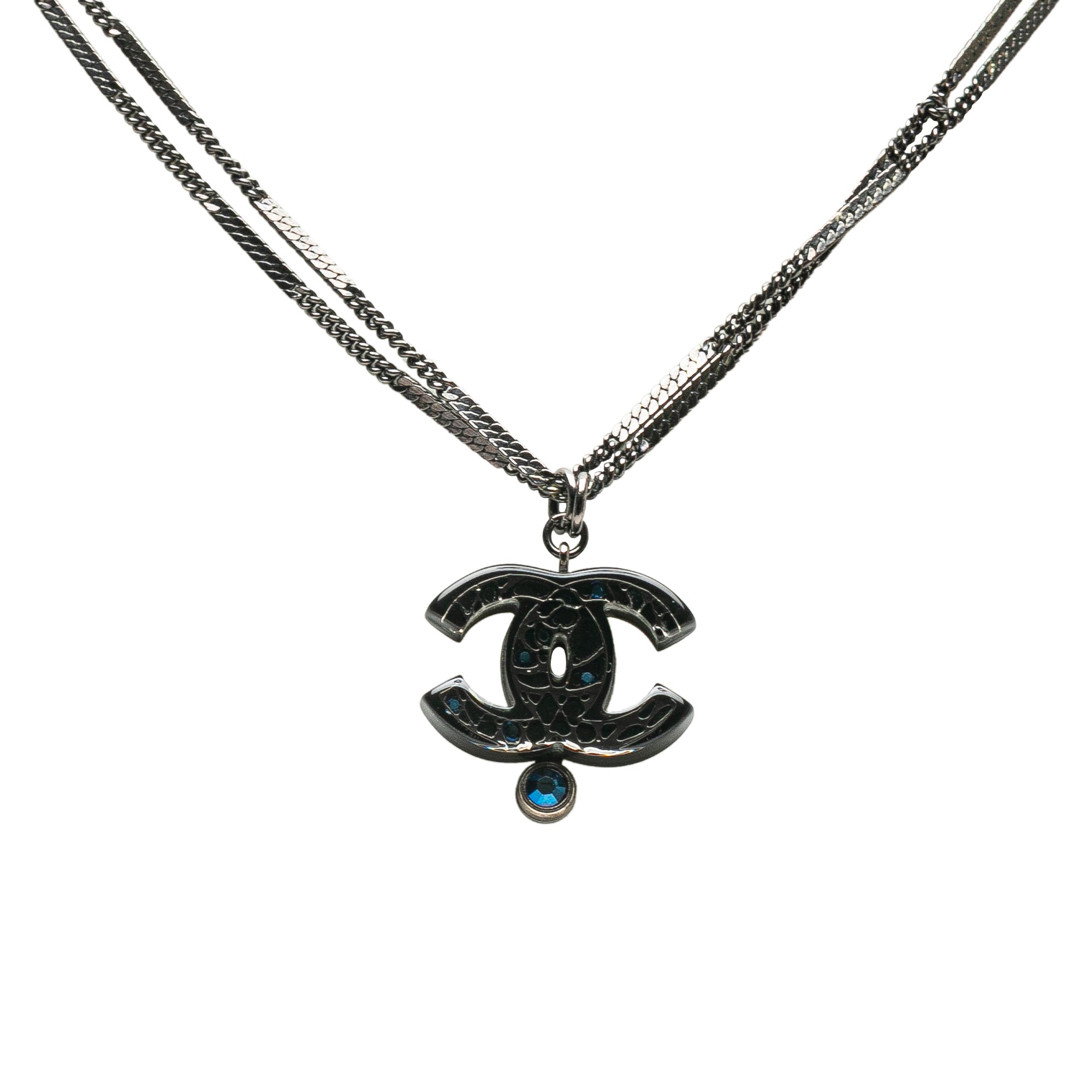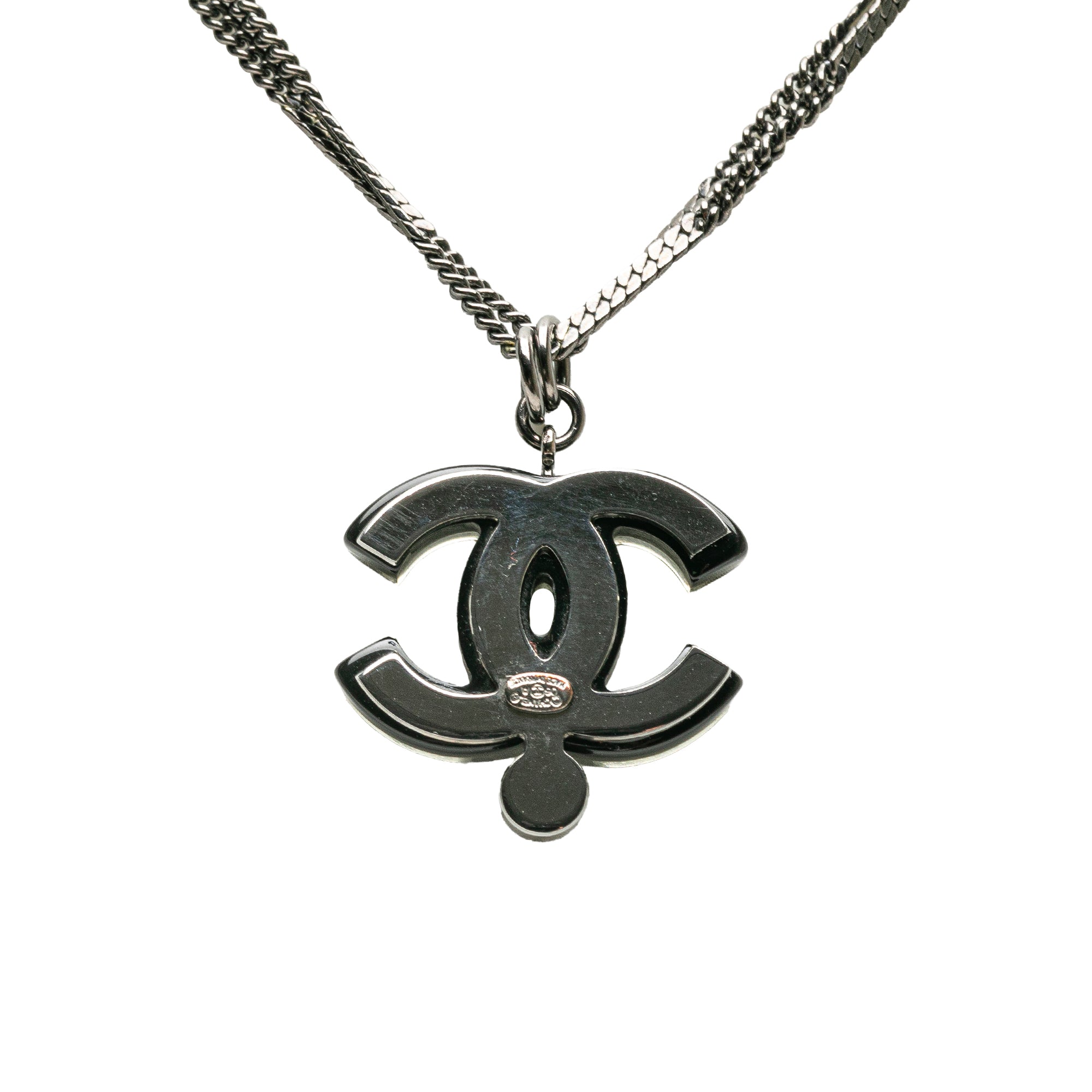Product Details: Black Chanel Ruthenium Resin Faux Pearl and Crystal Double Chain Necklace. This necklace features a ruthenium body, CC resin with crystal pendant, crystal and faux pearl details, and lobster clasp closure. 24.6" L x 1.2" W x 0" D. Serial number 06A.