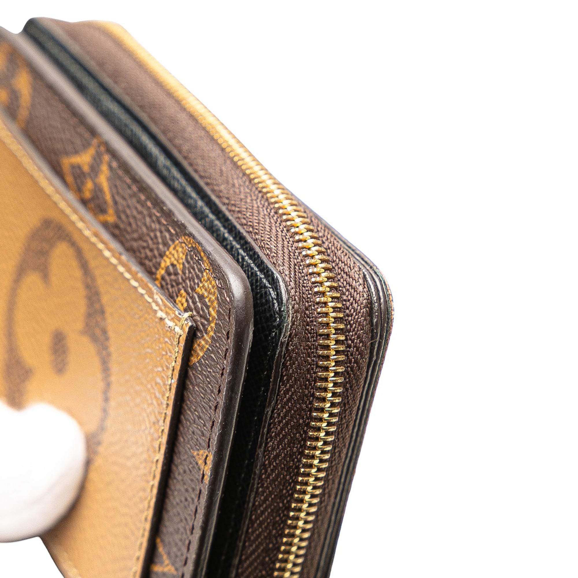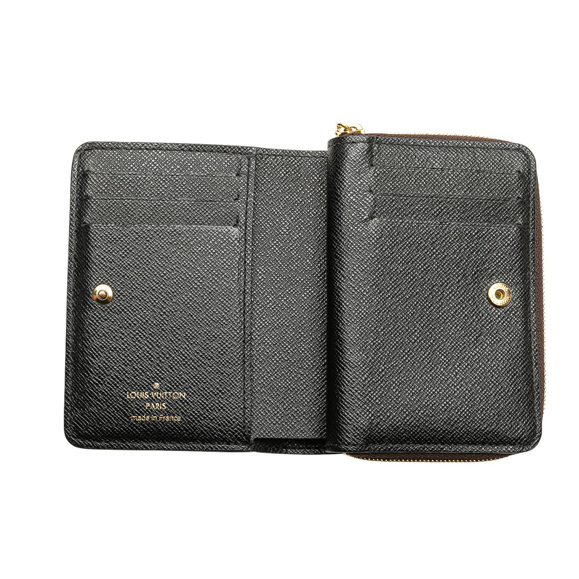 Product Details: Brown Louis Vuitton Monogram Bifold Lou Wallet. The Lou wallet features monogram and monogram reverse canvas body, a coin compartment with a zip-around closure, a flap with a press stud closure, an exterior slip pocket, and interior slip pockets. 3.3" L x 4.5" W x 1" D.