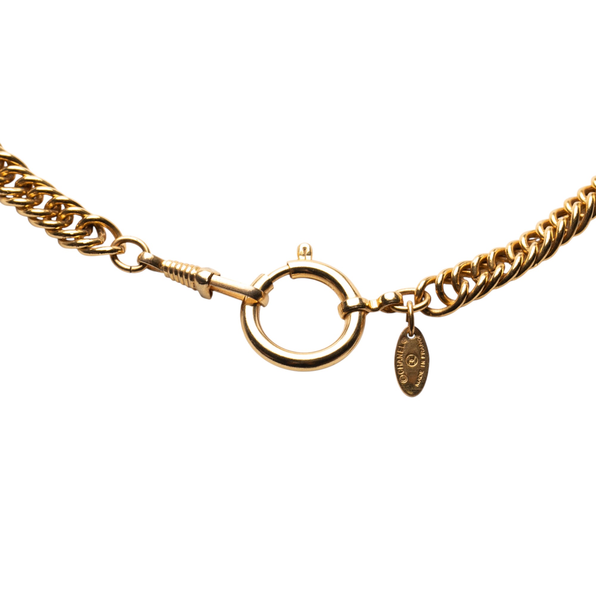 Product Details: Gold Chanel Gold Plated Loupe Magnifying Glass Pendant Necklace. This necklace features a gold-tone pendant and chain, and a spring ring closure. 33.5" L x 2.8" W x 0" D.