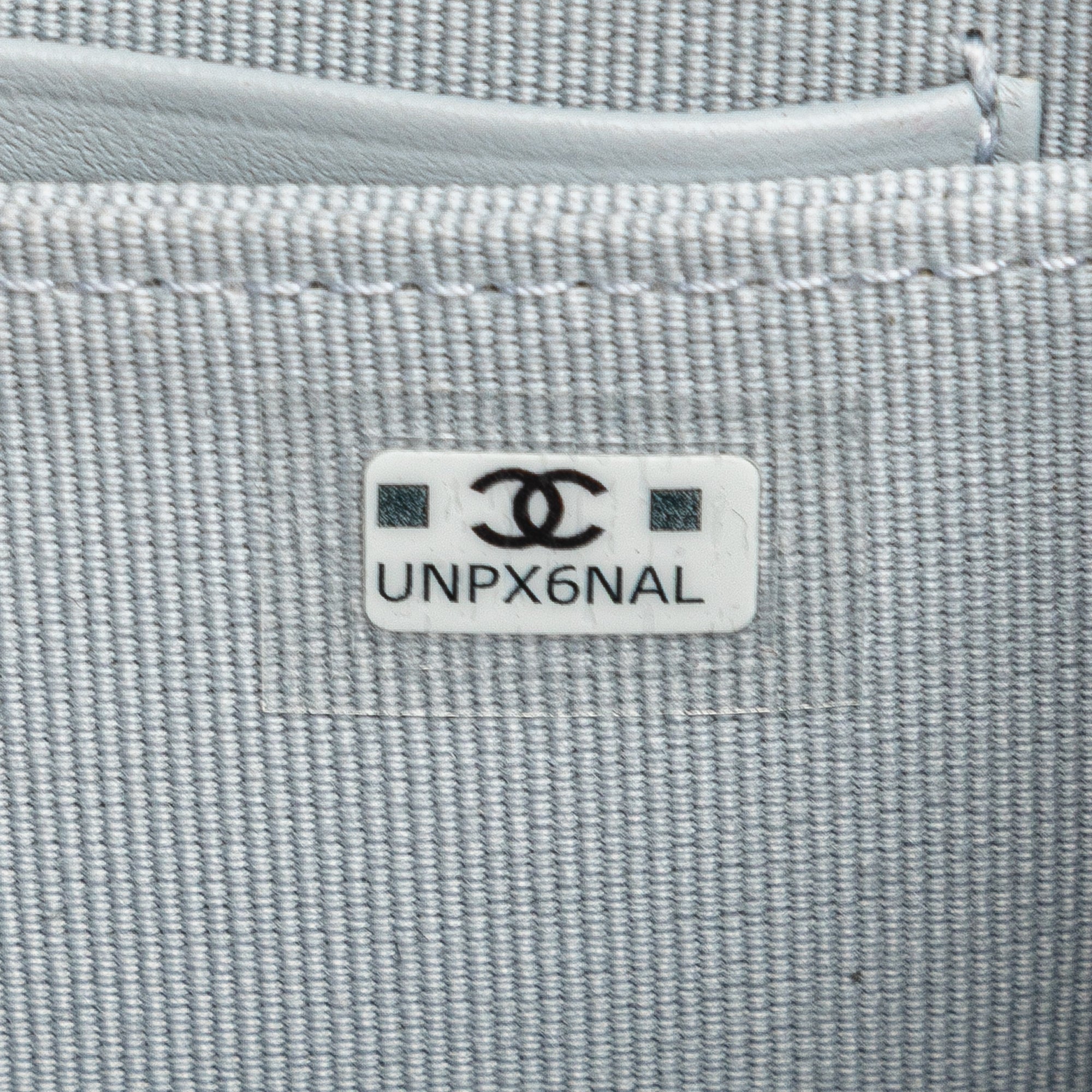 Product Details: Gray Chanel CC Quilted Calfskin Zip Wallet. This wallet features a leather body, a zip around closure, an exterior back slip pocket, and interior slip pockets. 3.7" L x 5.1" W x 0.8" D. Serial number UNPX6NAL.