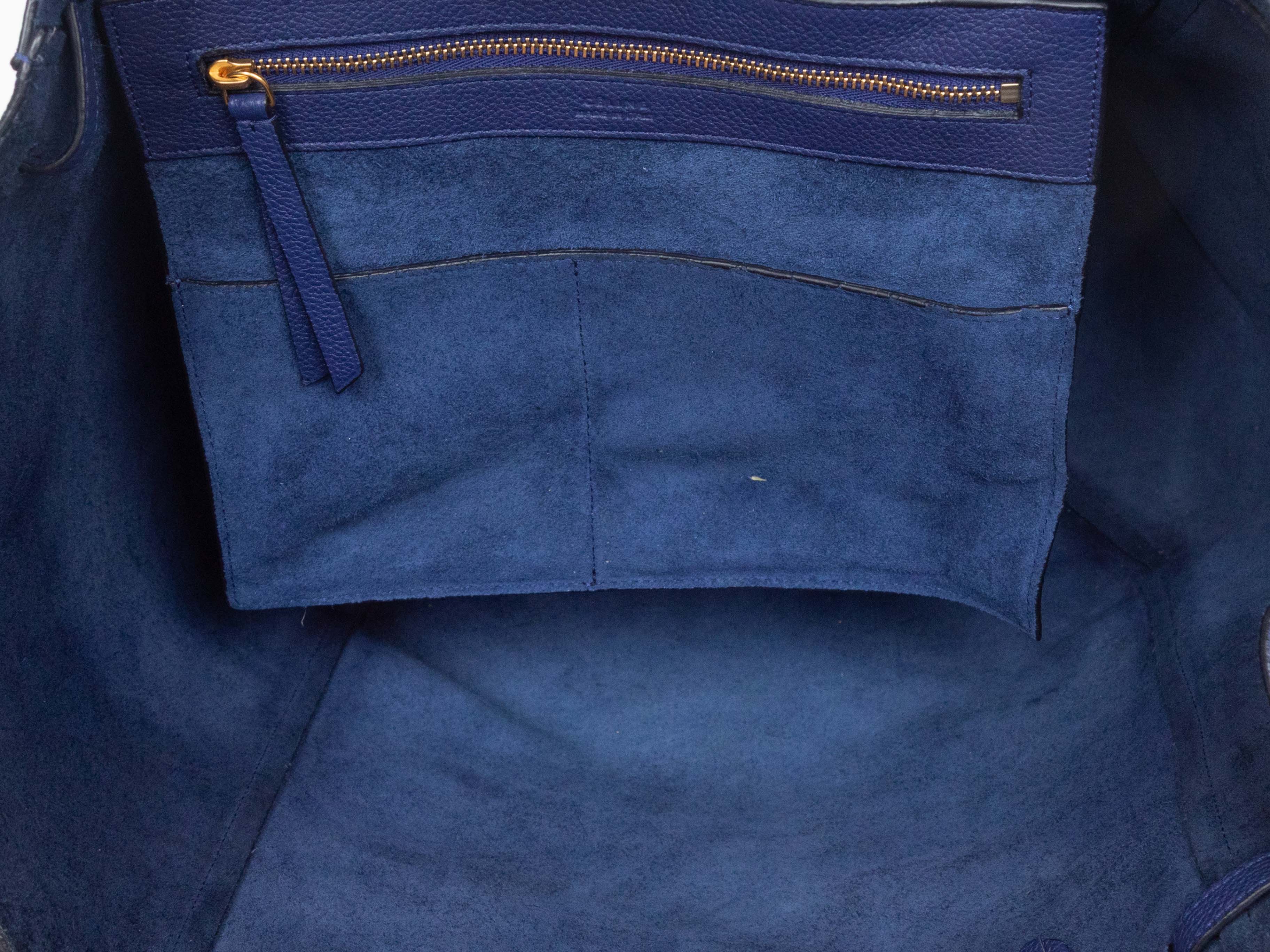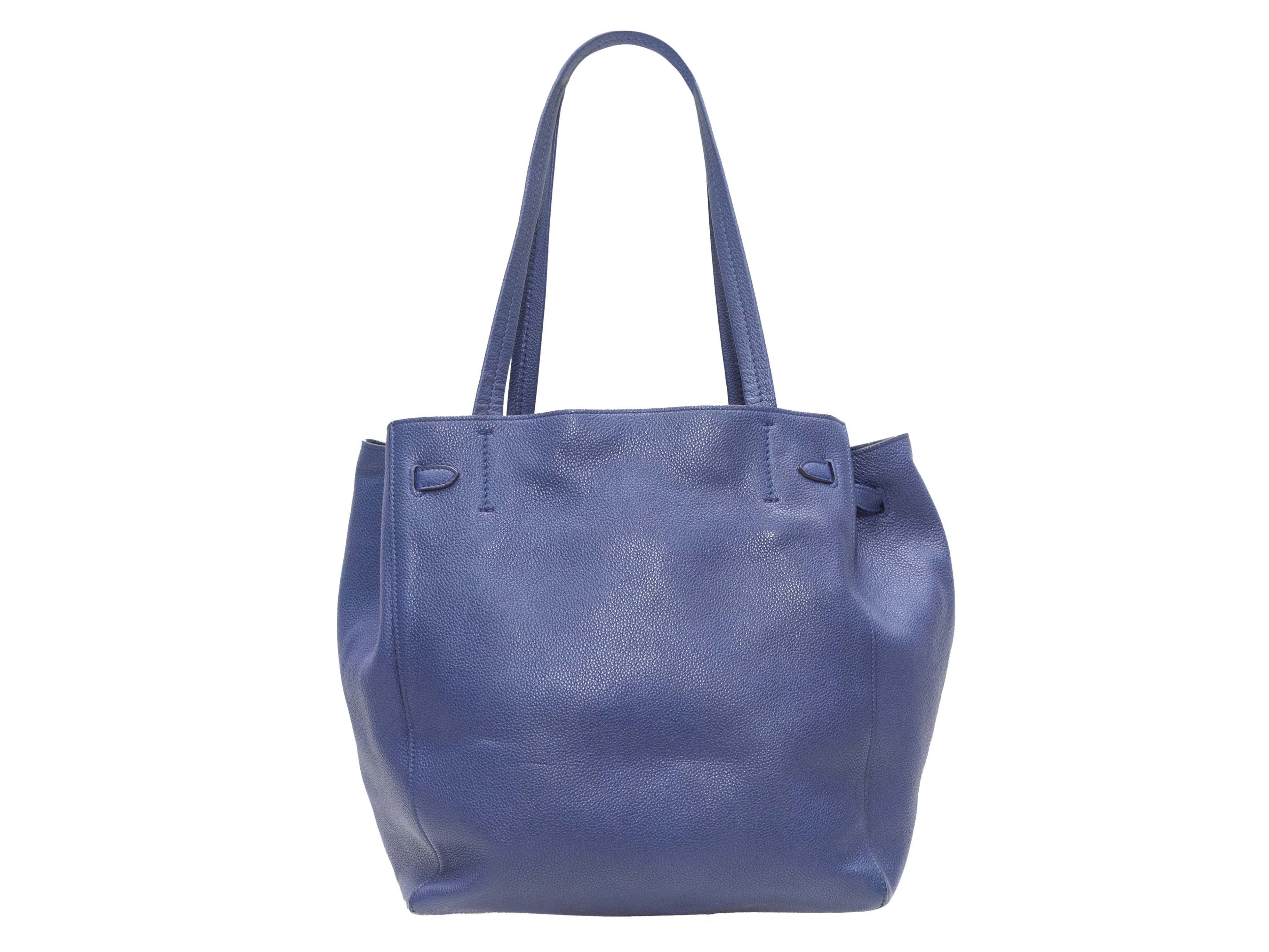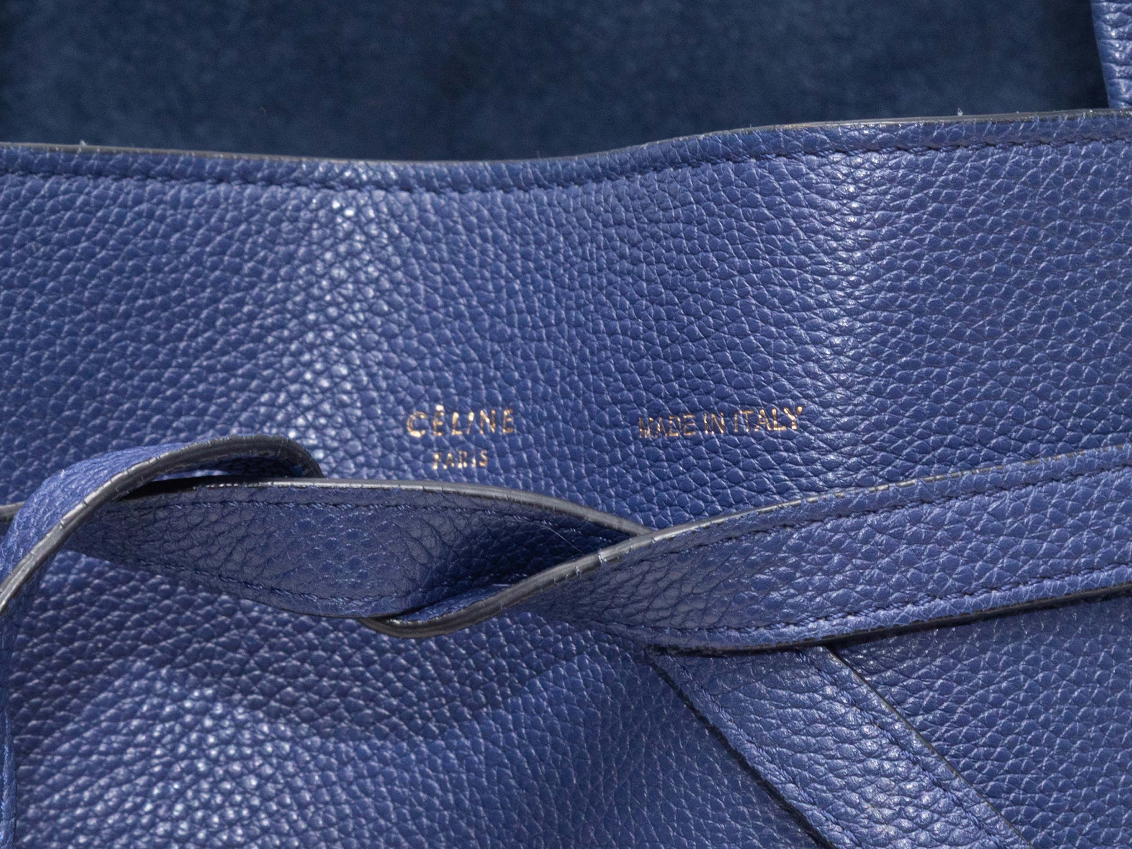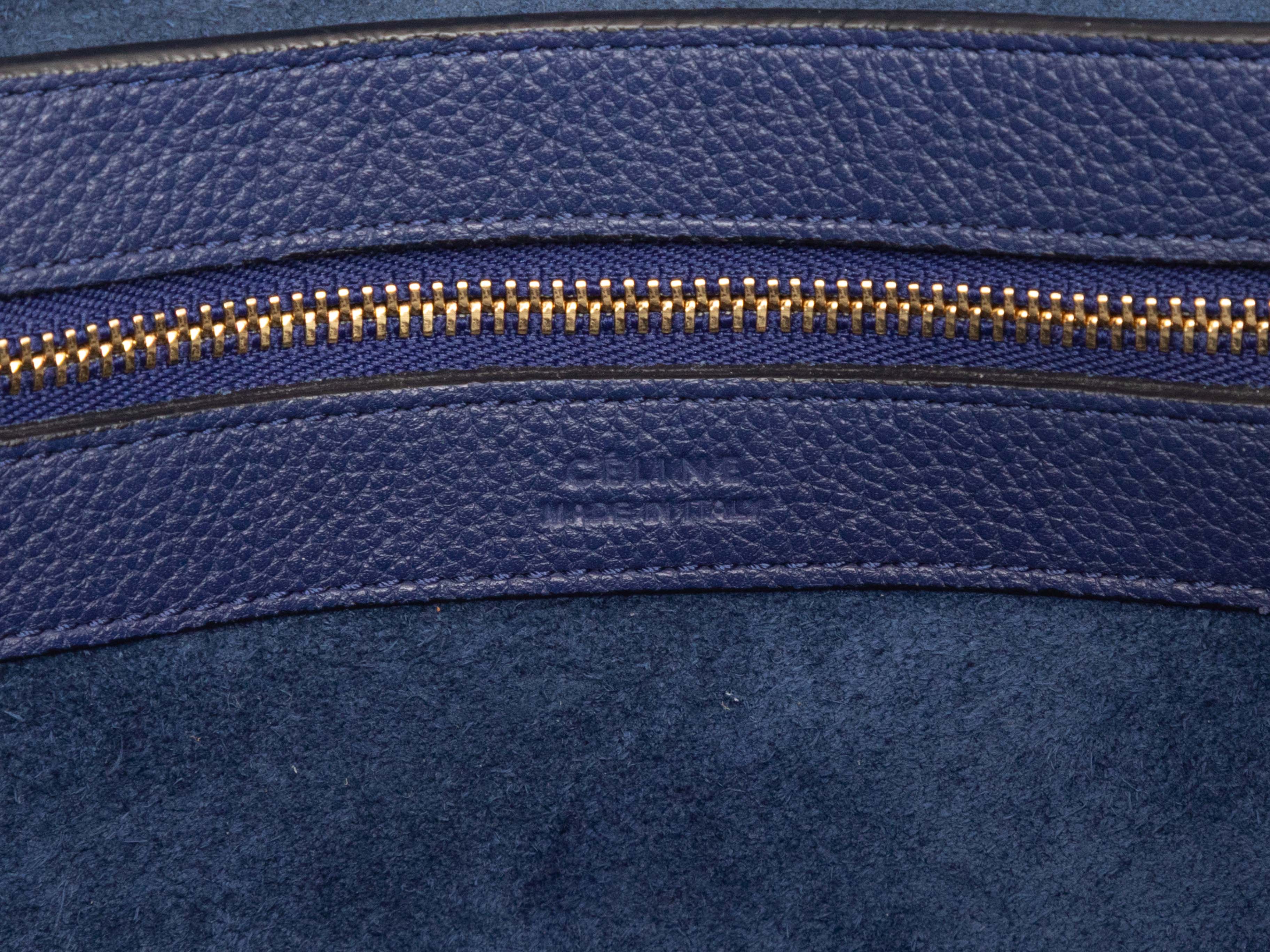 Product Details: Navy Celine Cabas Phantom Tote. The Cabas Phantom Tote features a leather body, gold-tone hardware, and dual flat shoulder straps. 10.5" L x 10.5" H x 7.5" D, 9" shoulder strap drop.