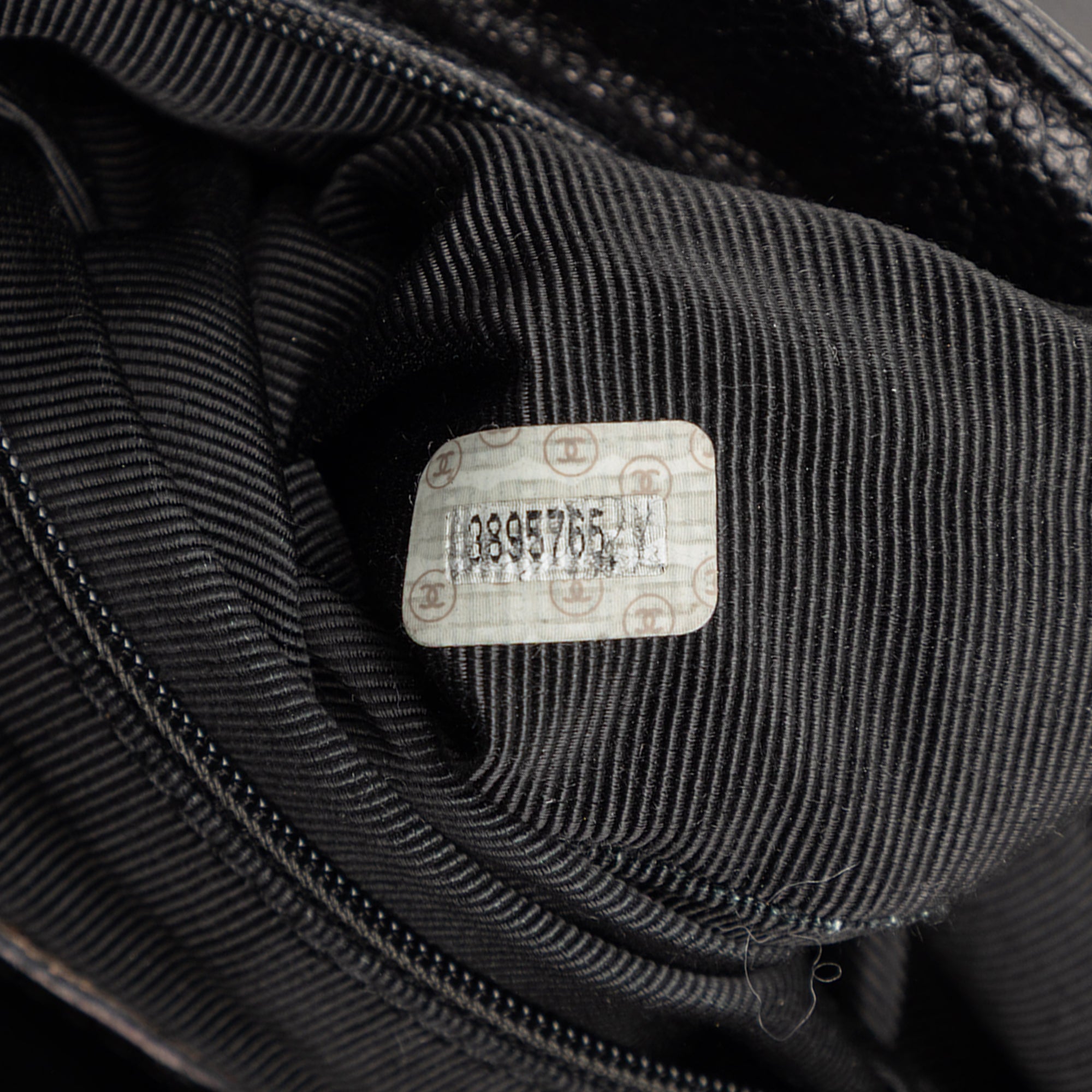 Product Details: Black Chanel Caviar Triple CC Backpack. This backpack features a caviar leather body, flat leather straps, top flap with gold-tone interlocking Cs and twist lock closure, and interior zip pockets. 9.4" L x 8.3" W x 3.9" D. Serial number 3895765.