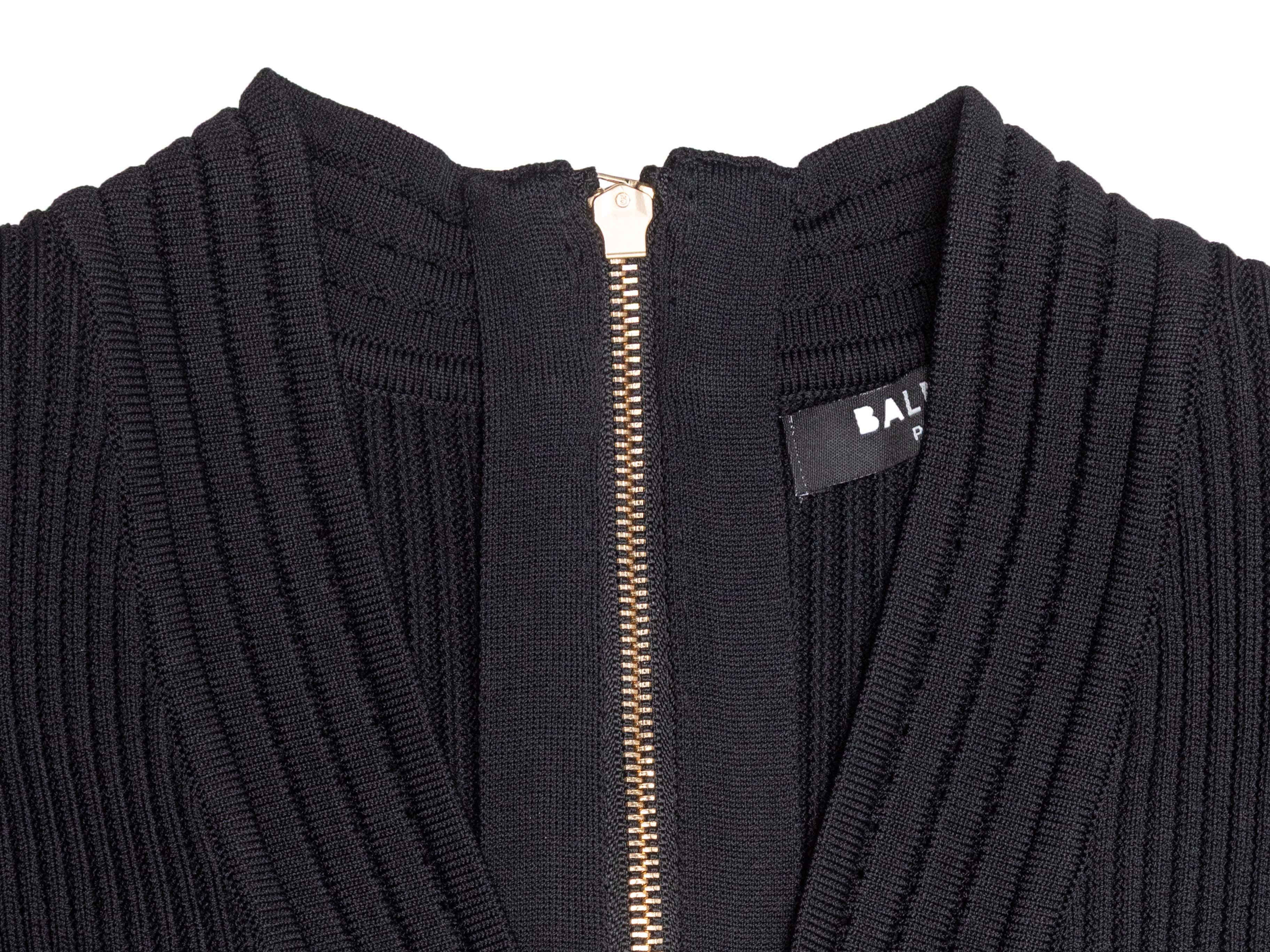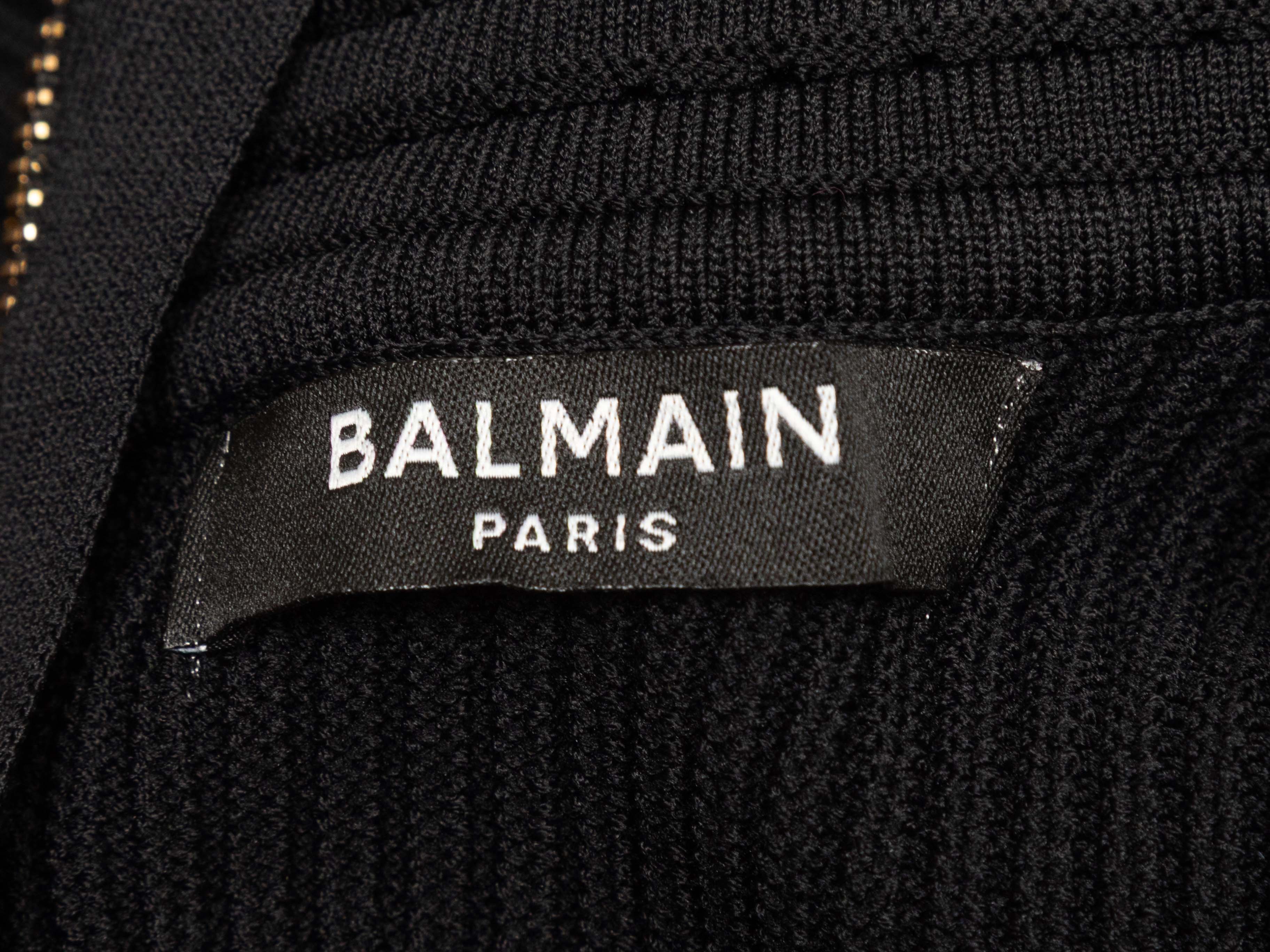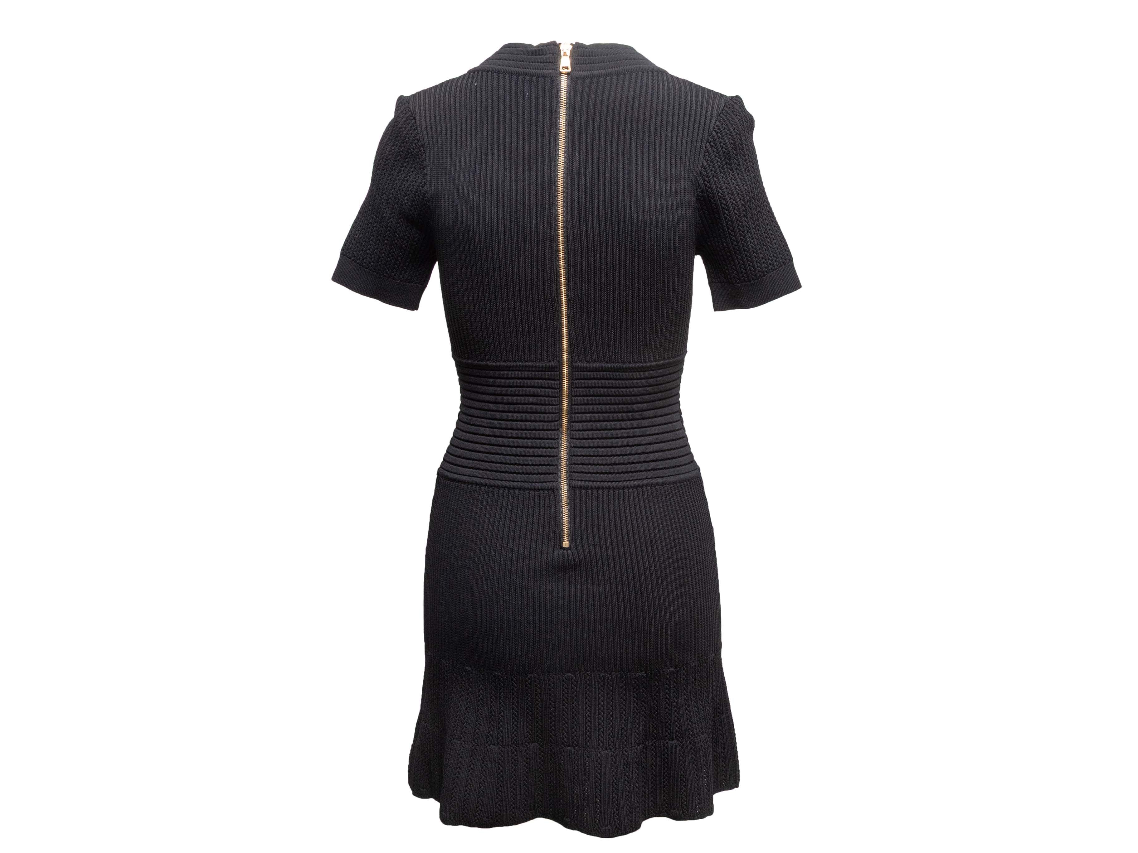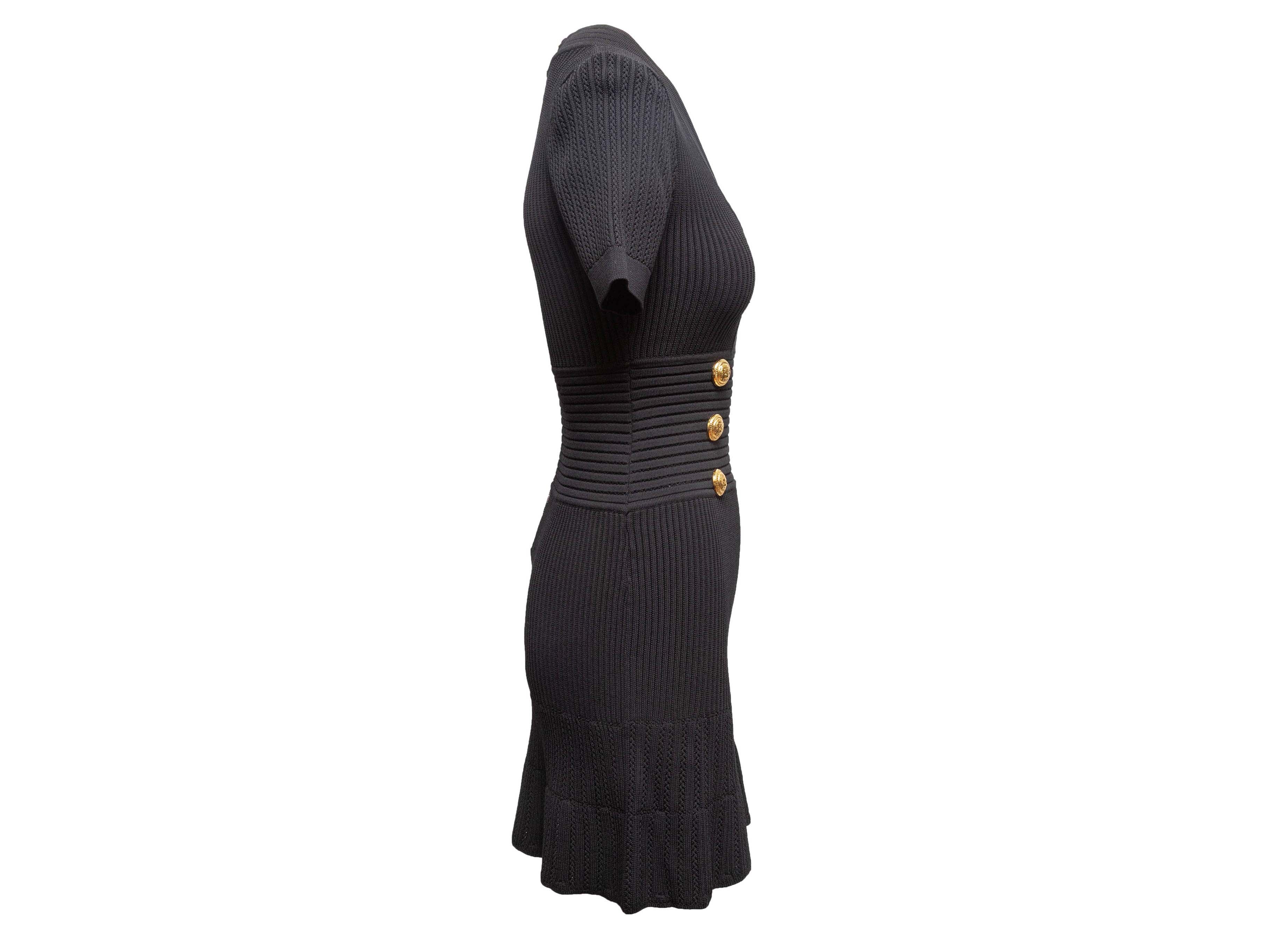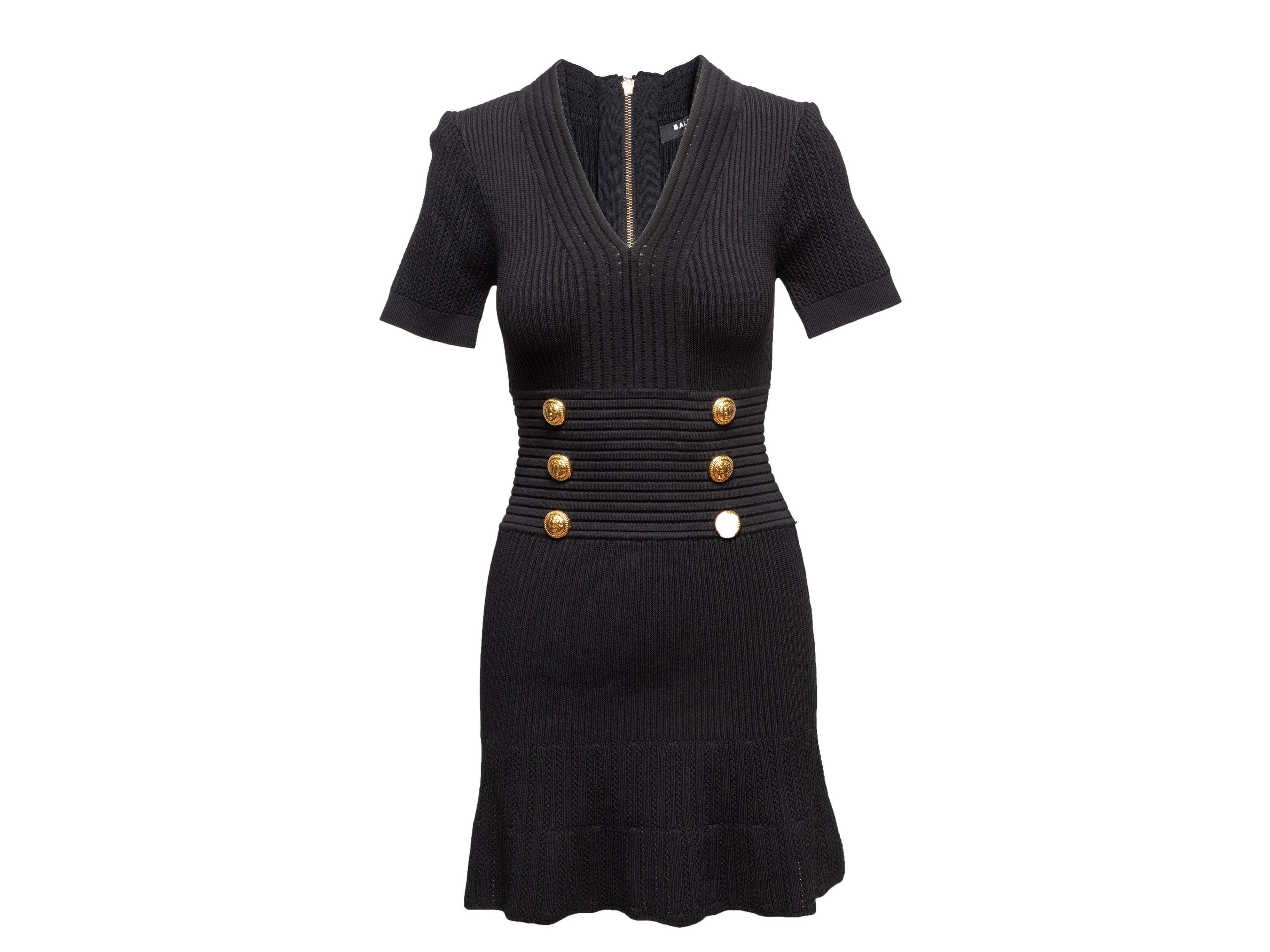 Product Details: Black short sleeve knit mini dress by Balmain. V-neck Gold-tone button accents at front bodice. Zip closure at back. 26" bust, 24" waist, 34.5" length, 13" shoulder width.