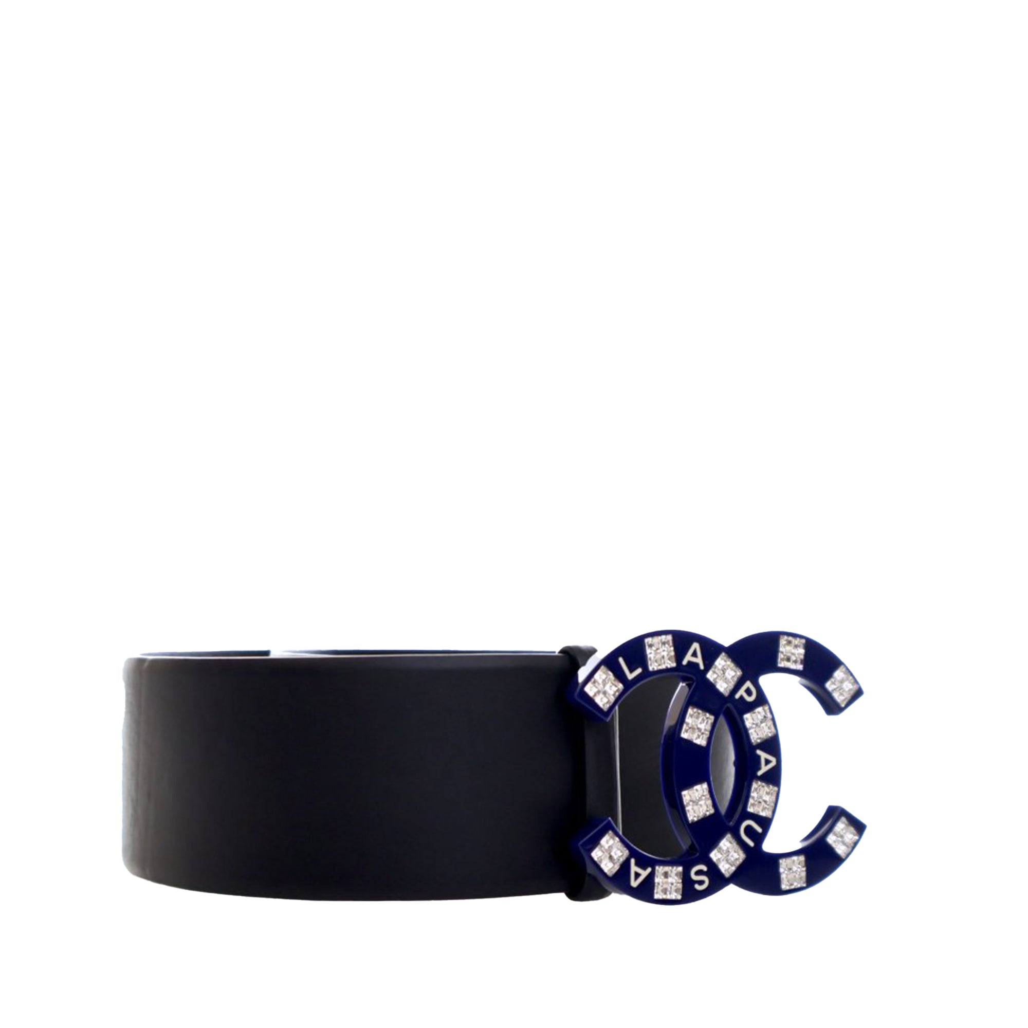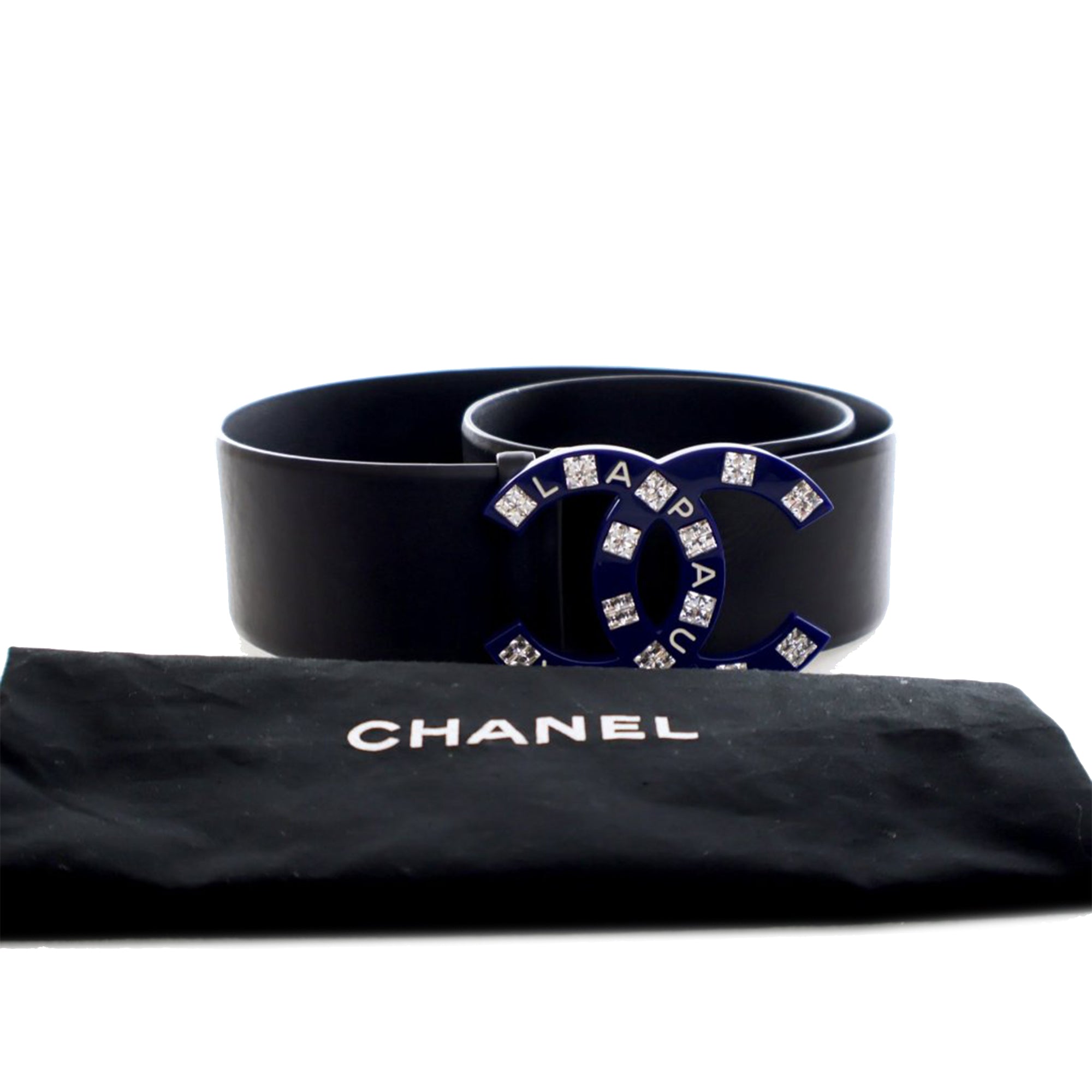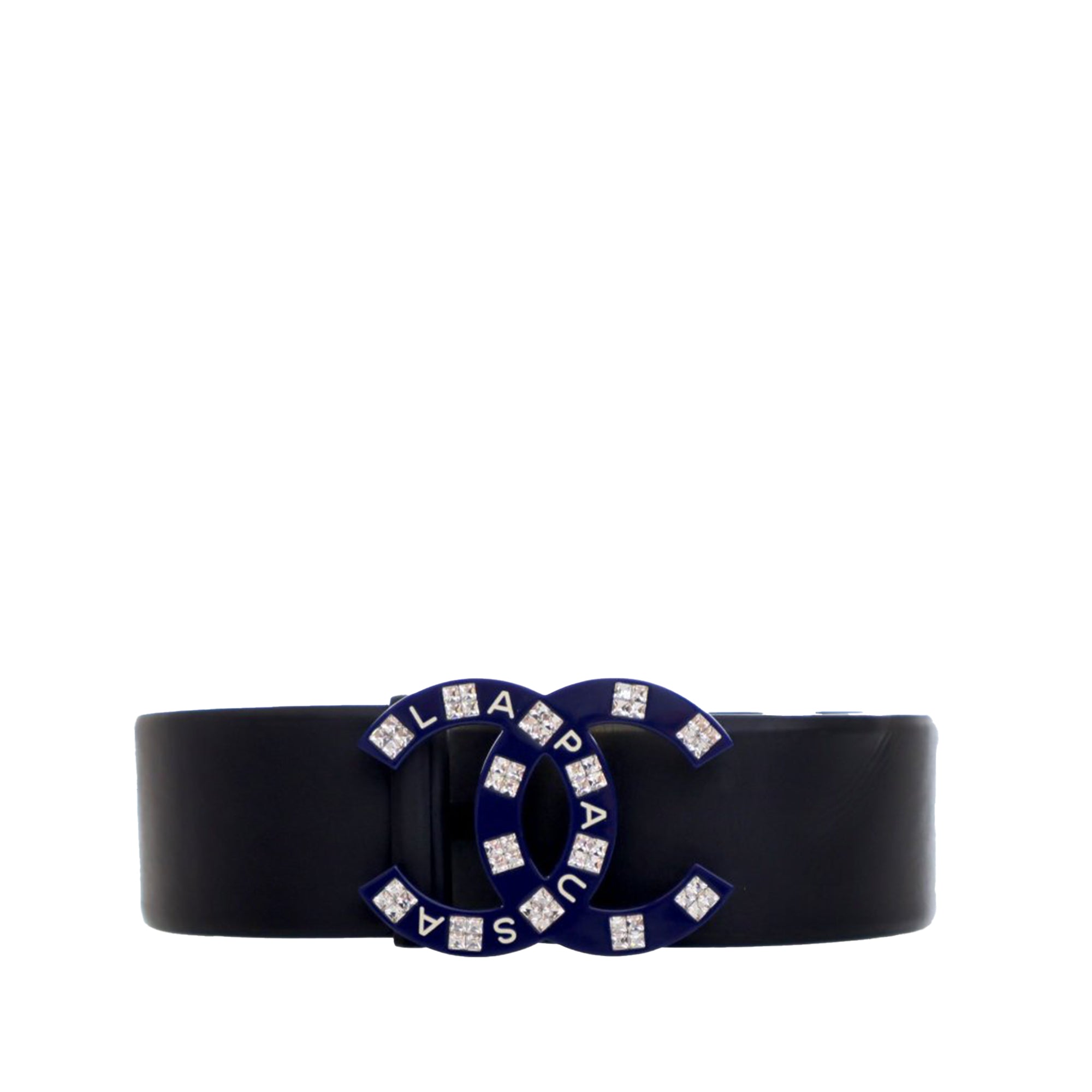 Product Details: Black Chanel Leather La Pausa CC Belt. This belt features a leather body with resin and crystals CC buckle. 13.4" L x 2" W x 0" D. Serial number B19C.