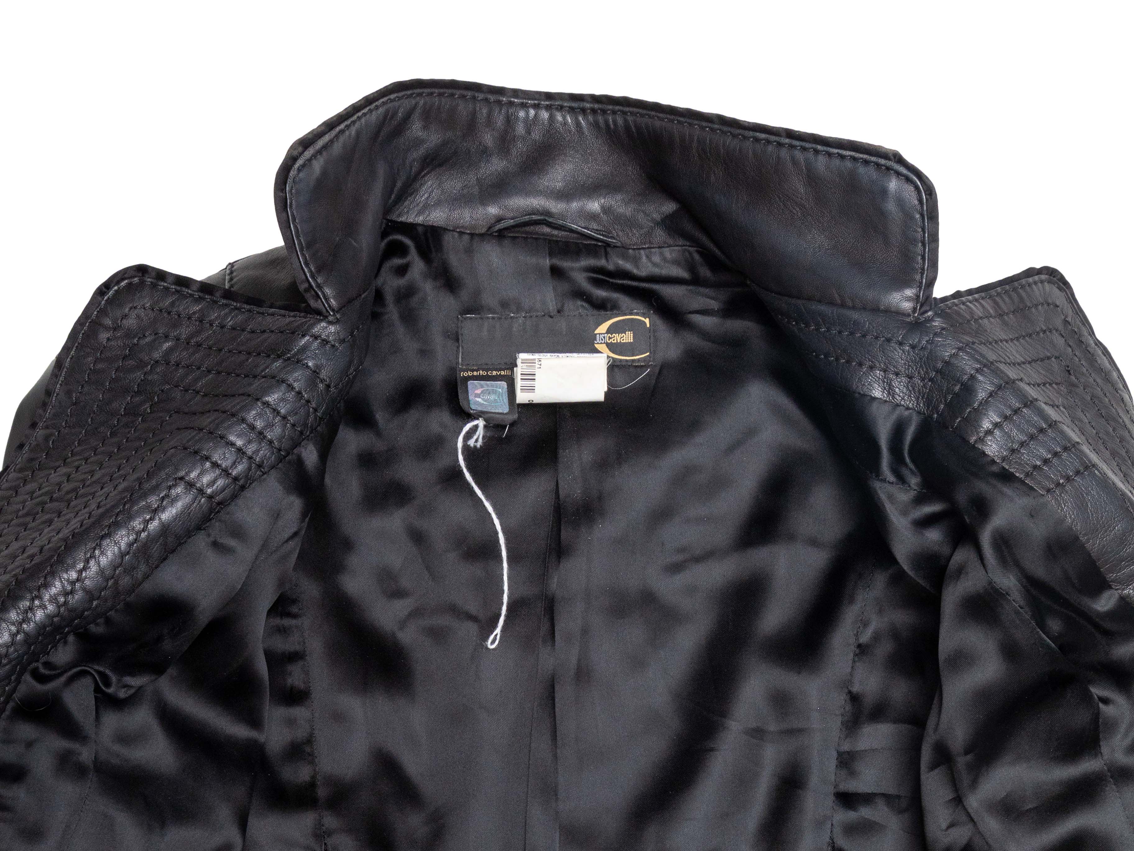 Product Details: Black leather blazer by Just Cavalli. Pointed lapel. Four front flap pockets. Front hook-and-eye closure. 34" bust, 15.5" shoulder width, 23" sleeve length, 22.5" length.